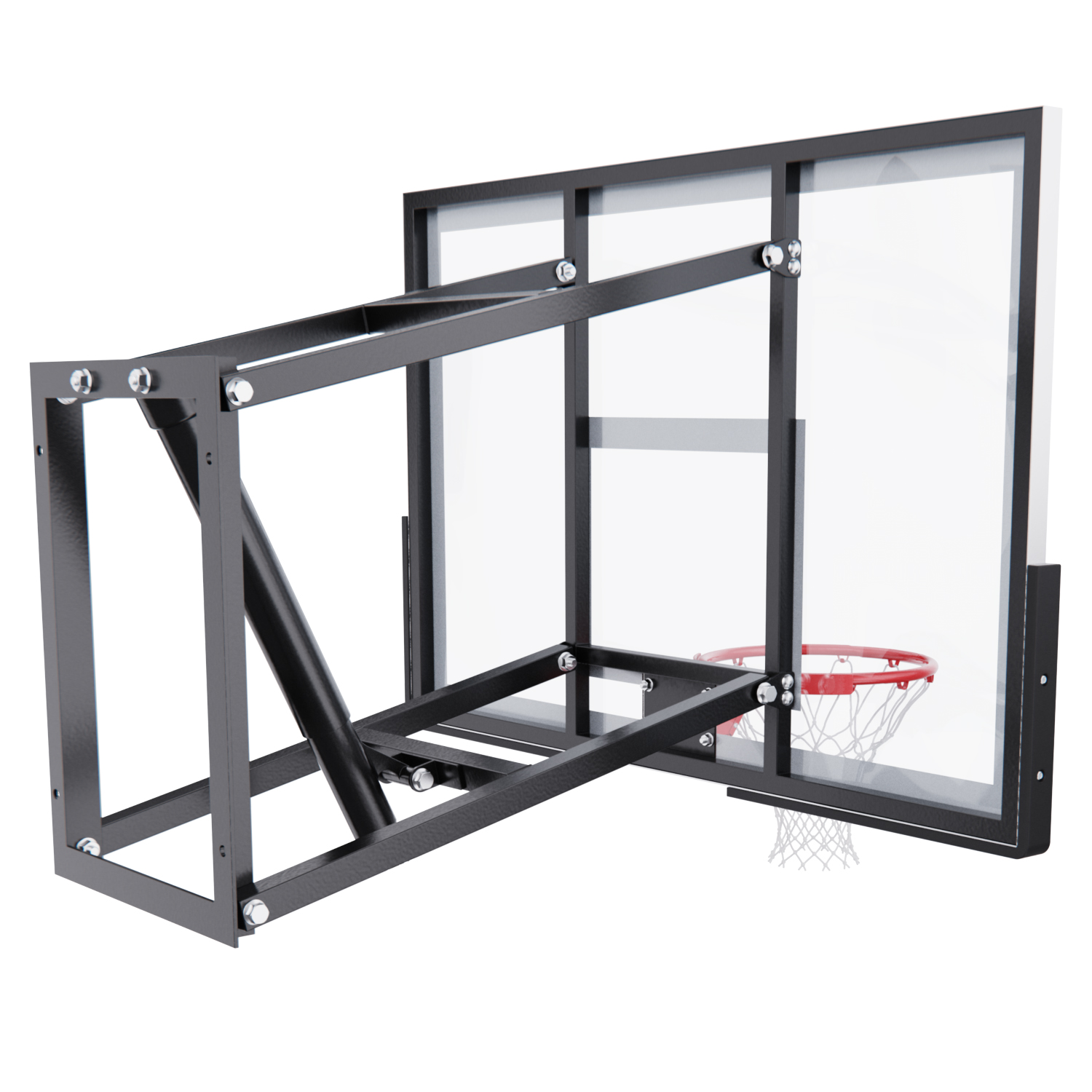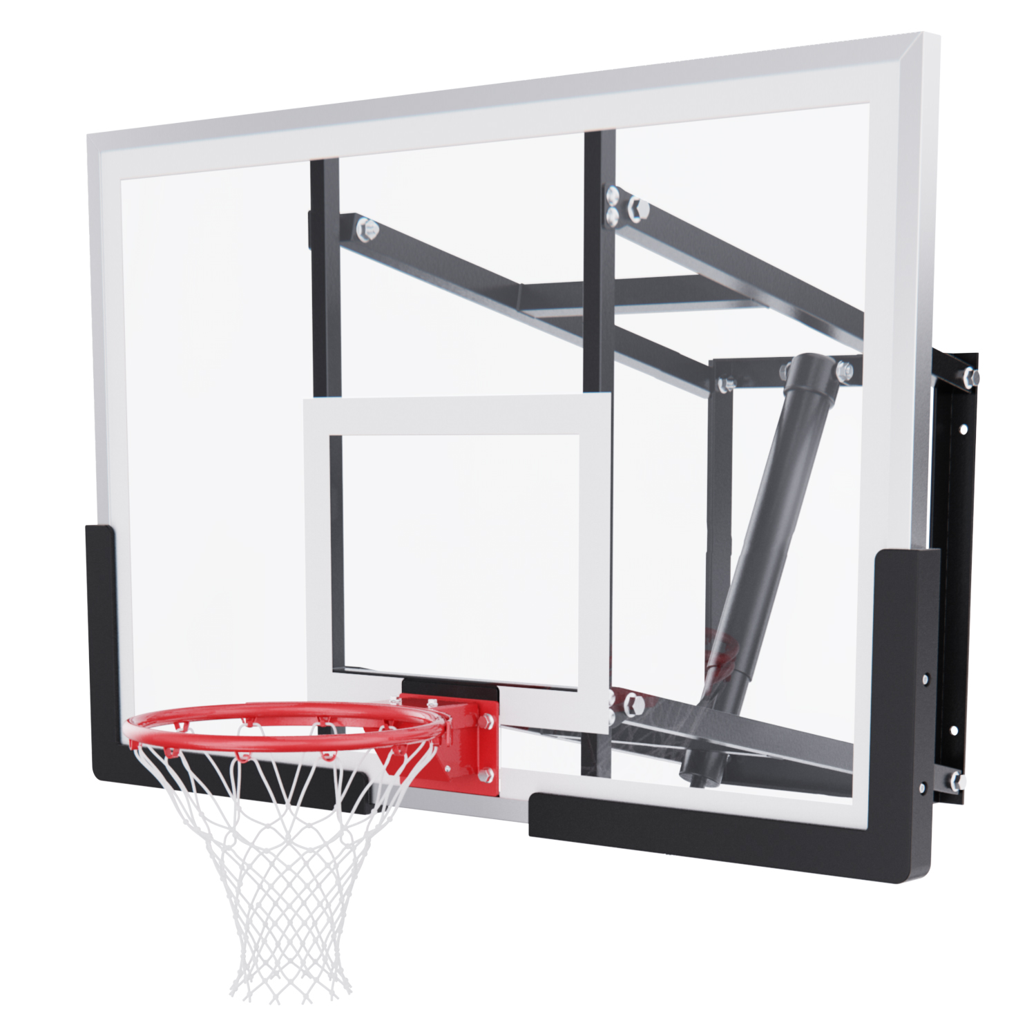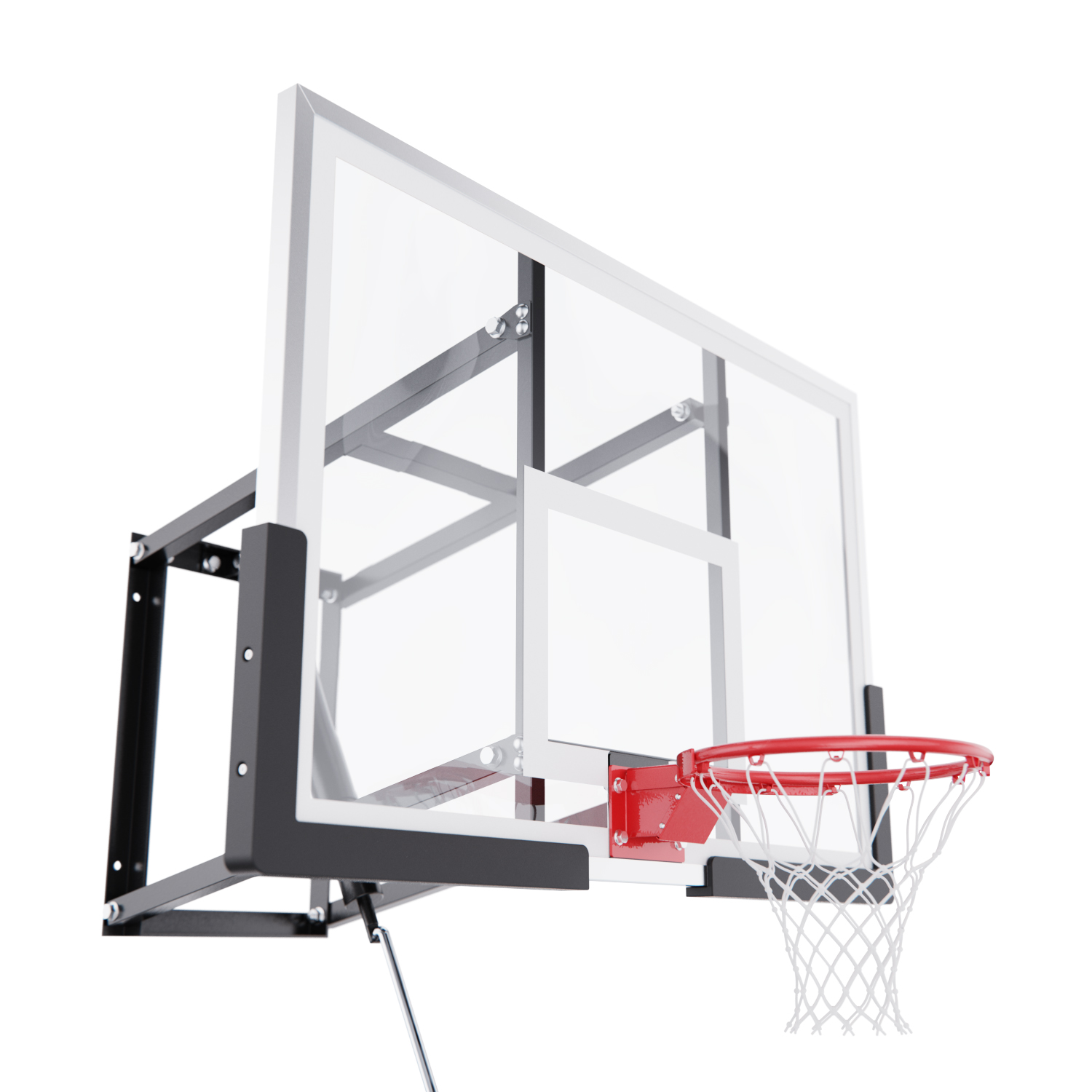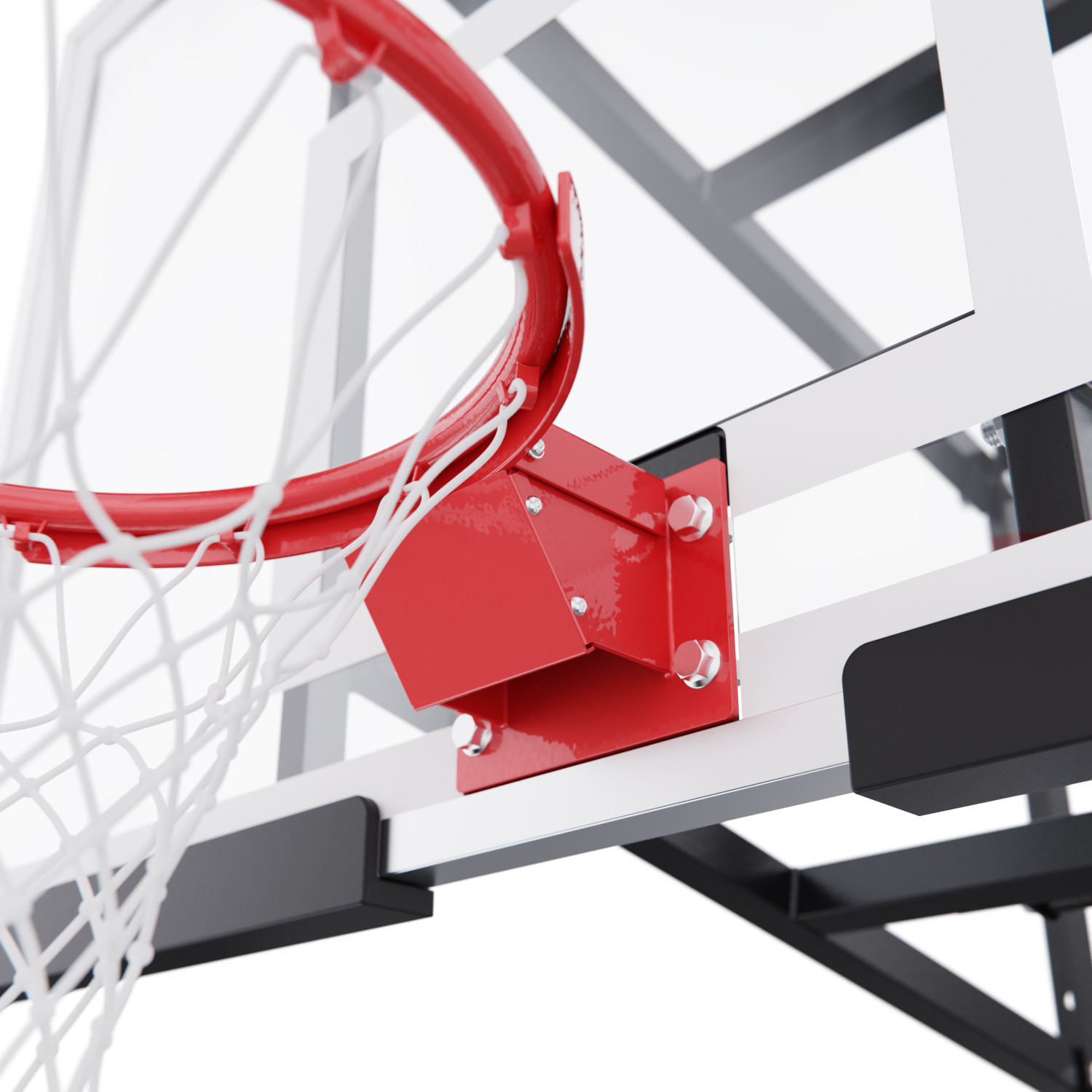 Щит изготовлен из прочного поликарбоната толщиной 2,5 мм — материала, обеспечивающего хороший отскок мяча и устойчивость к ударам. Его размеры — 120 x 80 см, что делает его максимально приближенным к профессиональному оборудованию. Регулируемый вынос щита (51–55,5 см) повышает безопасность и удобство во время игры. Дополнительную безопасность обеспечивает защита Poly Pade, установленная по нижнему краю щита.