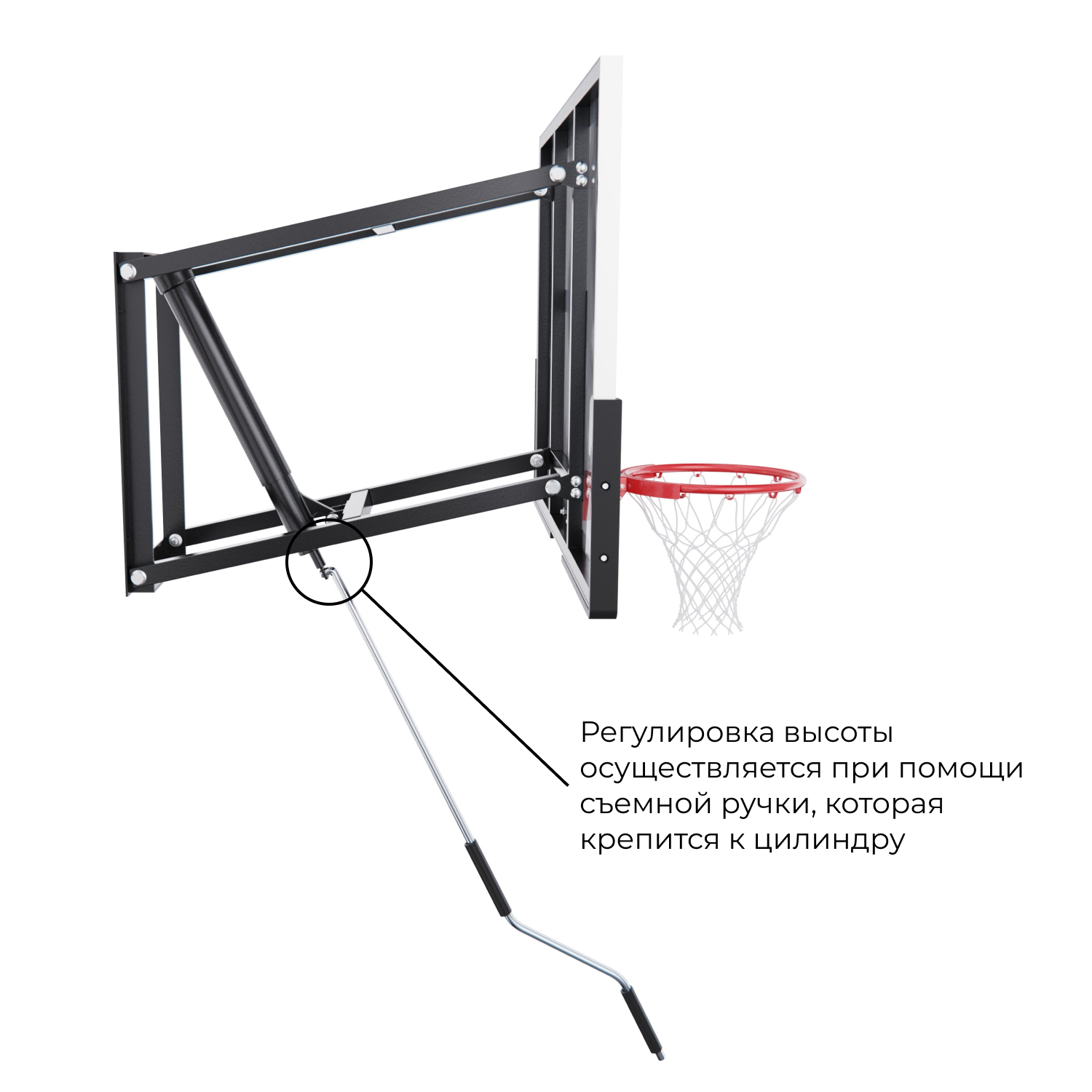 Кольцо стандартного диаметра 45 см устойчиво к интенсивной нагрузке. Благодаря регулируемой высоте кольца от 227 до 305 см, можно адаптировать баскетбольный щит под любой уровень подготовки и возраст игроков. Это особенно удобно при тренировках с детьми или в семейных играх. В целях безопасности запрещается висеть на кольце и других элементах баскетбольного щита.