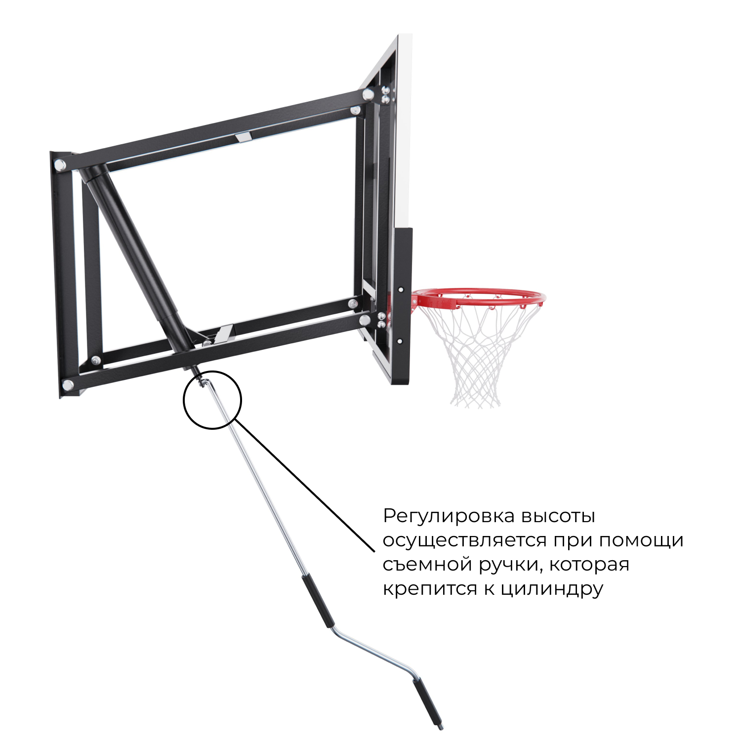 Кольцо стандартного диаметра 45 см устойчиво к интенсивной нагрузке. Благодаря регулируемой высоте кольца от 227 до 305 см, можно адаптировать баскетбольный щит под любой уровень подготовки и возраст игроков. Это особенно удобно при тренировках с детьми или в семейных играх. В целях безопасности запрещается висеть на кольце и других элементах баскетбольного щита.