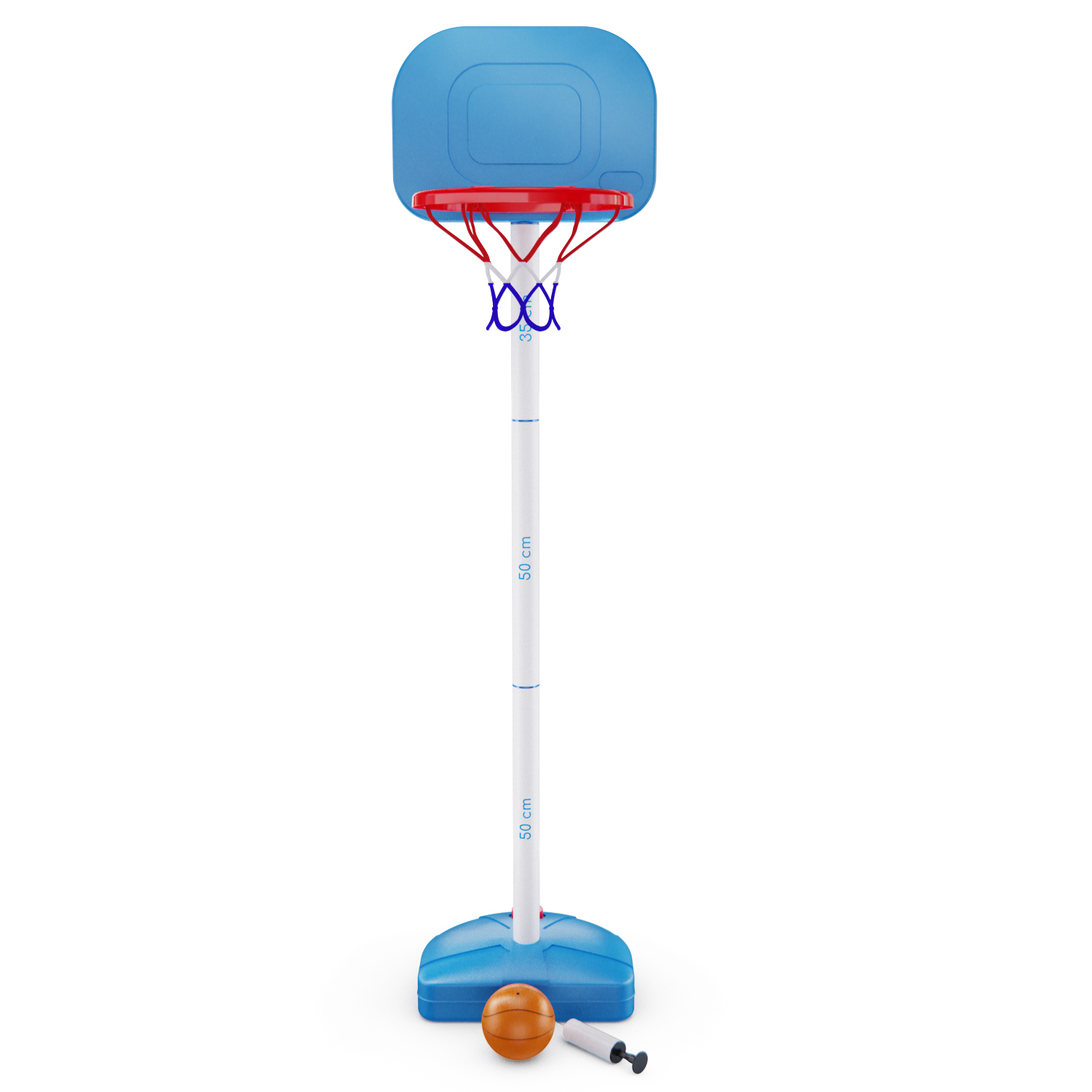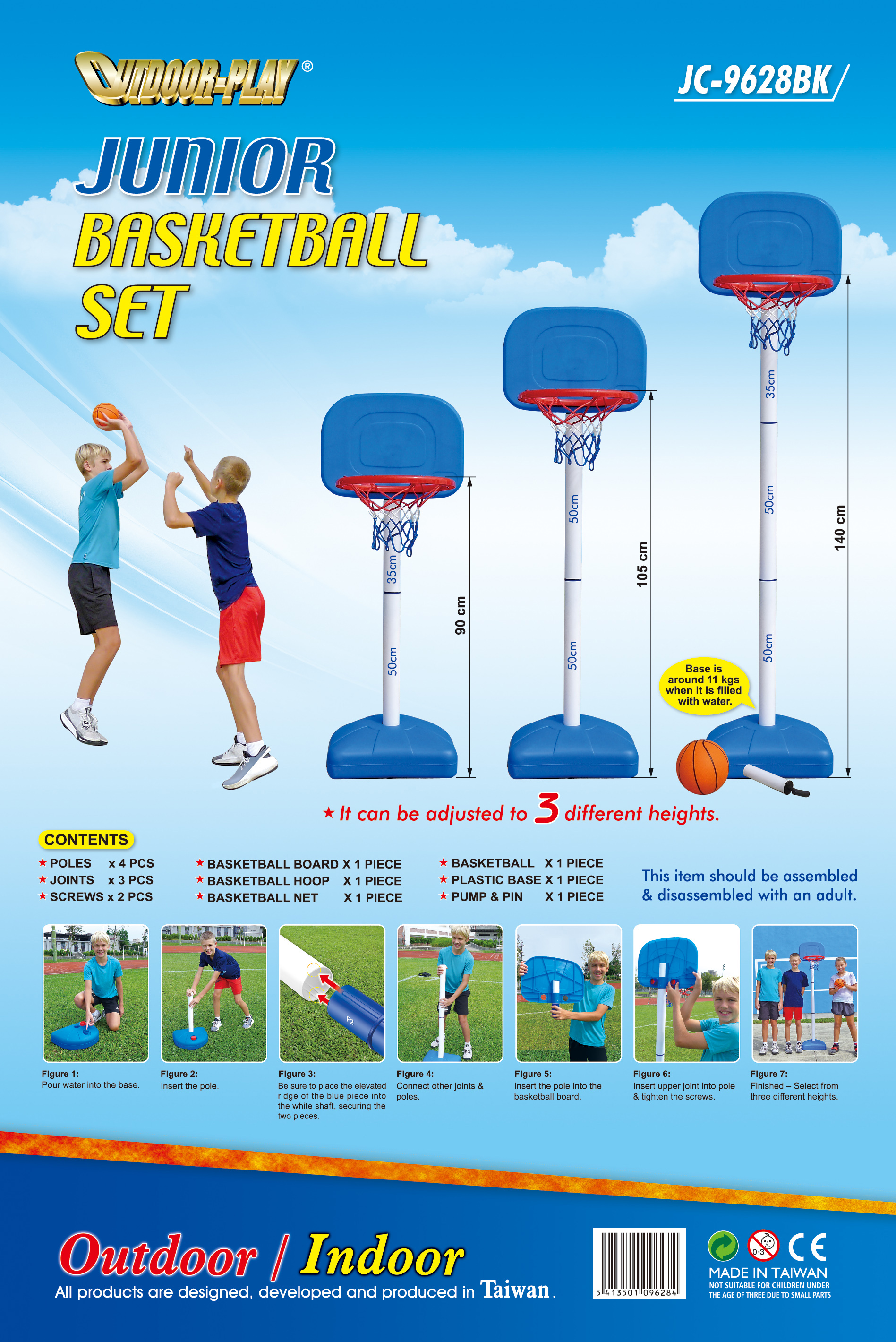 В комплект входят 6-дюймовый баскетбольный мяч и 8-дюймовый насос. Конструкция детского баскетбольного набора безопасна и удобна для игры ребёнка. Набор легко собрать, с этим справится даже ребёнок. Перед использованием заполните основание стойки водой.