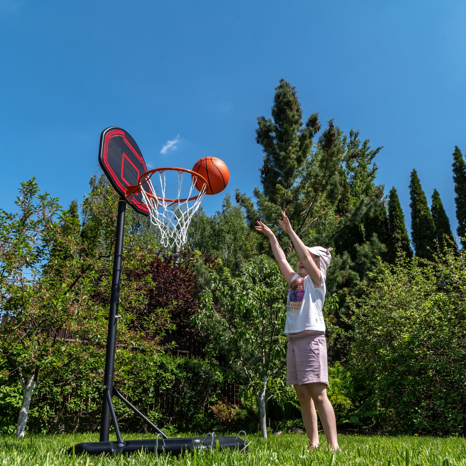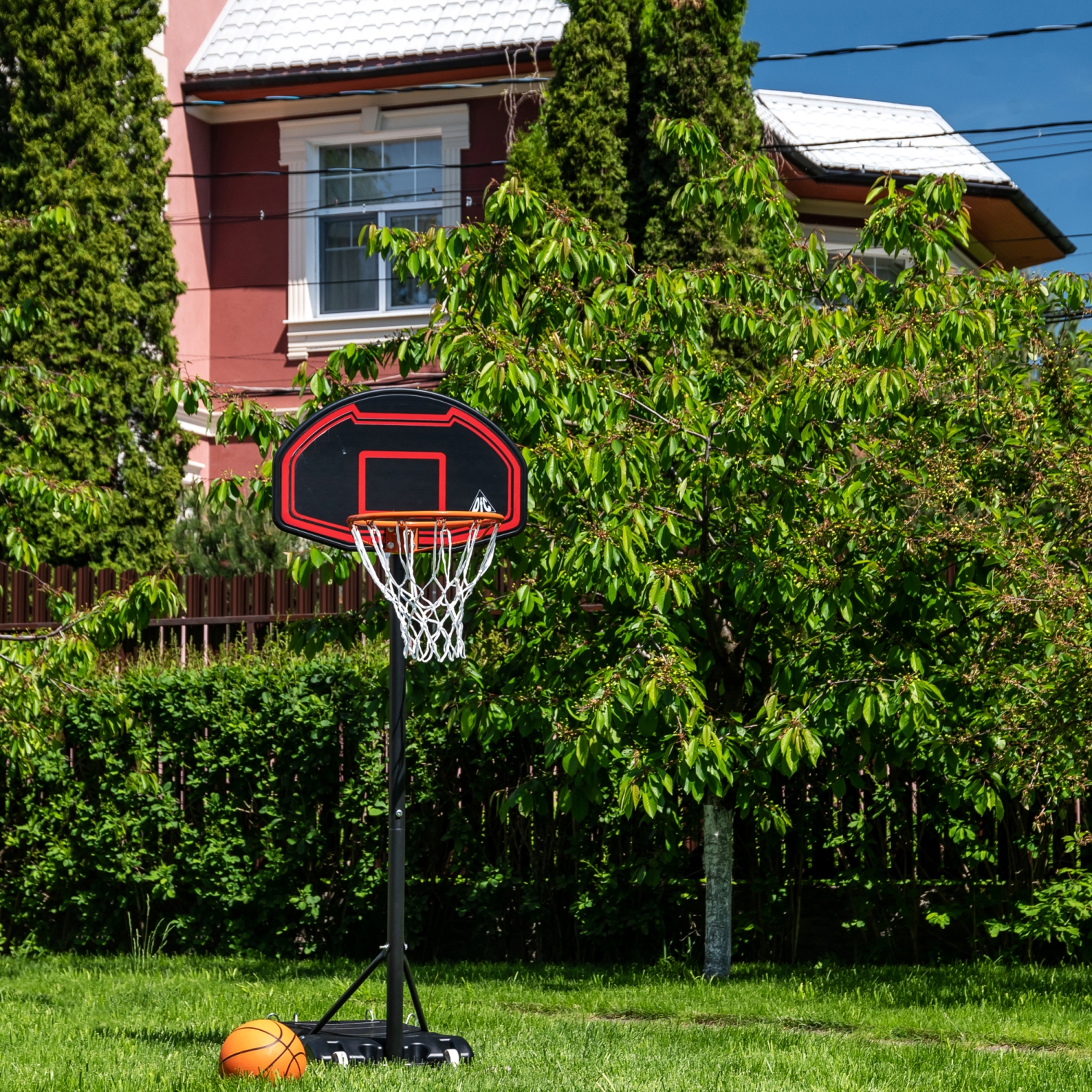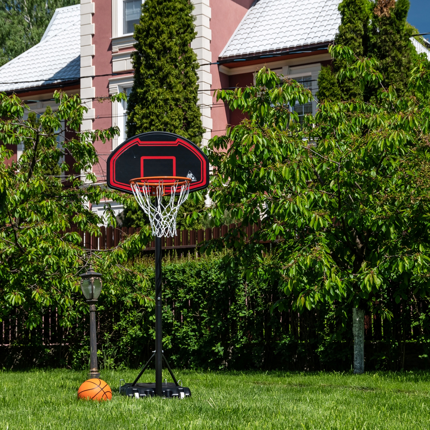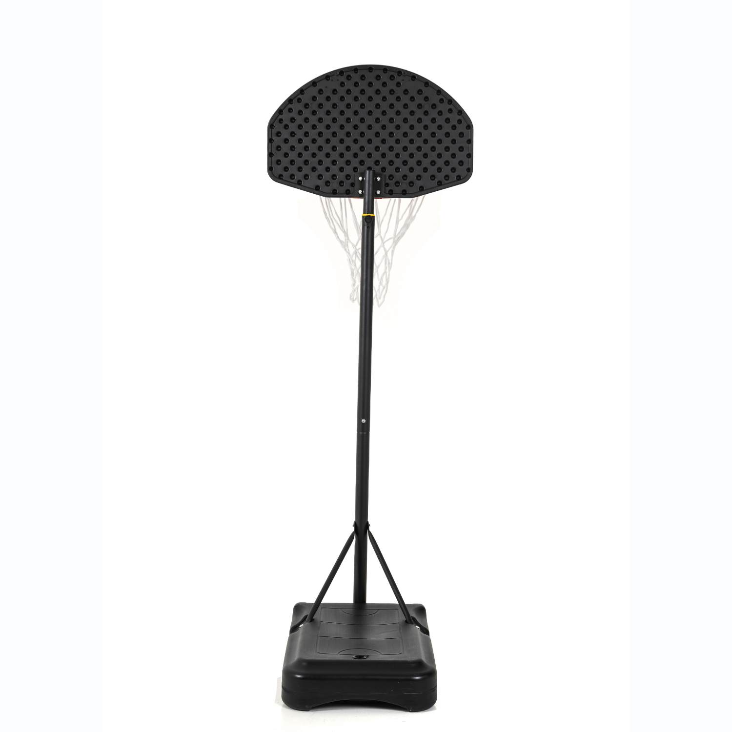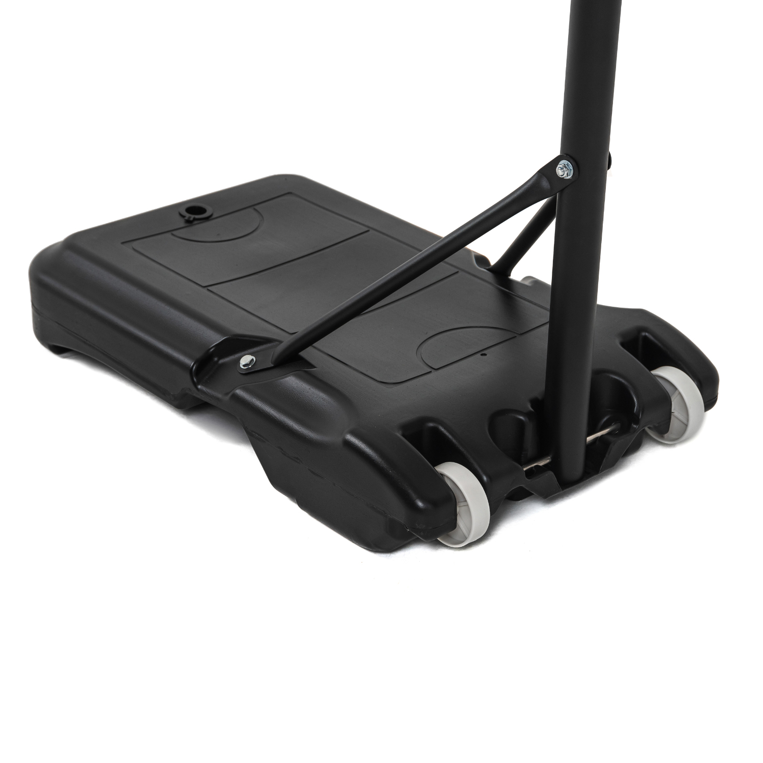Детская мобильная баскетбольная стойка с щитом из полиэтилена. В основание размерами 75 х 45 х 13 см необходимо залить воду или засыпать песок (43 л, а именно объёмом 0,043 м3).