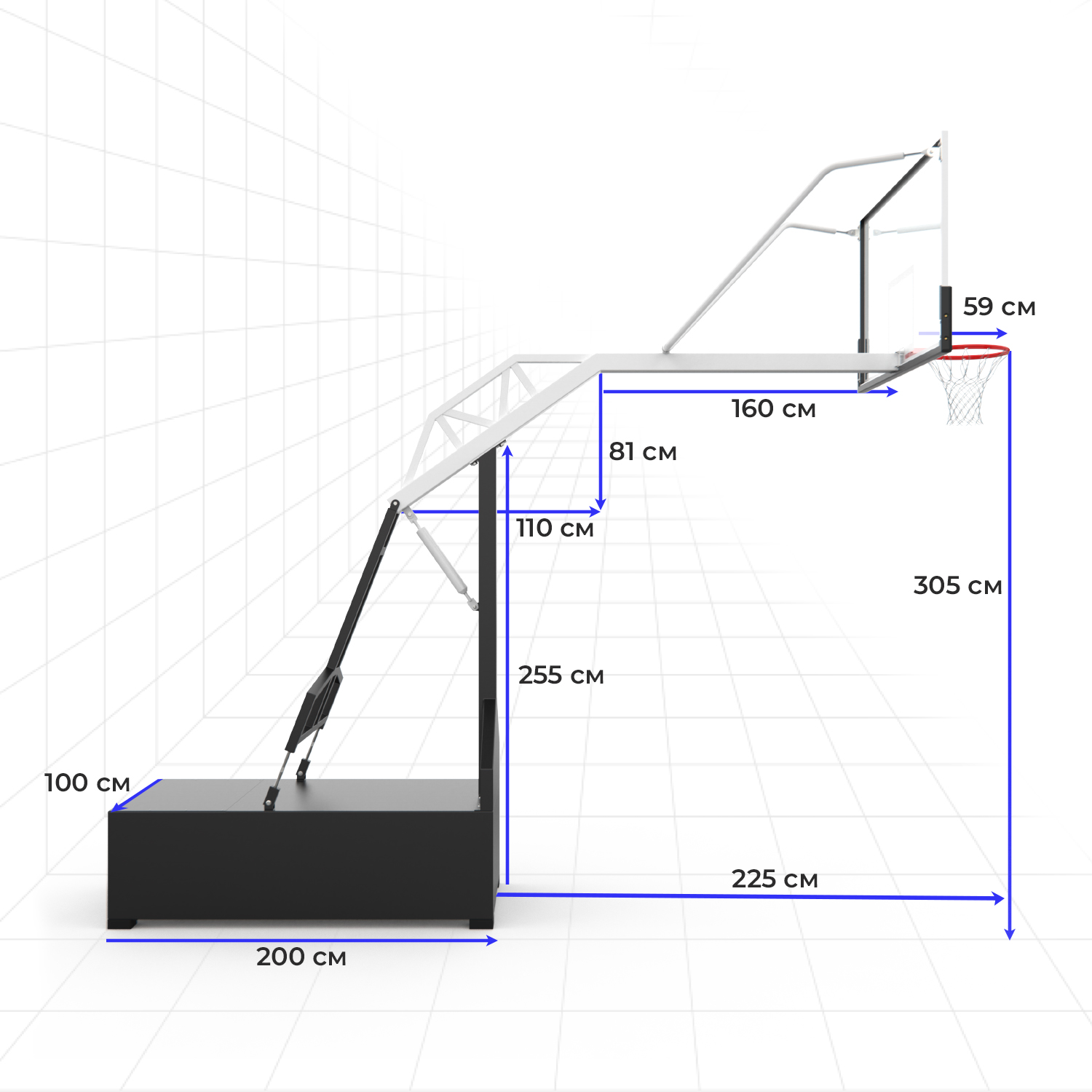 Размер щита – 180х105 см, высота по кольцу – 305 см, вылет щита – 225 см. В комплекте кольцо диаметром 45 см, крепление. В комплекте кольцо диаметром 45 см и крепление. Квадратный столб из нержавеющей стали толщиной 3 мм, размерами 10 x 20 см, поддерживает щит.