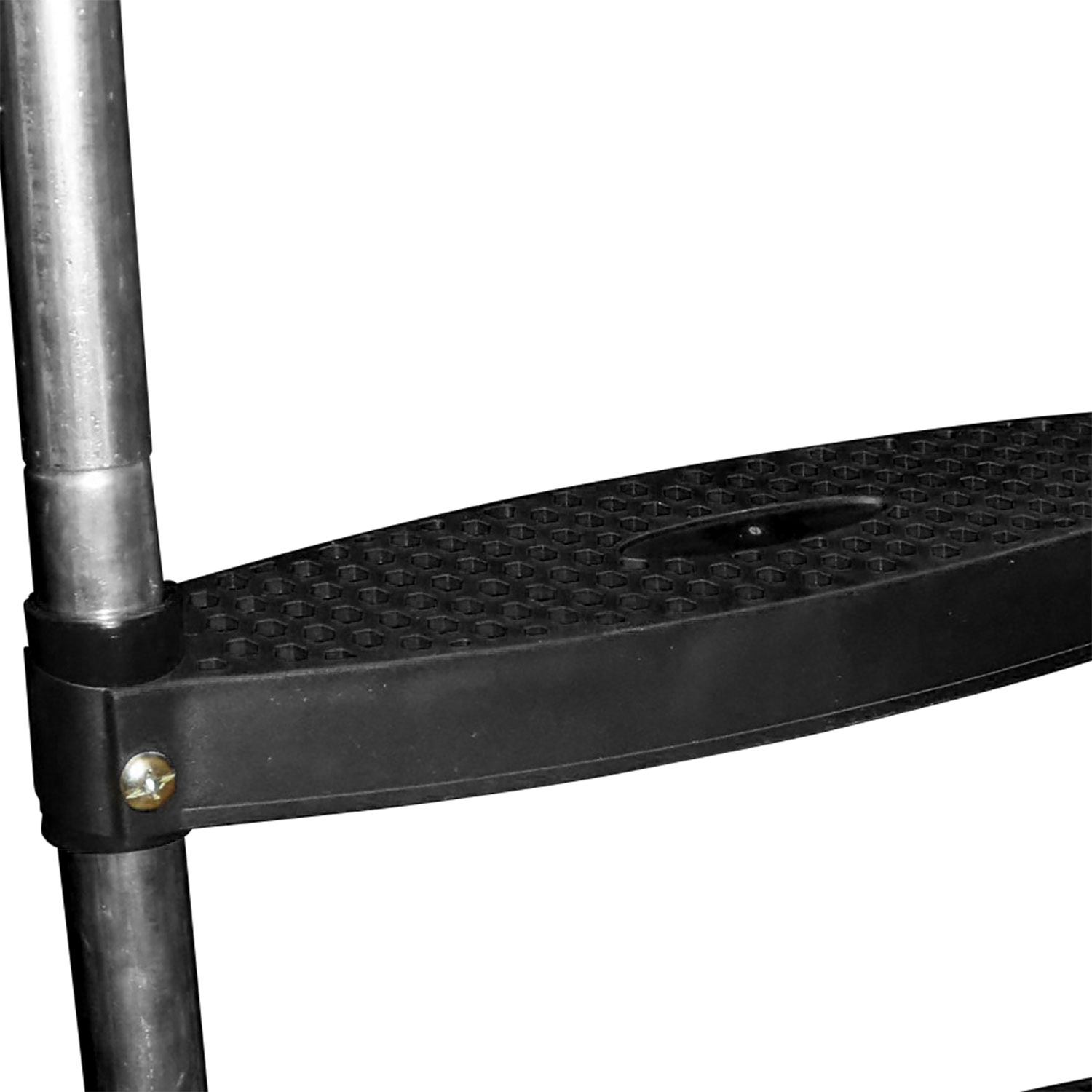Ступени лестницы изготовлены из прочного пластика и имеют нескользящую поверхность. Цвет черный.