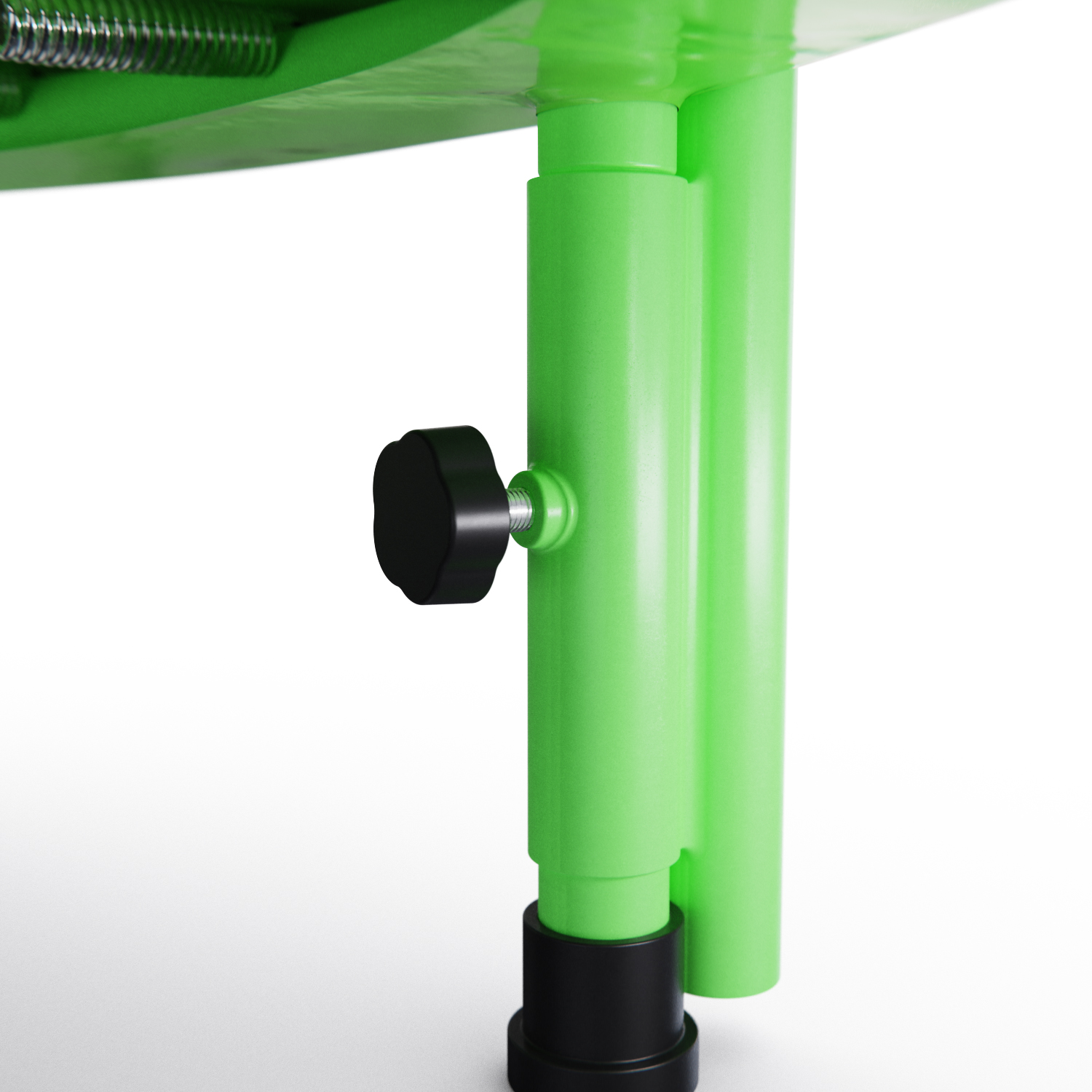 Основная рама сделана из цельной конструкции Ø25х1 мм, что гарантирует стабильность и долговечность изделия. Ножки батута выполнены в виде U-образных опор из стали Ø25х1,5 мм и оснащены защитными нескользящими накладками. Это обеспечивает устойчивость батута на любой поверхности.