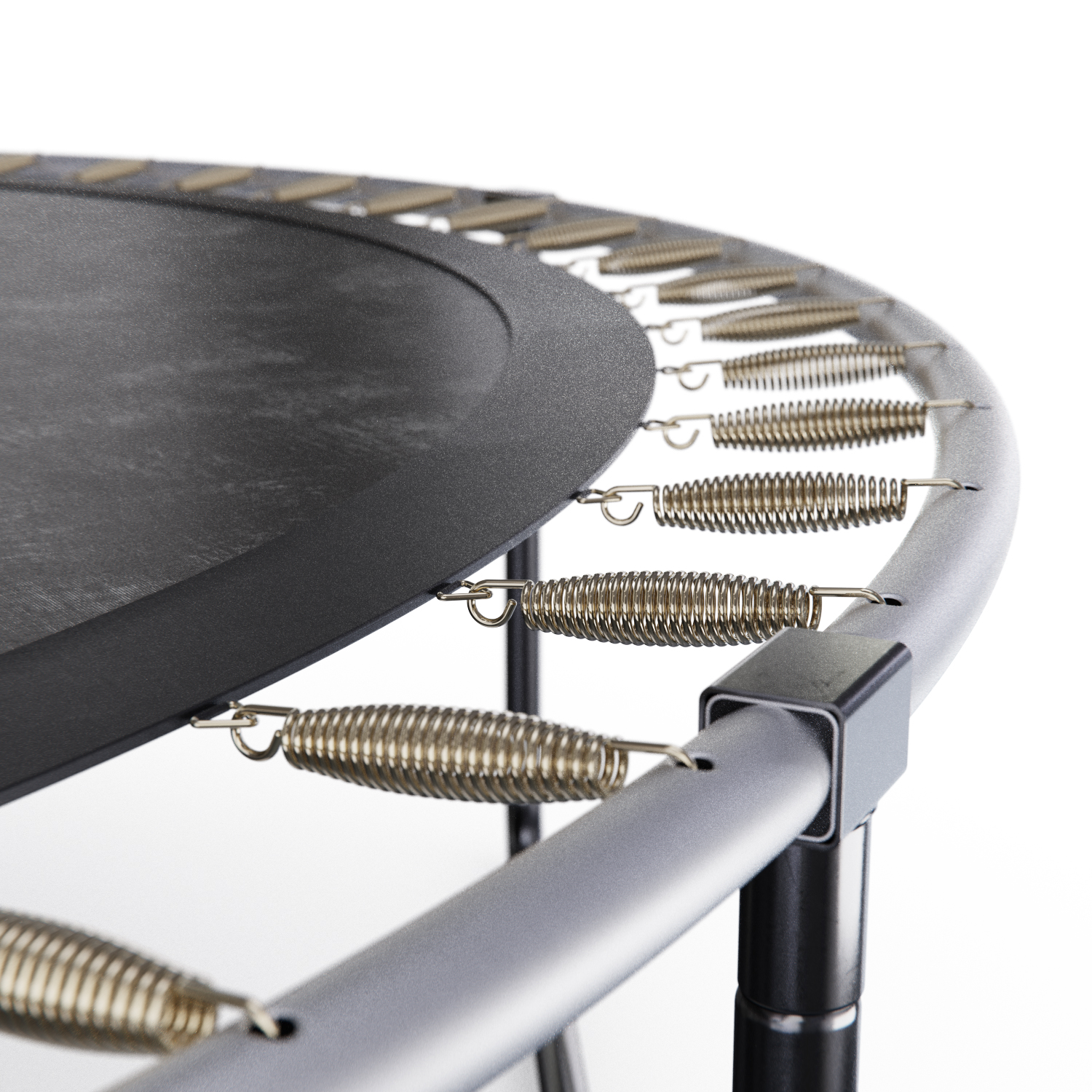 Основная рама батута состоит из 8-ми прочных стальных труб диаметром 38 мм и толщиной 1,2 мм, что обеспечивает устойчивость и безопасность при использовании. U-образные ножки и стойки для защитной сетки также выполнены из высокопрочной стальной трубы.