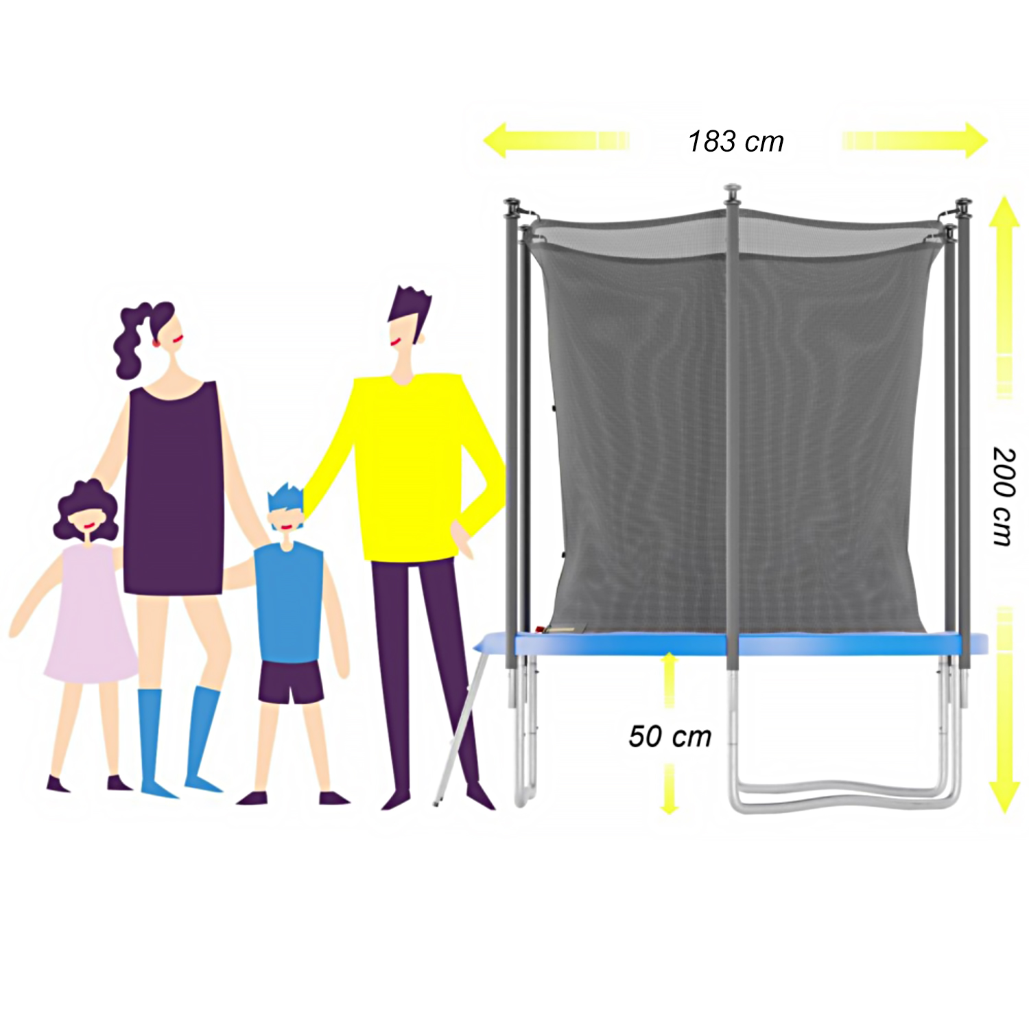Батут имеет высоту 50 см, что позволяет легко входить и выходить из него. Высота защитной сетки составляет нестандартные 200 см, обеспечивая безопасное использование даже для высоких детей. Внутренняя сетка обеспечивает изоляцию ребёнка от пружин, делая батут ещё более безопасным. Лестница в наличии.