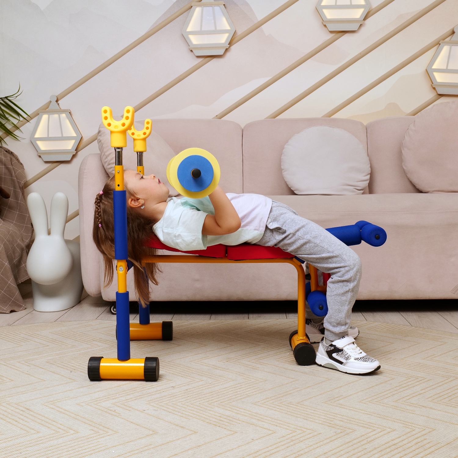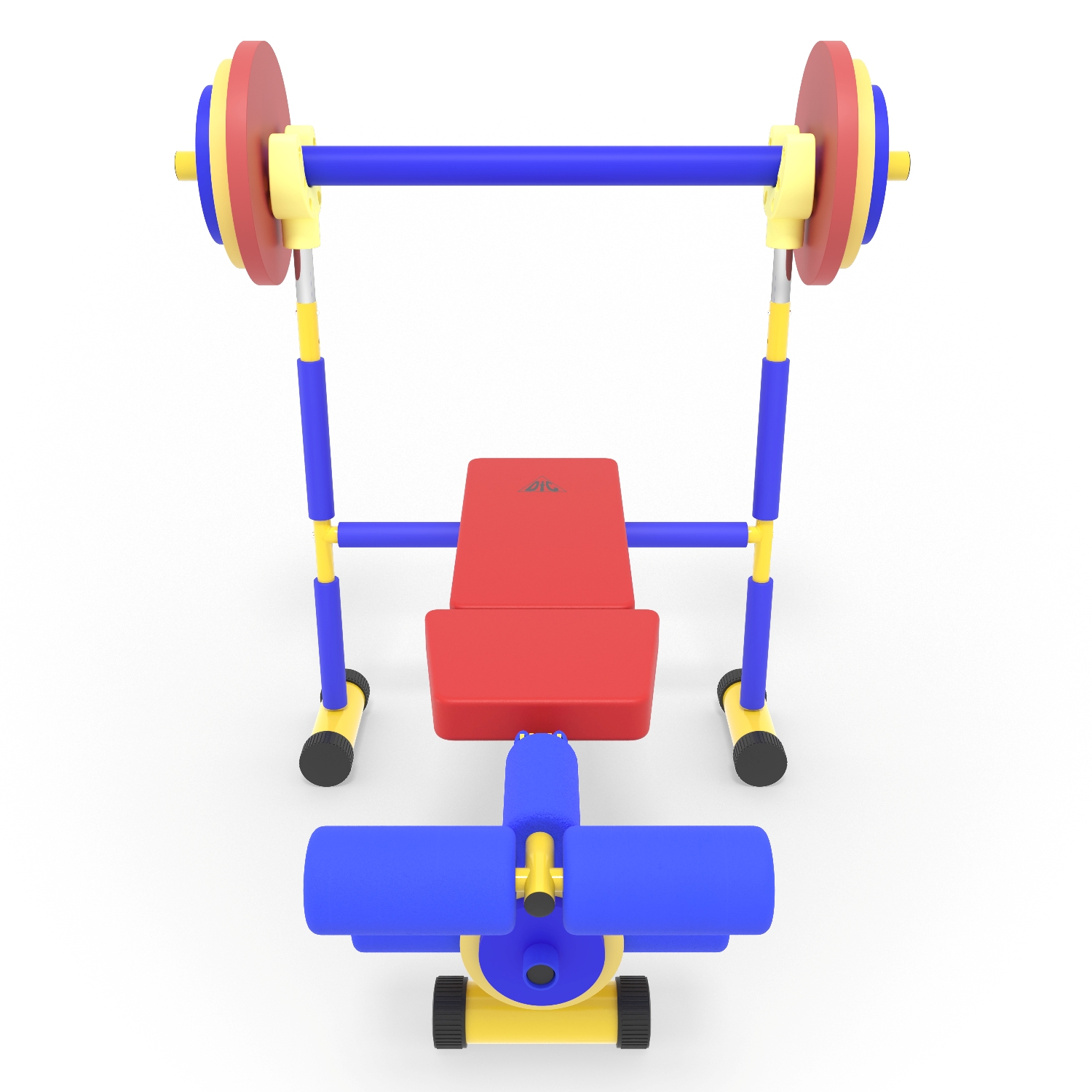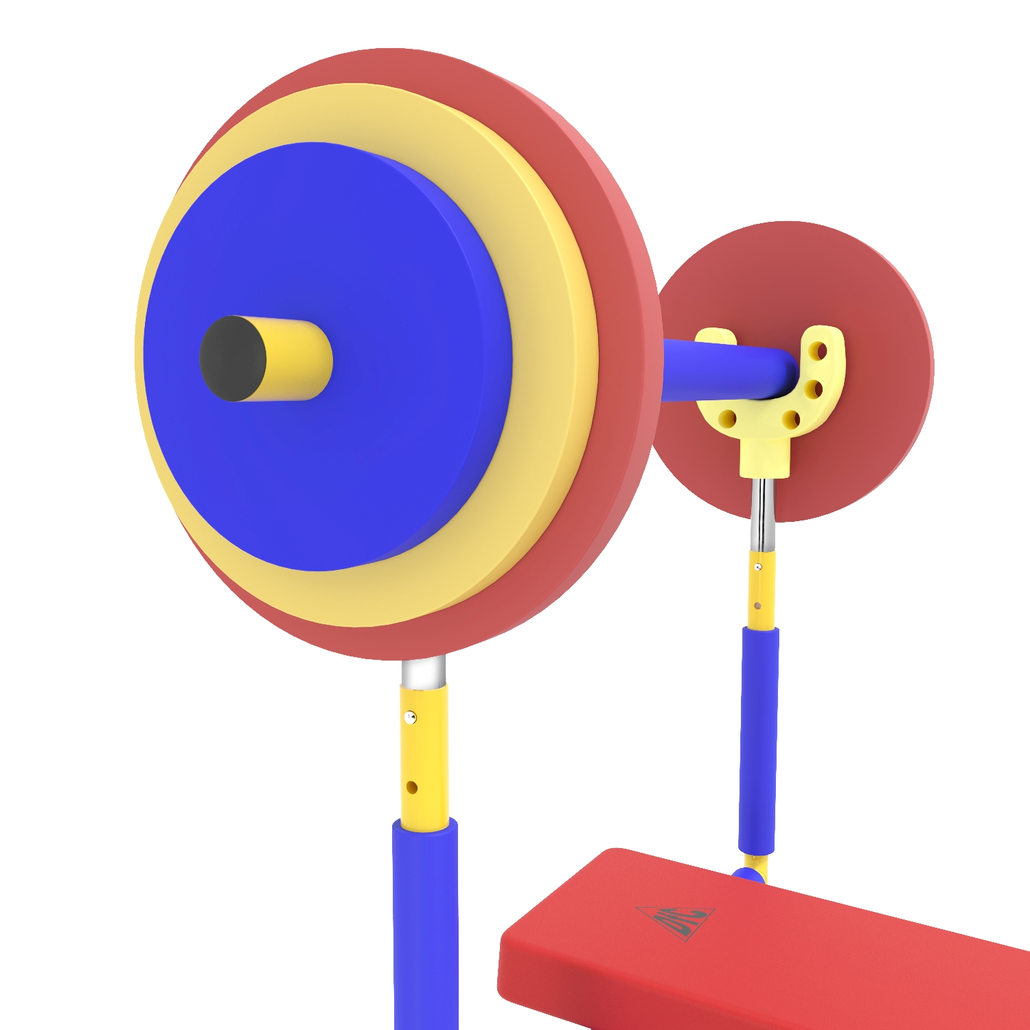 Скамья продается в комплекте со штангой и 8 весовыми пластинами разной массы. Поднятия штанги и жим ногами на специализированной детской скамье укрепляет мышечный корсет и развивает выносливость ребенка.