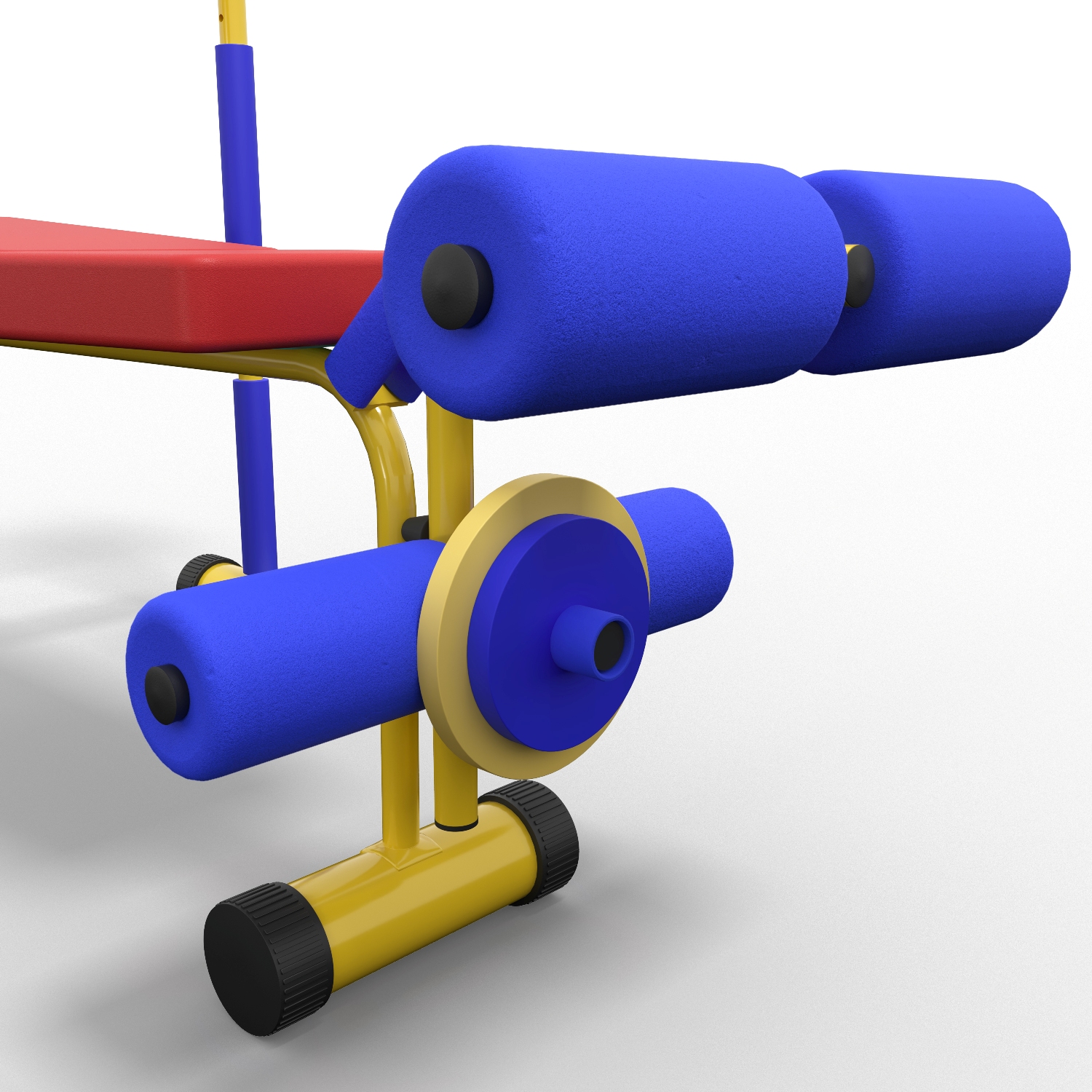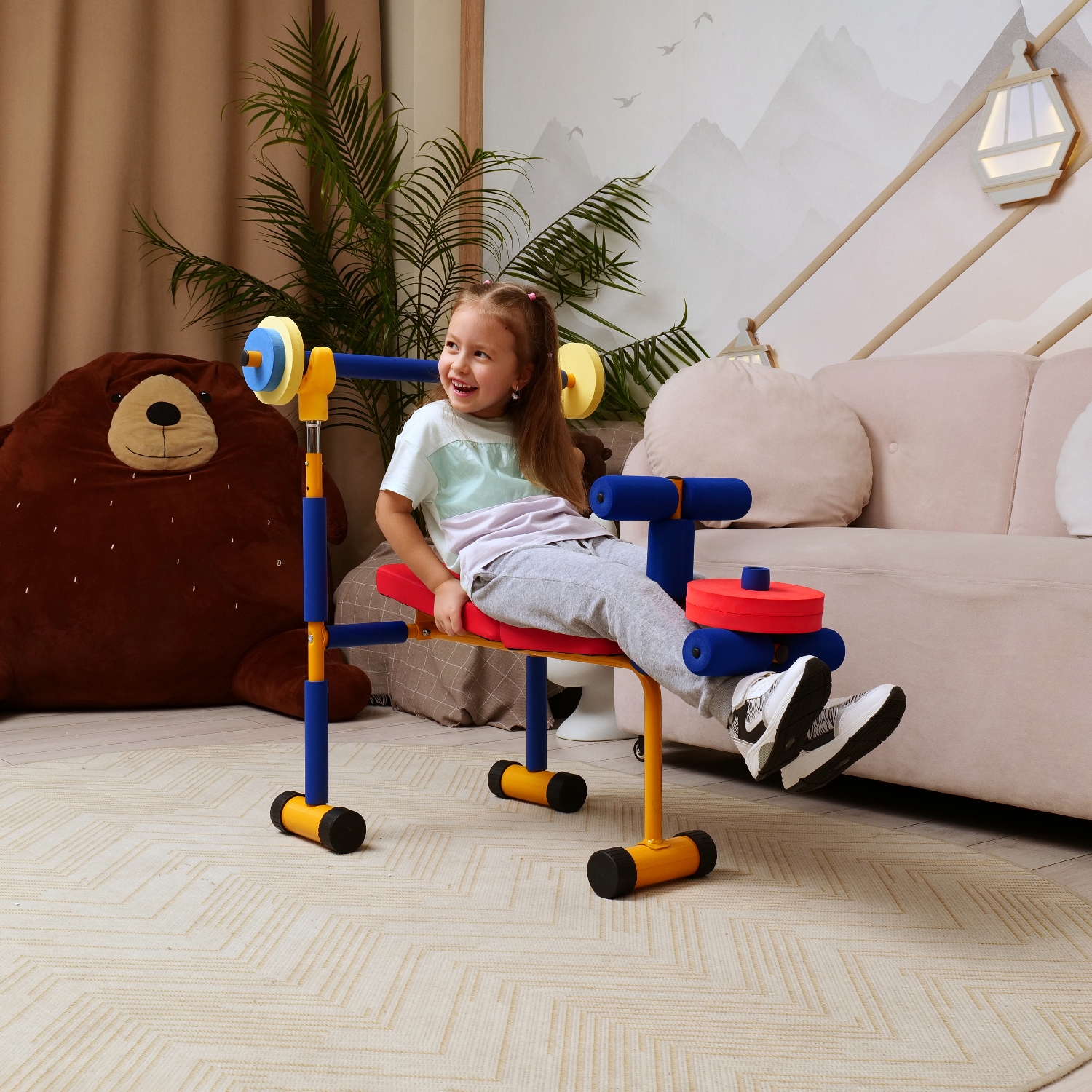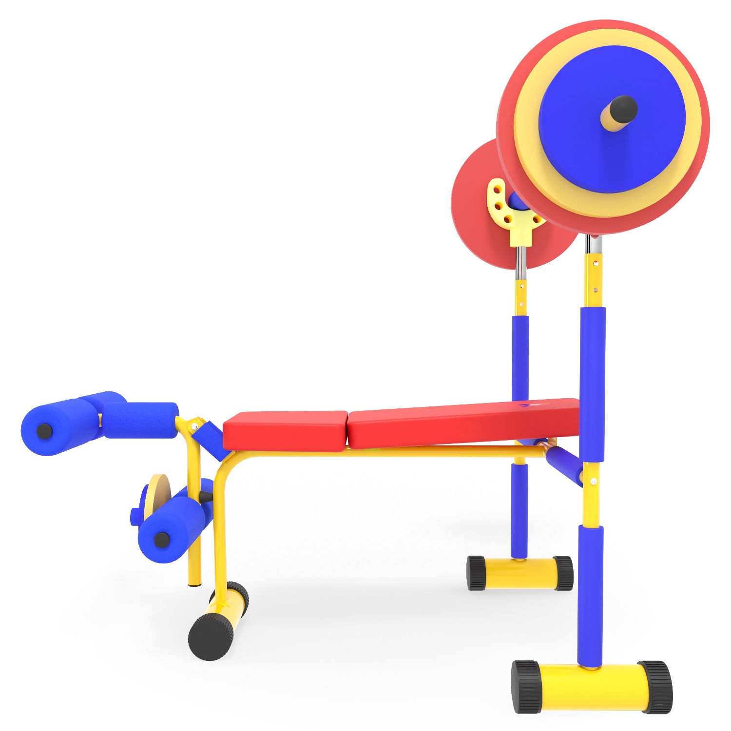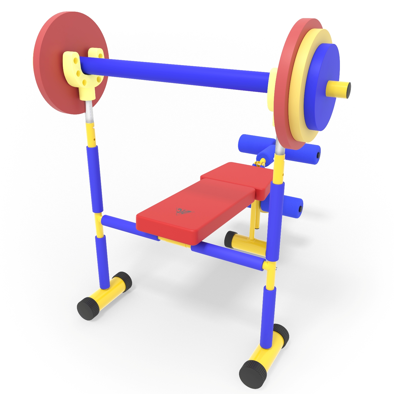 Скамья продается в комплекте со штангой и 8 весовыми пластинами разной массы. Поднятия штанги и жим ногами на специализированной детской скамье укрепляет мышечный корсет и развивает выносливость ребенка.