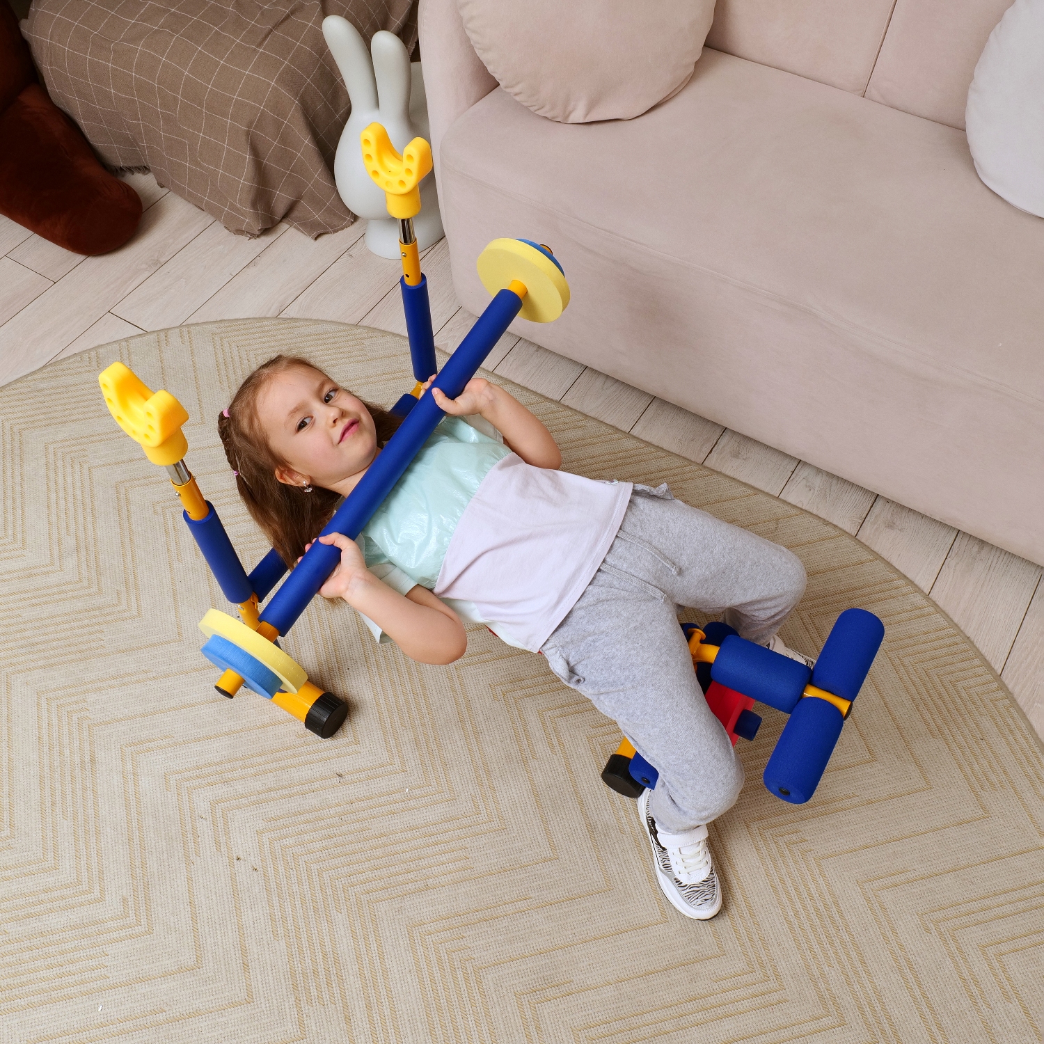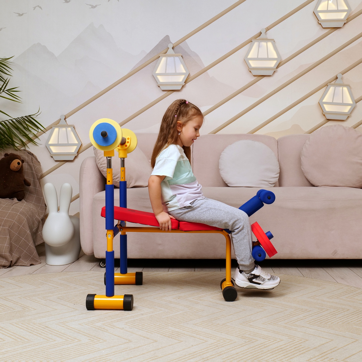 Скамья для домашних детских тренировок с усиленной конструкцией. Скамья легко собирается и транспортируется, а весовые гантели не требуют наполнения водой.