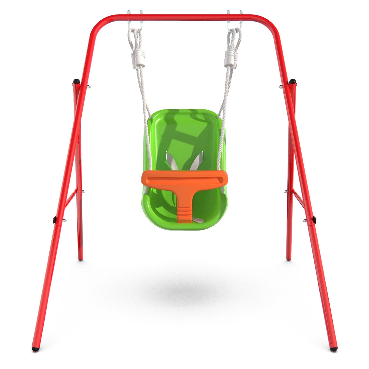 Модель очень лёгкая и компактная — при габаритах 95×103×113 см качели весят всего 5 кг, поэтому их можно разместить прямо в детской или взять с собой в поездки на машине. Яркое пластиковое сиденье оборудовано ремнями безопасности и защитным поручнем с «перемычкой» для ножек, которая не позволит малышу сползти вниз.