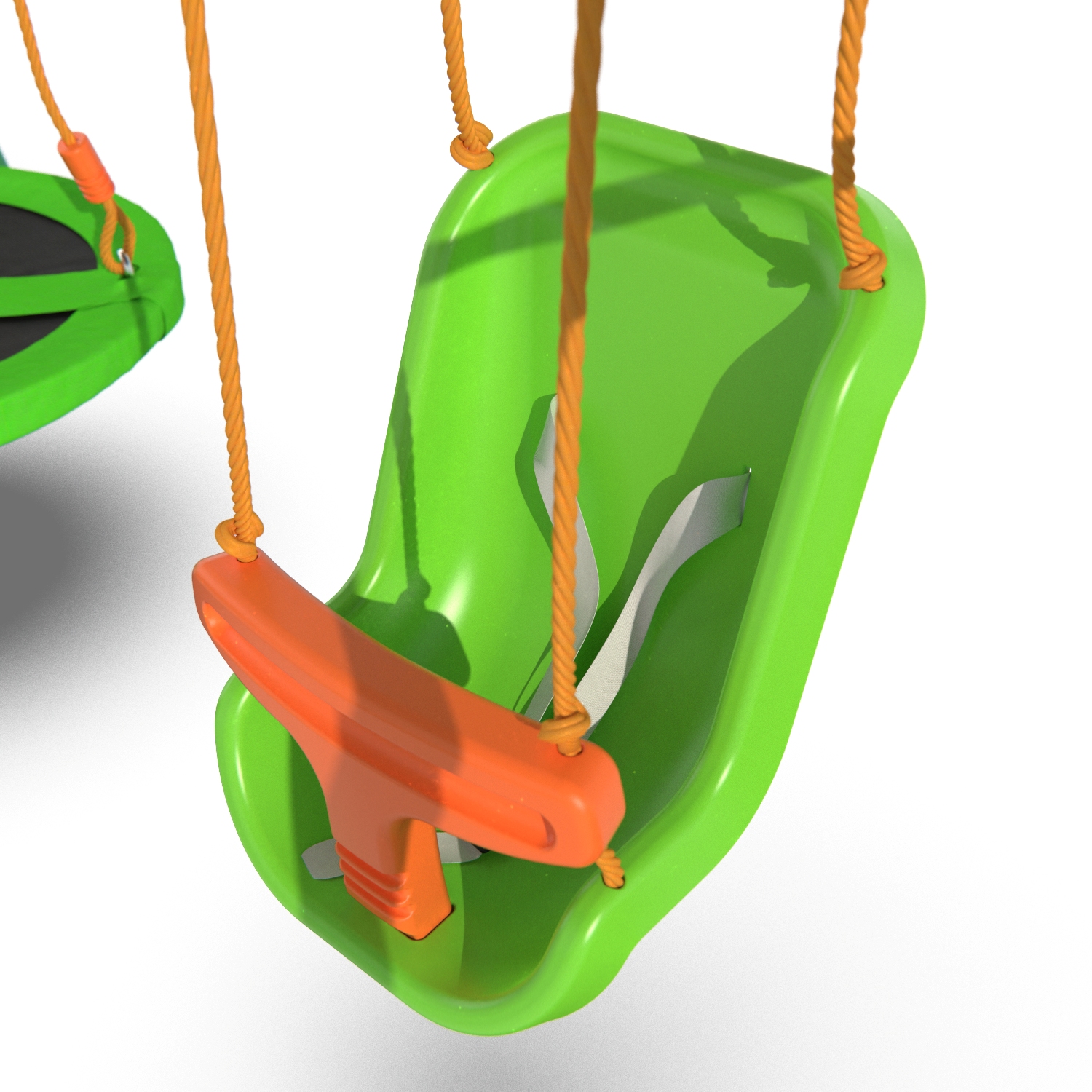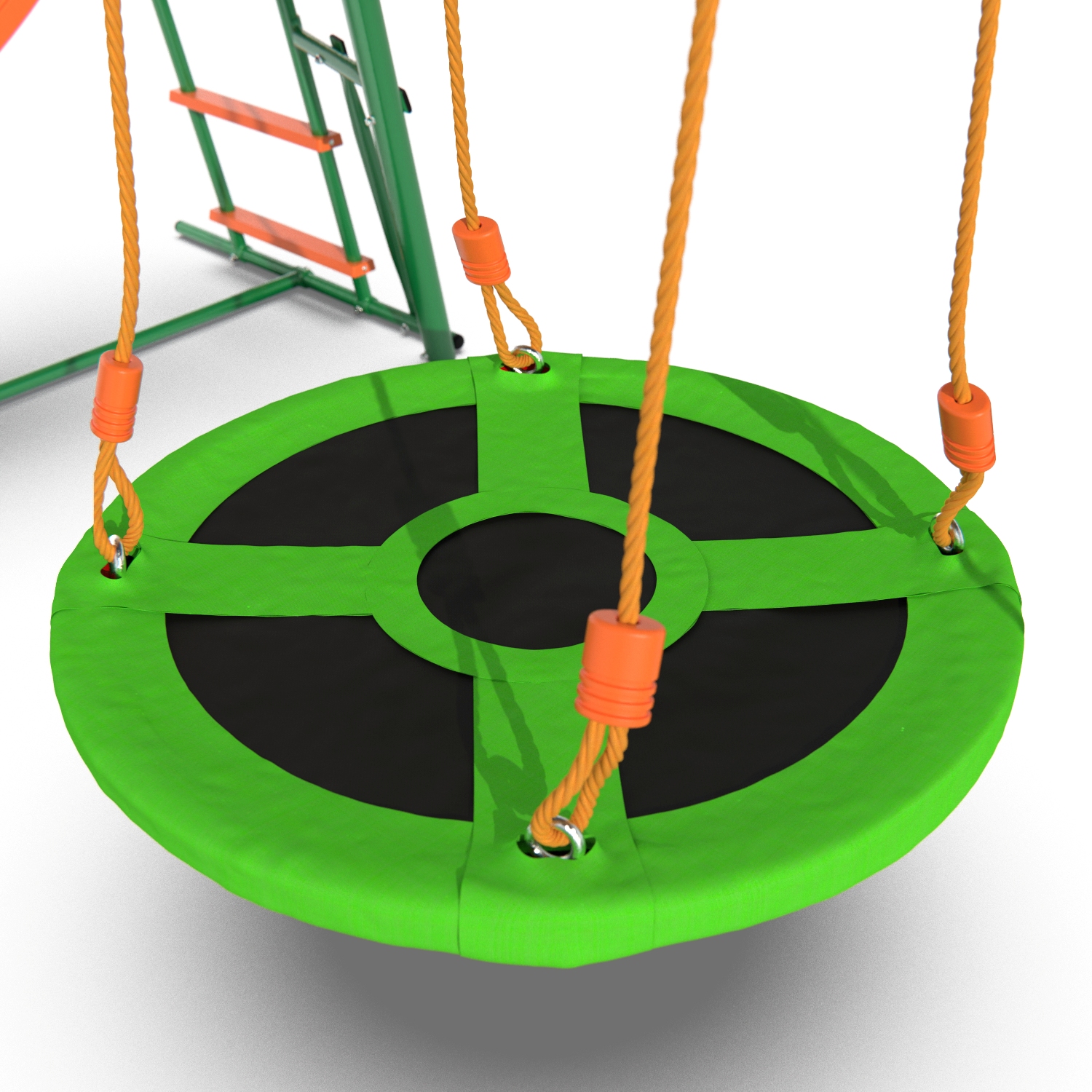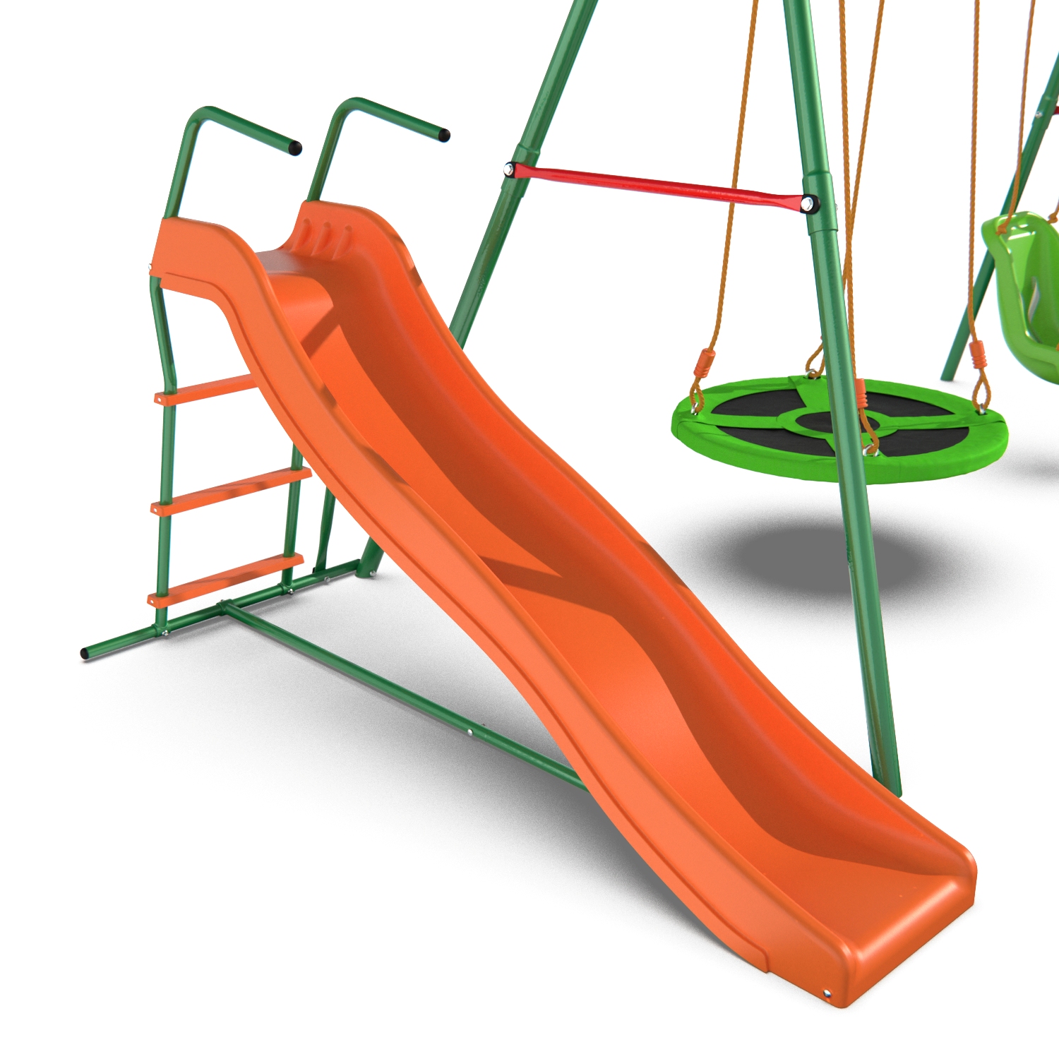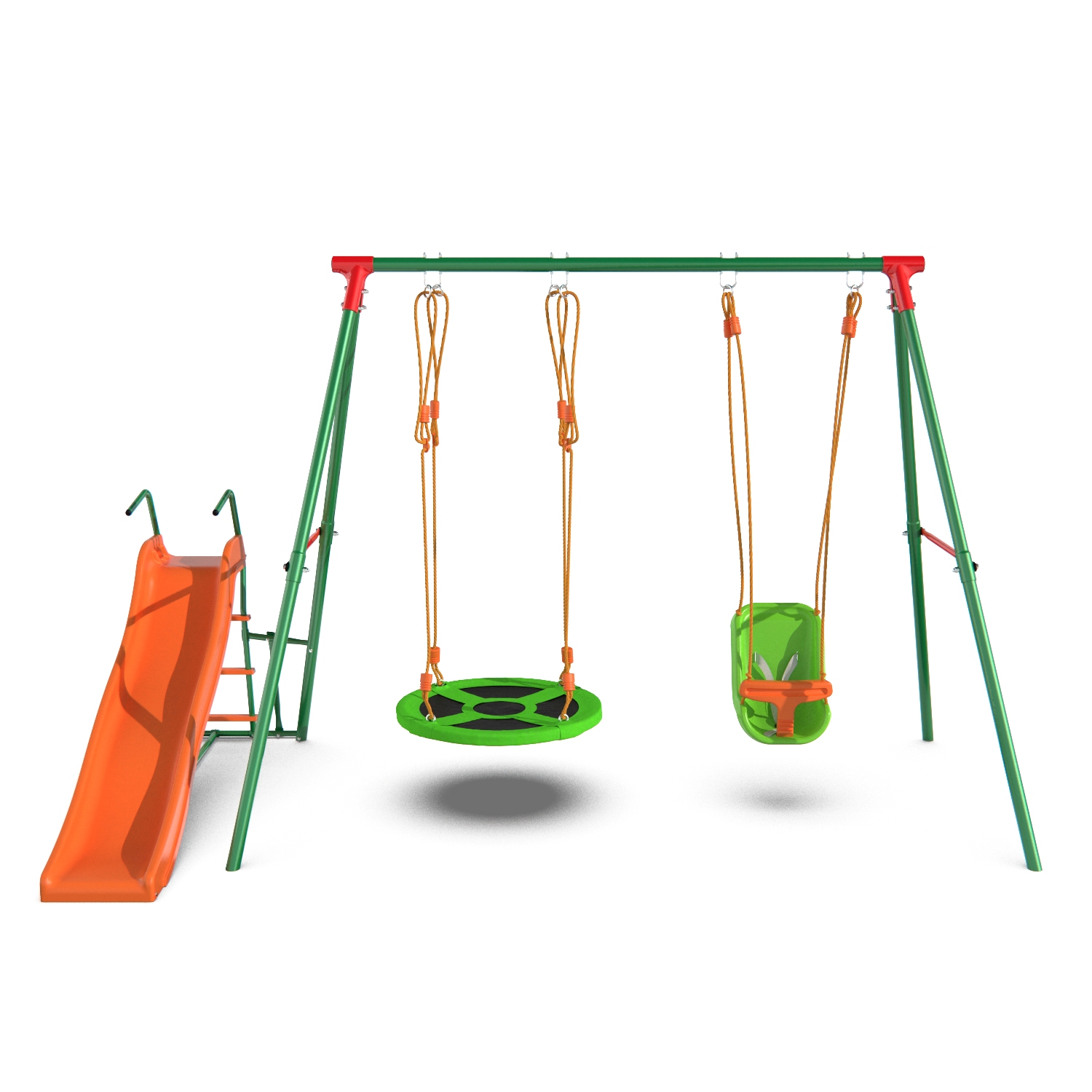 Комплекс состоит из элементов для детей любого возраста: для самых маленьких — веревочные качели с сиденьем, оборудованным защитными элементами (ремни безопасности, защитный бампер), для ребят постарше — качели-гнездо и горка из безопасного ABS пластика. Размеры комплекса — 315×188×196 см — позволяют детям спокойно передвигаться, не толкая друг друга.