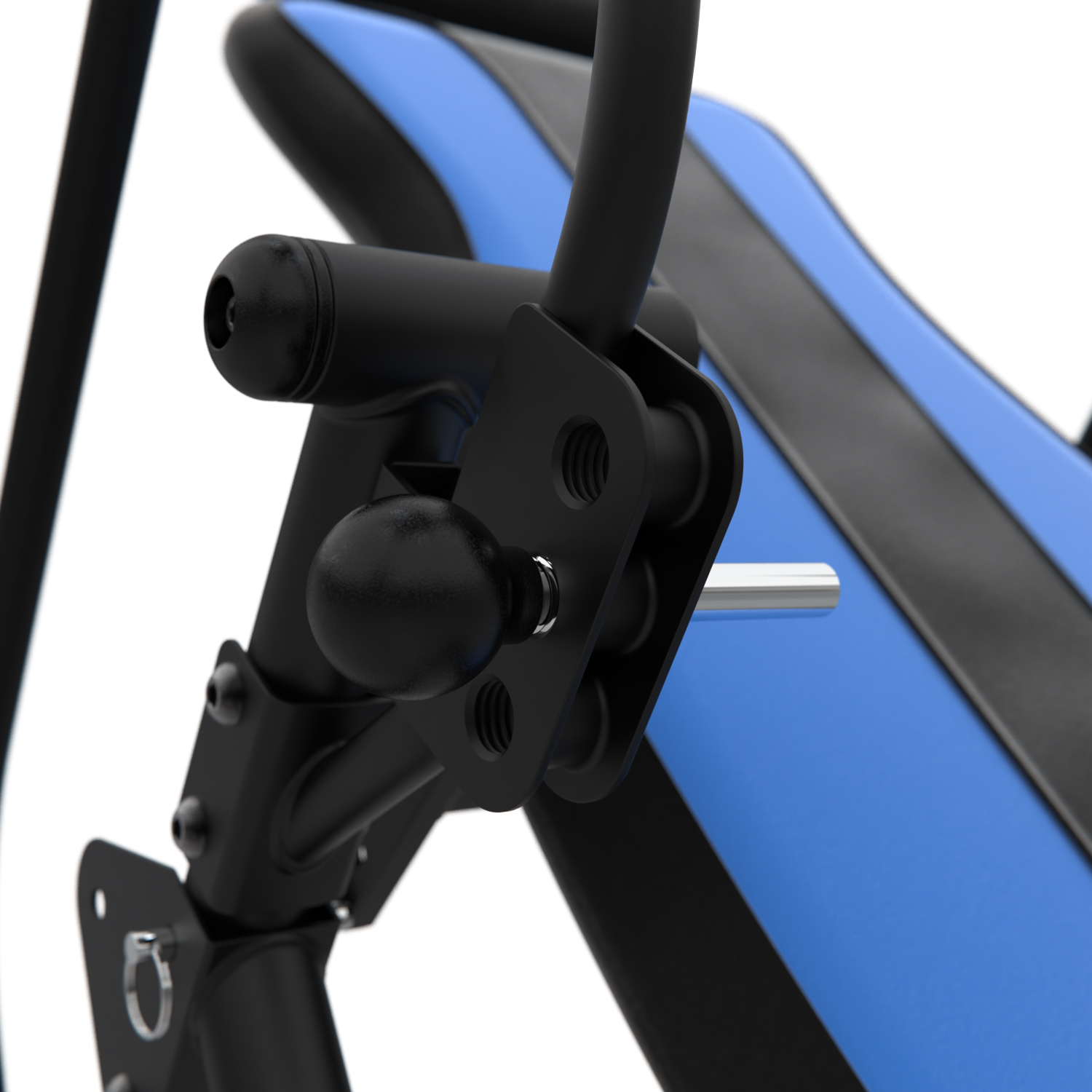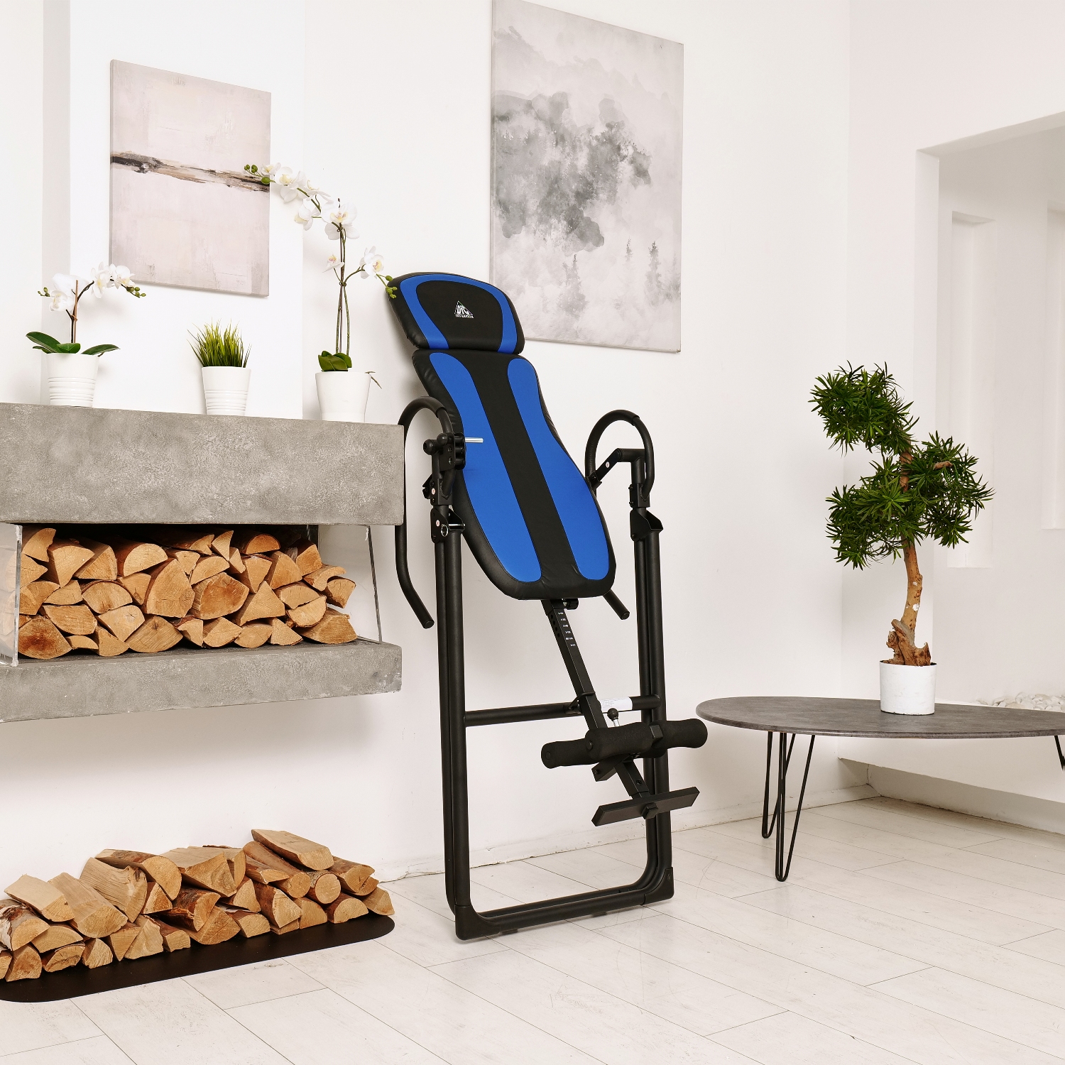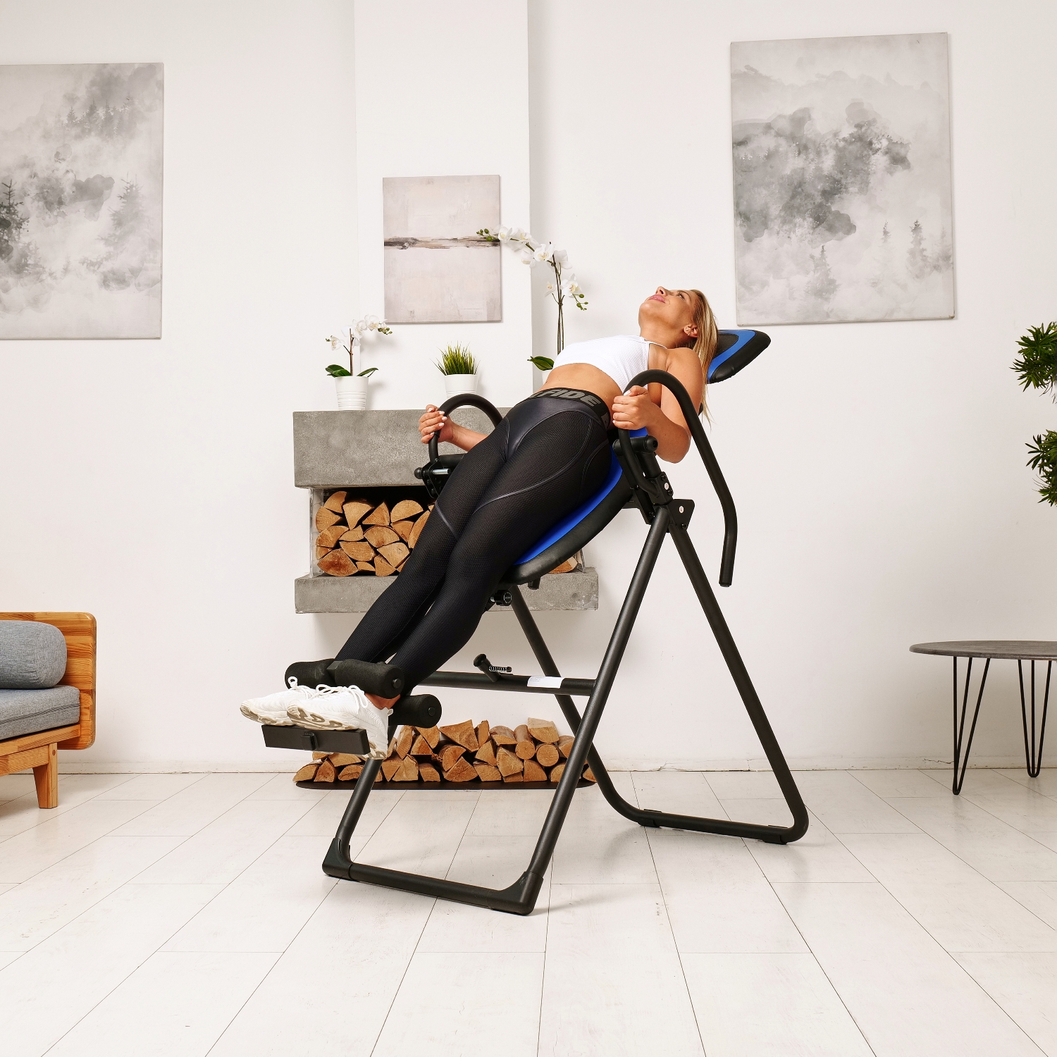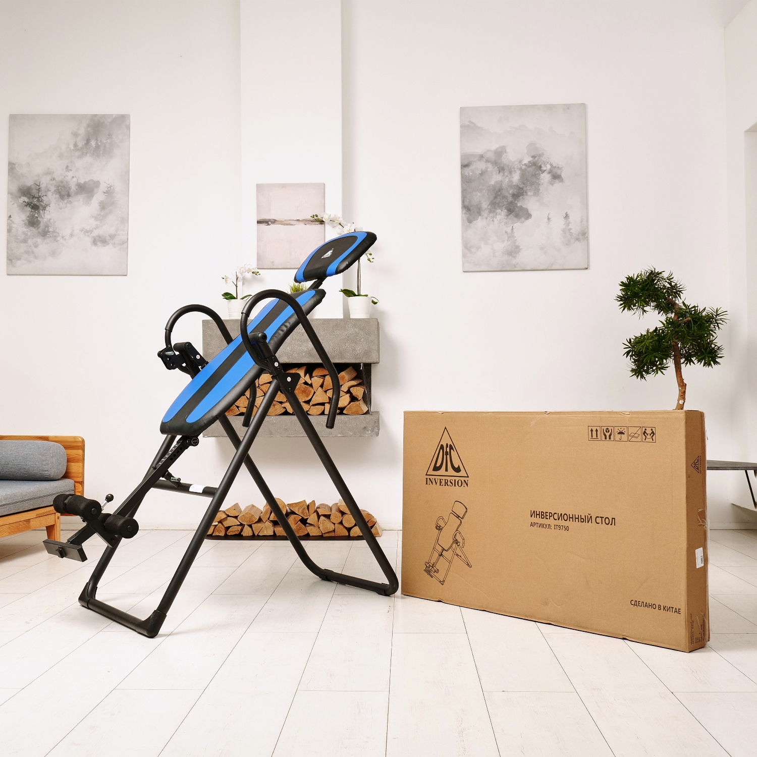 Инверсионный стол IT9750 для домашнего использования. Корпус черного цвета, спинка темно-синяя с яркими синими вставками. Максимальный вес пользователя 120 кг.