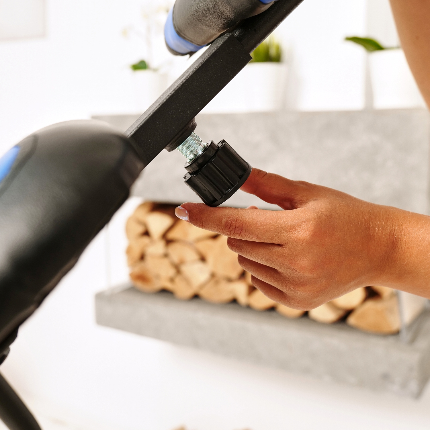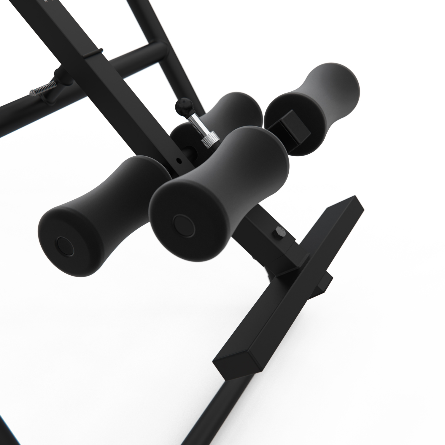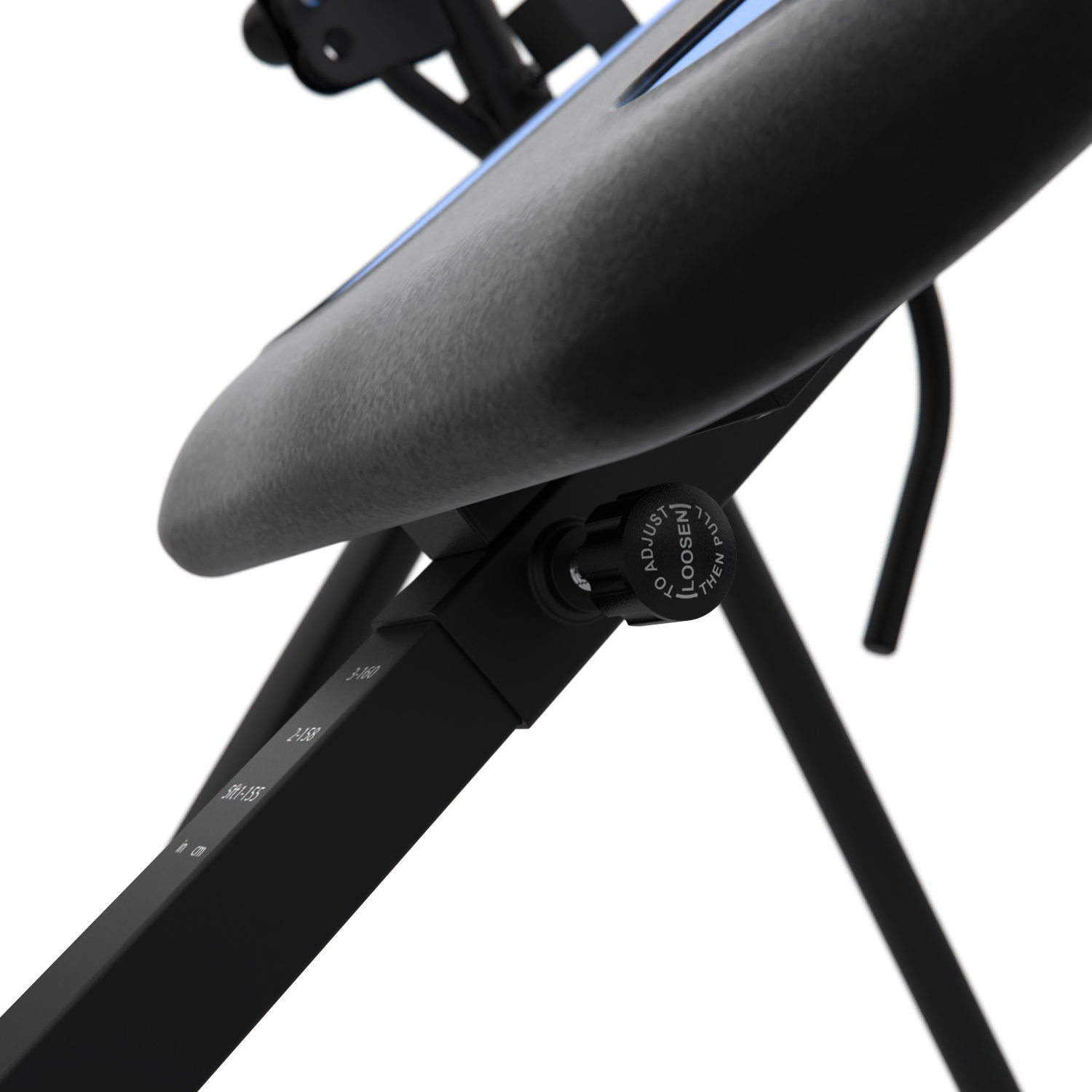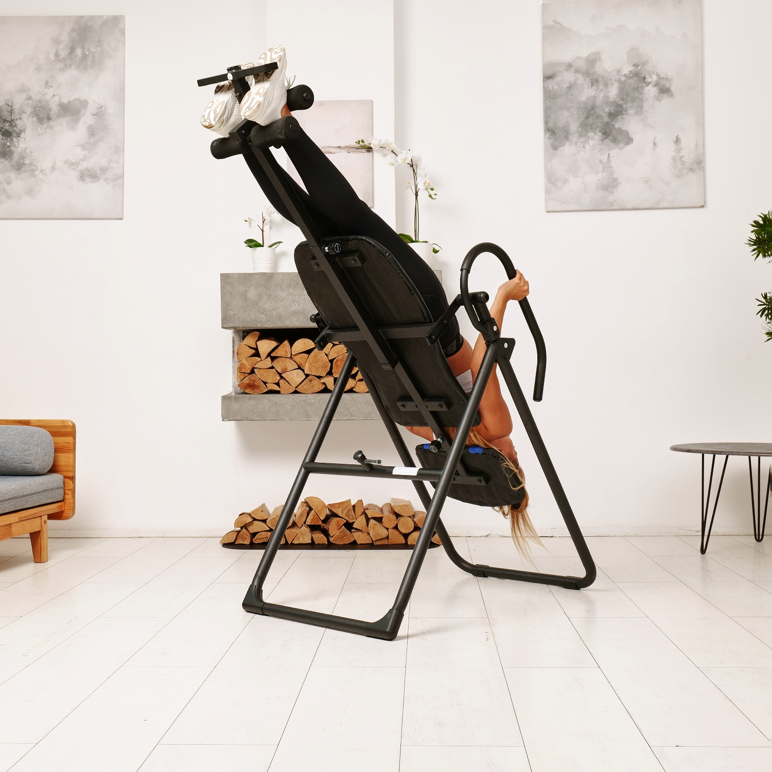 Инверсионный стол IT9750 для домашнего использования. Корпус черного цвета, спинка темно-синяя с яркими синими вставками. Максимальный вес пользователя 120 кг.