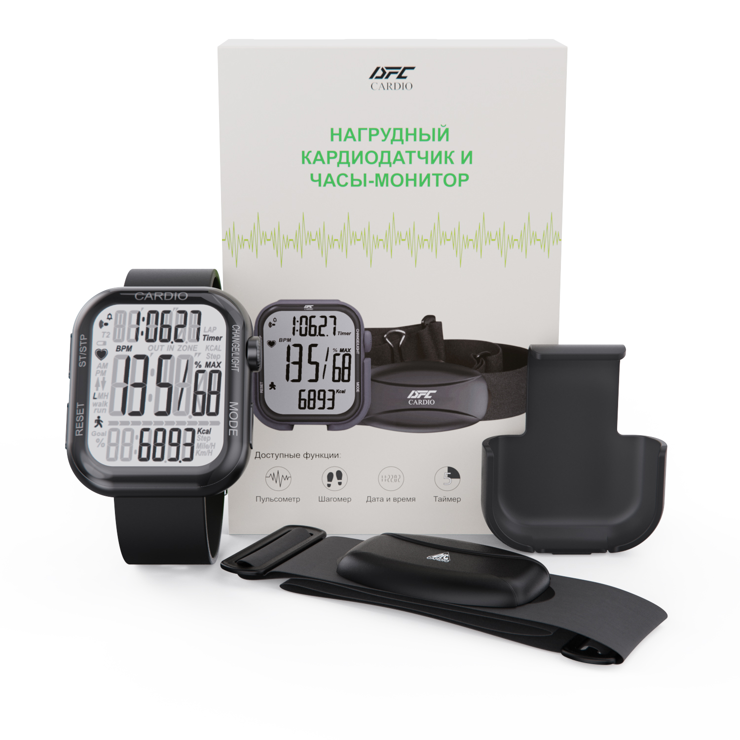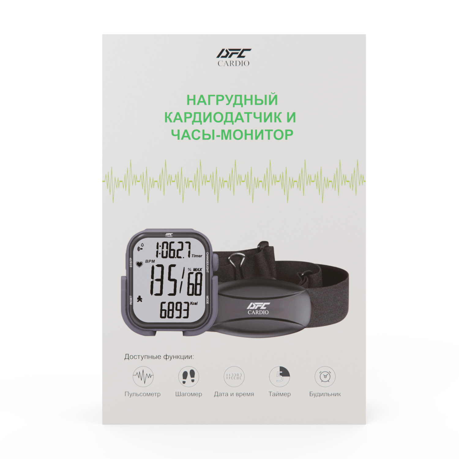 Нагрудный кардиодатчик и часы-монитор (комплект) DFC W585C — это универсальный комплект для домашнего и спортивного использования. Устройство осуществляет точный мониторинг пульса с помощью аналоговой беспроводной передачи данных (5.3K), а все показатели в реальном времени отображаются на экране.