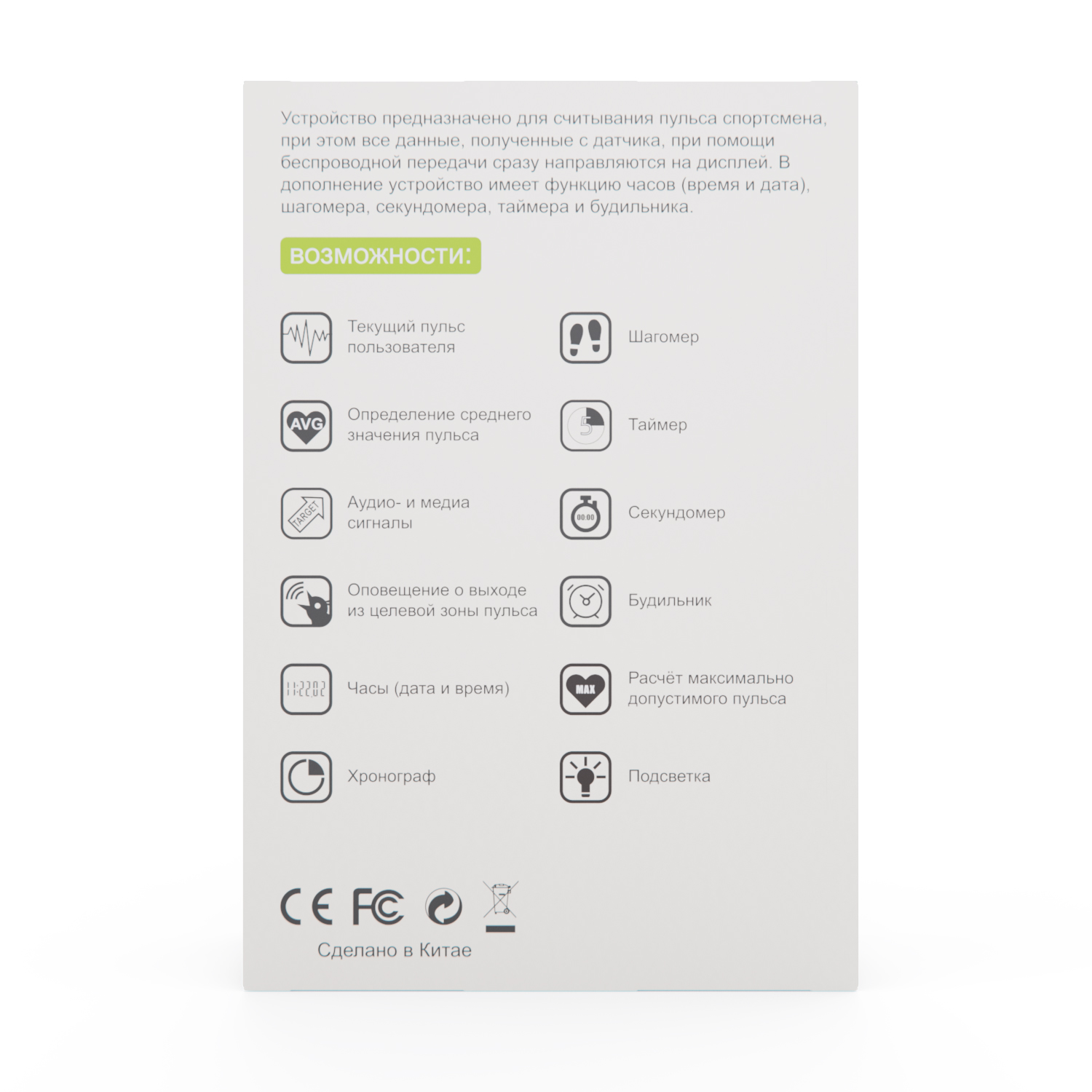 Режим таймера: устройство включает таймер общего времени тренировки, а также таймер пребывания в целевой пульсовой зоне, что помогает соблюдать нужную нагрузку.