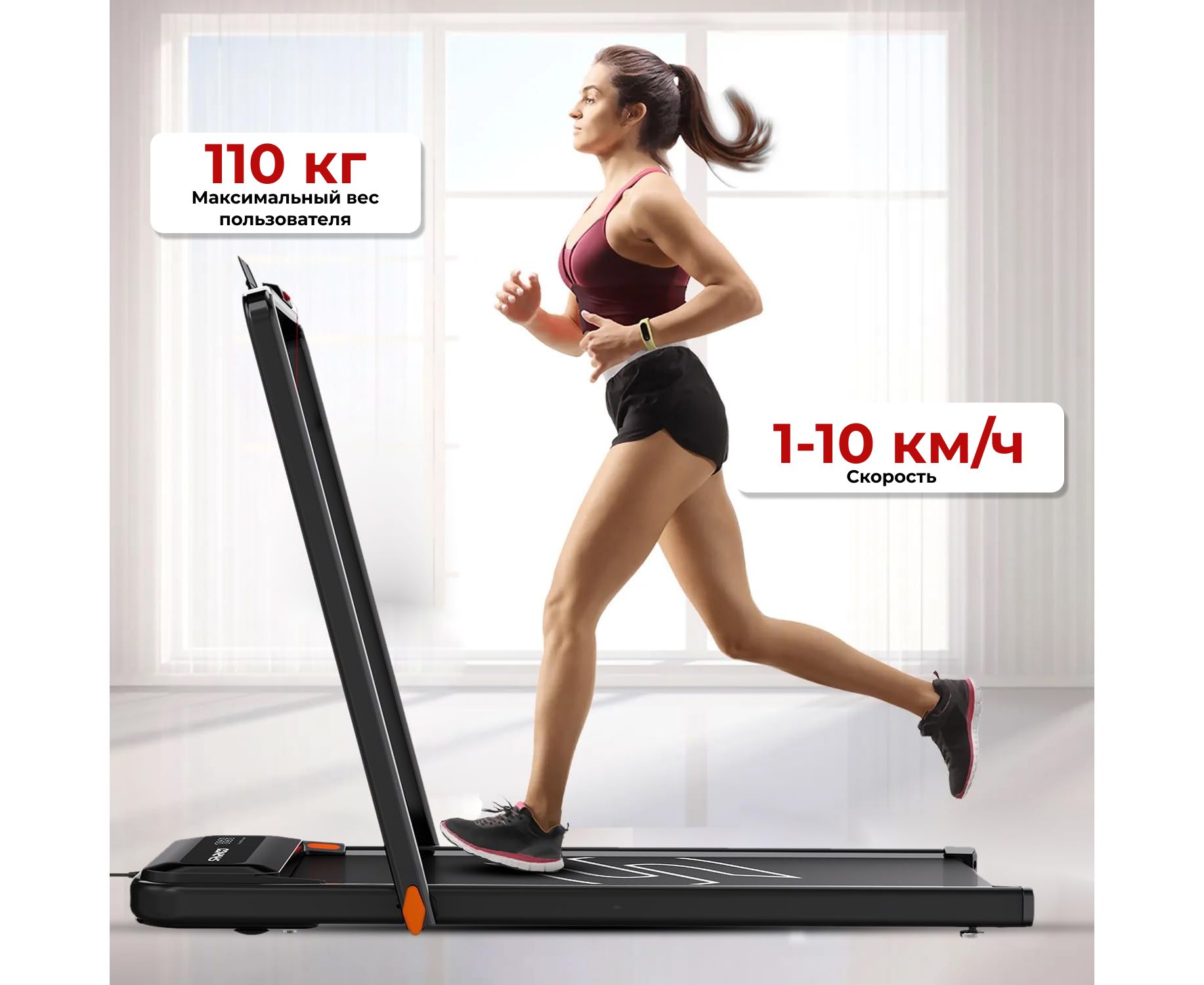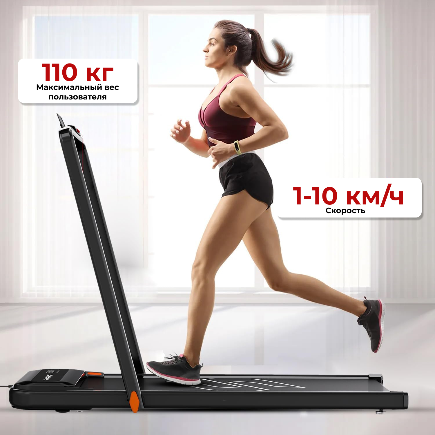 Беговая дорожка рассчитана на пользователей с весом до 110 кг, что делает её универсальной для большинства людей. Беговая дорожка оснащена мощным двигателем с пиковым значением 2,5 л/с, который обеспечивает стабильную работу и хорошую динамику при тренировках. Скорость дорожки регулируется в диапазоне от 1 до 10 км/ч, что позволяет выбрать подходящий темп для любого уровня подготовки.