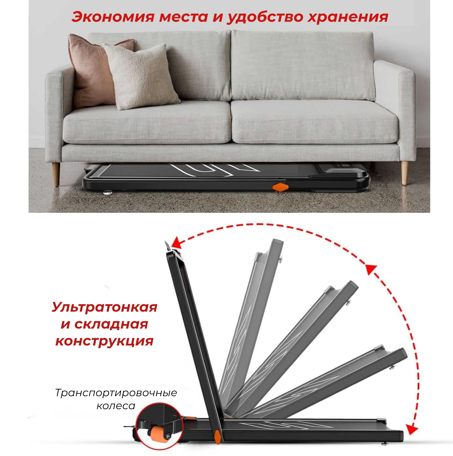 Транспортировочные ролики обеспечивают лёгкость и удобство перемещения беговой дорожки по дому, без необходимости прилагать усилия. Благодаря компактным размерам и продуманной конструкции, её легко разместить даже в ограниченном пространстве — после тренировки дорожку можно быстро передвинуть и освободить место.