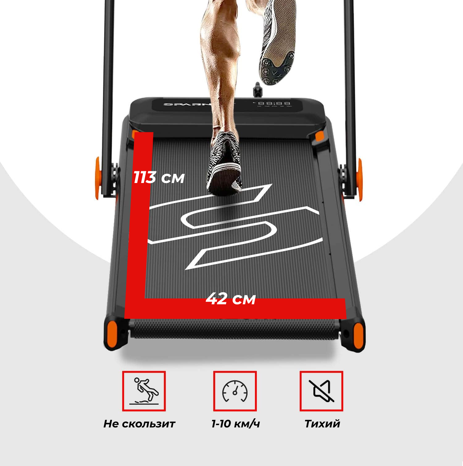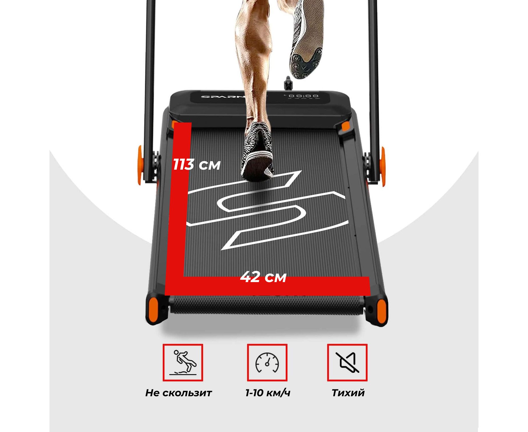 Широкое и комфортное беговое полотно 113 х 42 см обеспечивает естественный шаг и удобство при каждой тренировке. Система с 8 амортизаторами эффективно снижает ударную нагрузку на суставы, обеспечивая комфорт и безопасность во время тренировки, особенно при длительных занятиях. Это особенно важно для пользователей с чувствительными суставами или в период восстановления после травм.