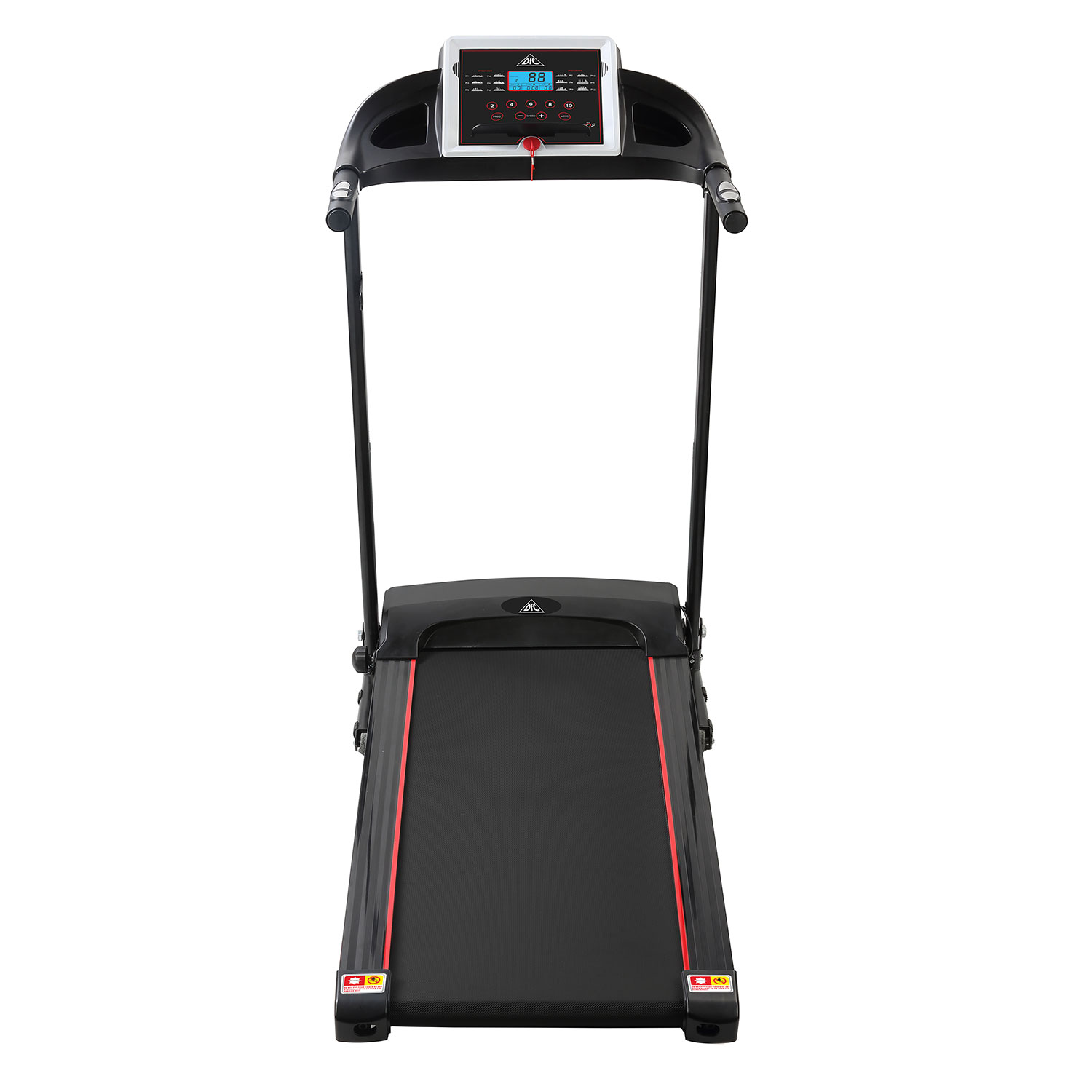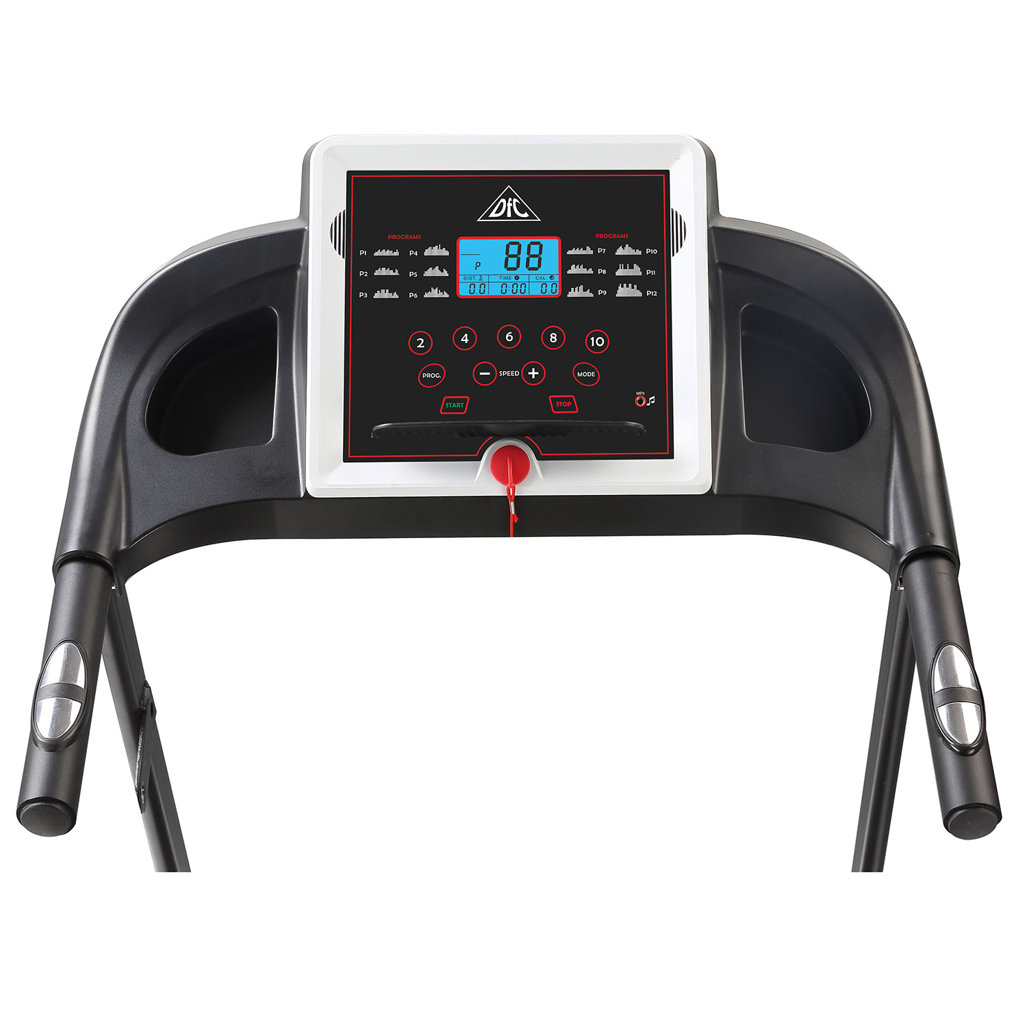 На поручнях расположены датчики пульса. Для точности измерения частоты сердечных сокращений (ЧСС) во время тренировки рекомендуем приобрести отдельно набор DFC W117: кардиопояс + часы - монитор. Консоль показывает: скорость, время, расстояние, калории, пульс.