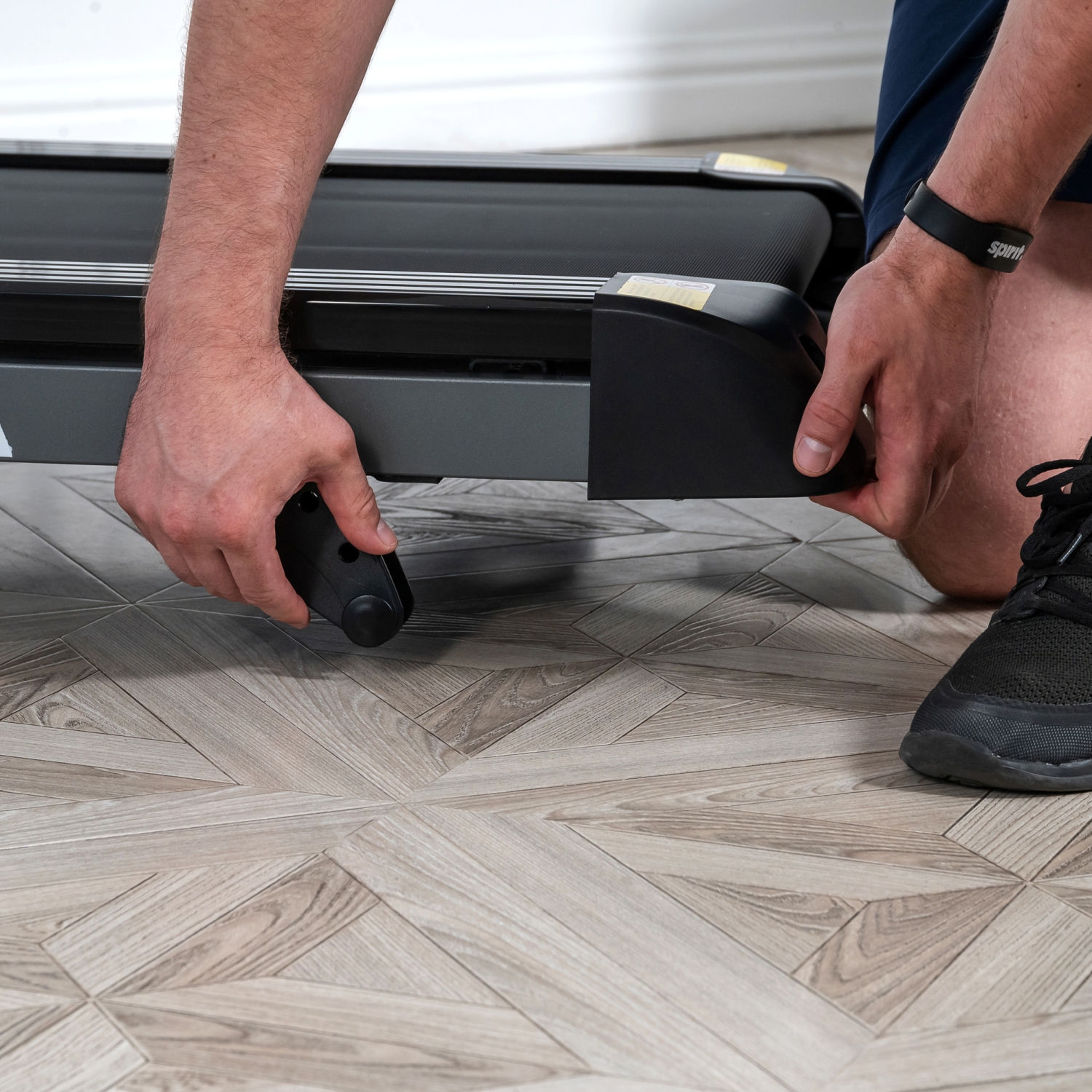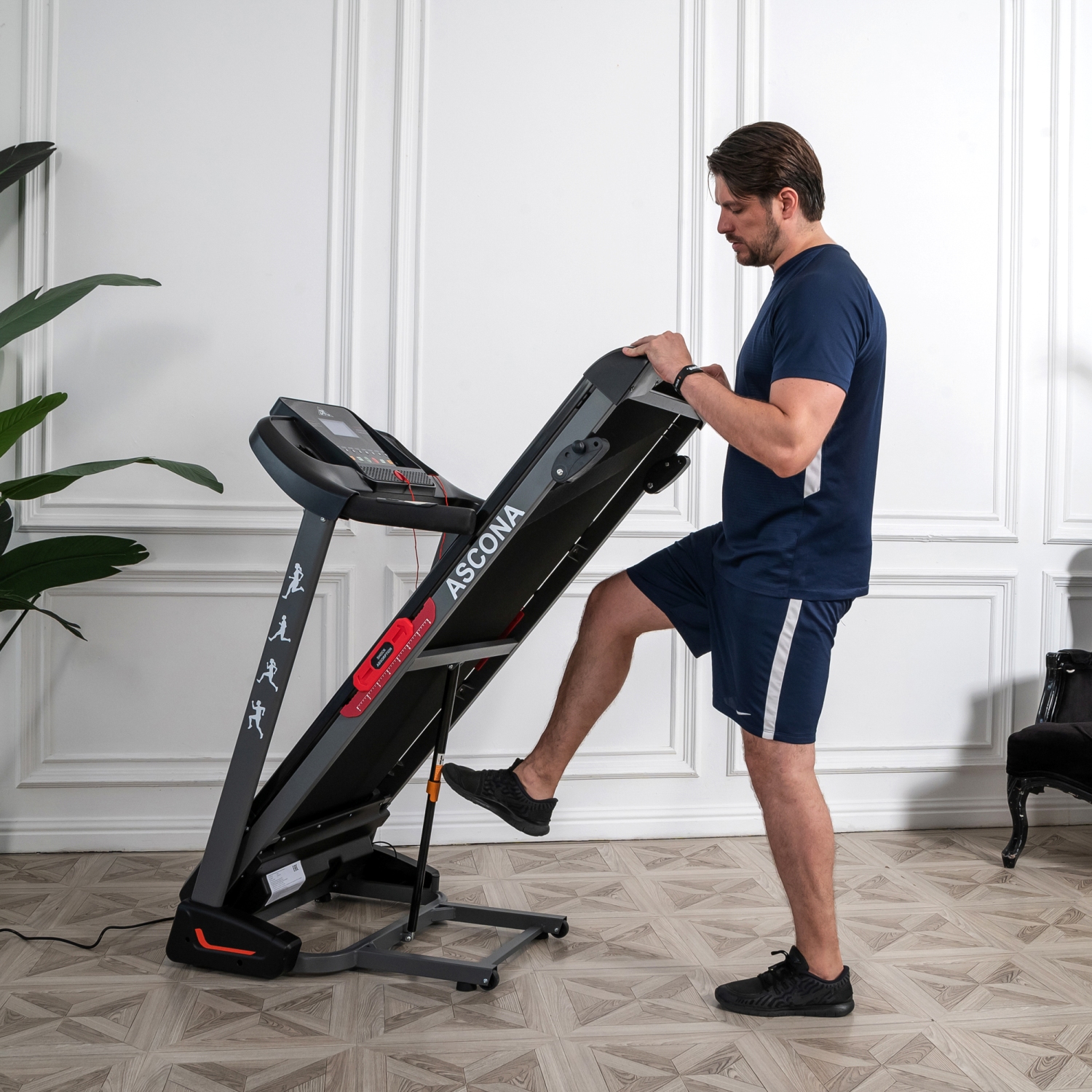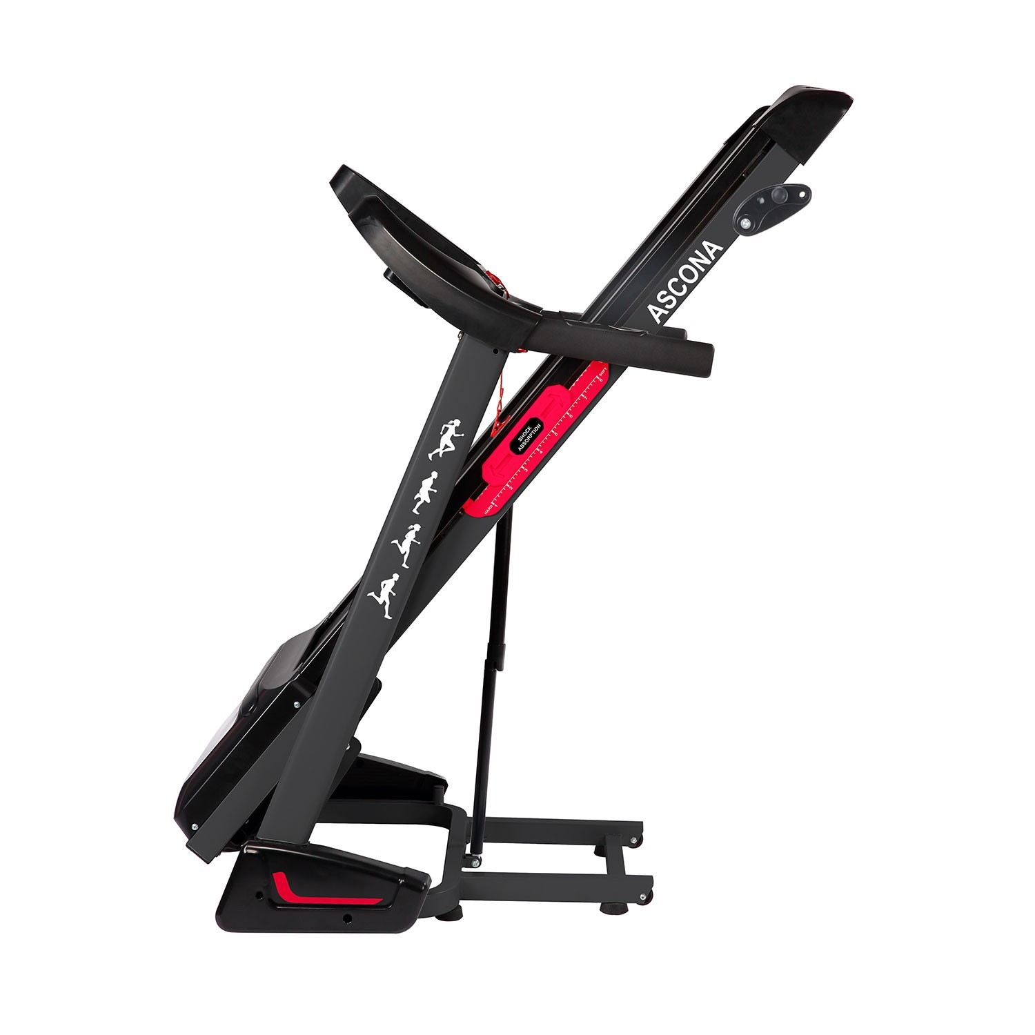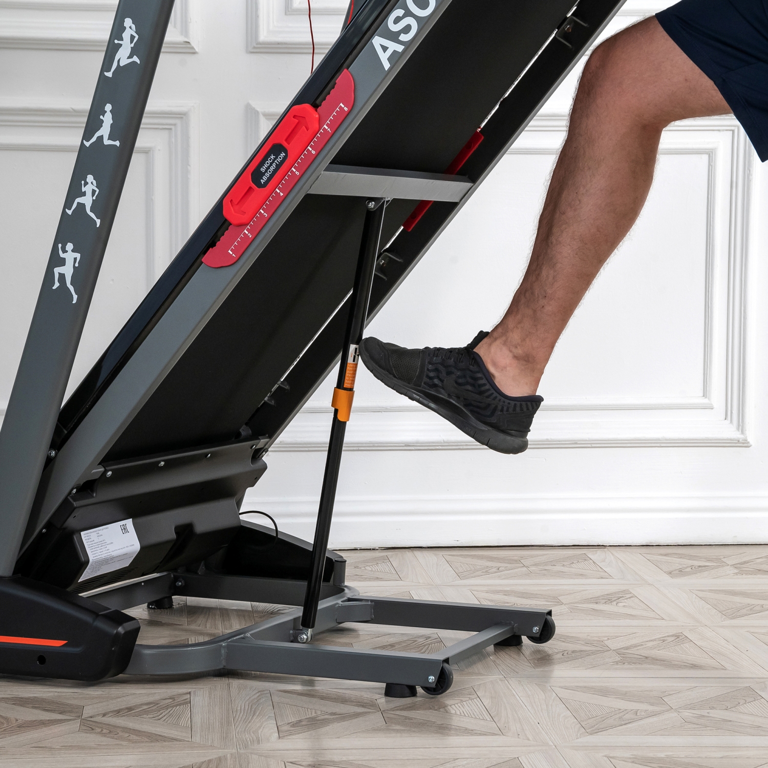 Дорожка имеет складную конструкцию для экономии жизненного пространства с помощью гидроцилиндра. И встроенные колеса для перемещения дорожки после тренировки.