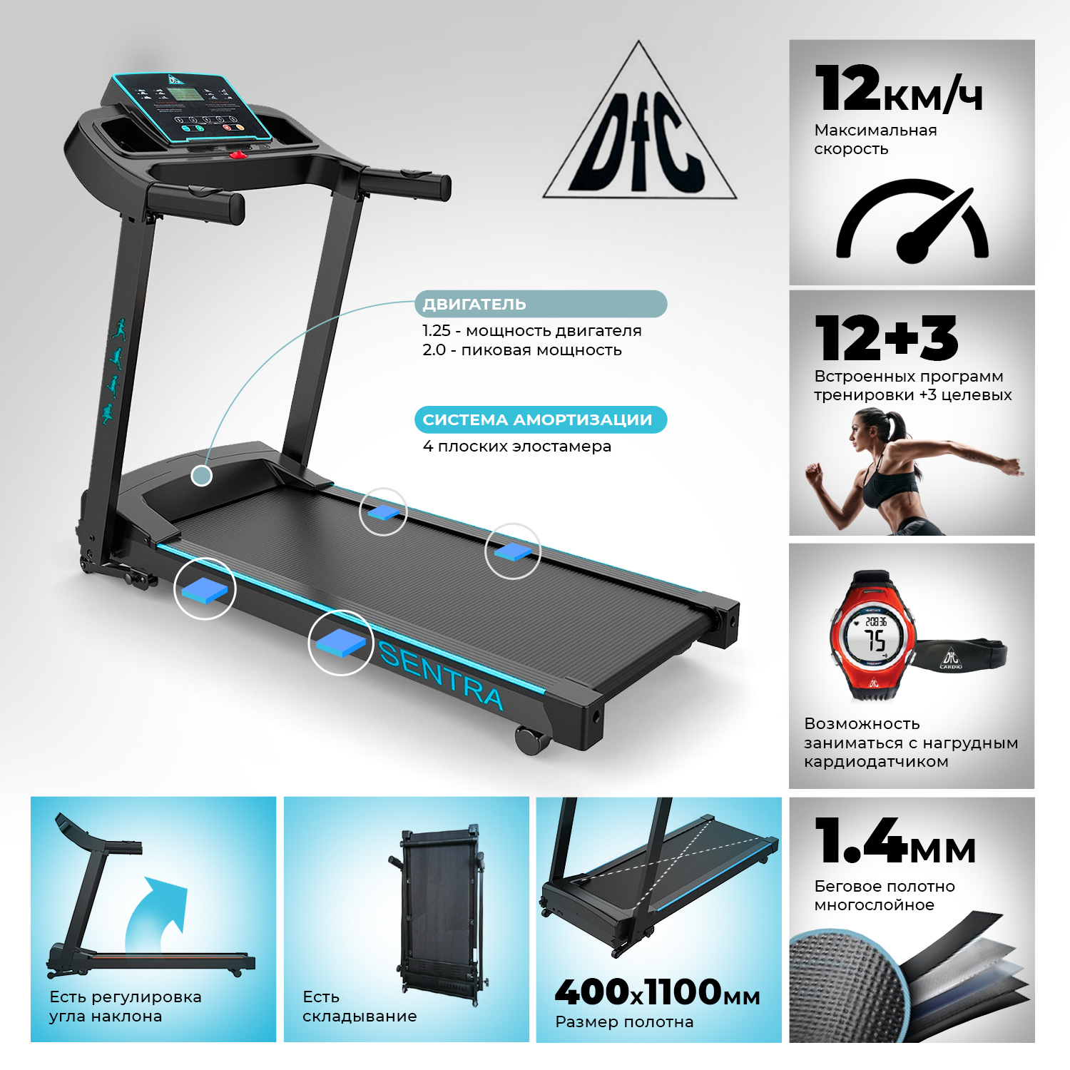 Представляем новую компактную беговую дорожку DFC SENTRA на базе популярной модели KENGURY. Новая информативная консоль с удобными подстаканниками по краям.