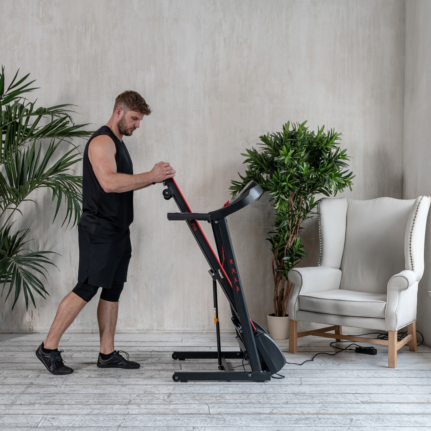 Складная конструкция с помощью встроенного амортизатора позволяет поднять полотно после тренировки и экономить пространство до следущего занятия.