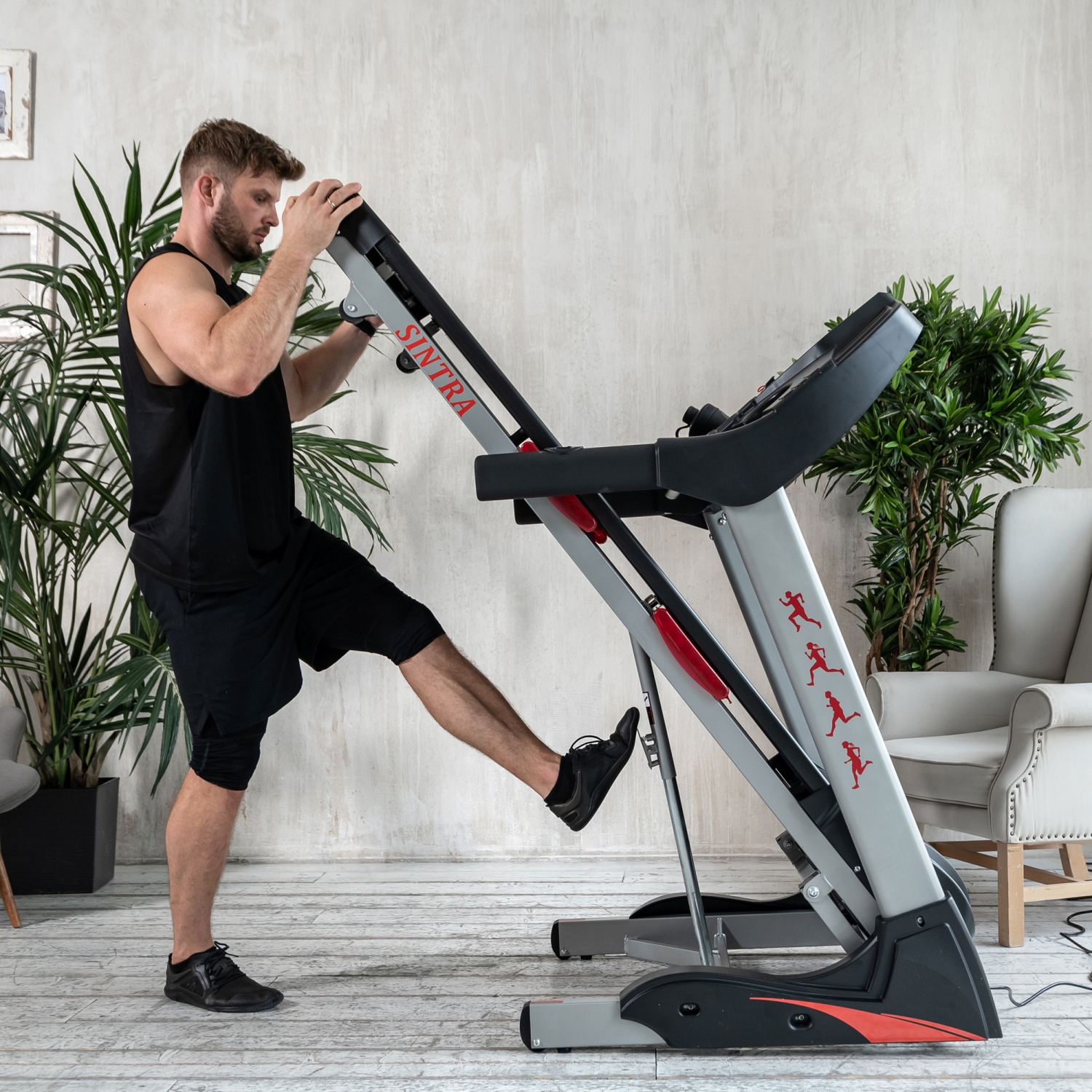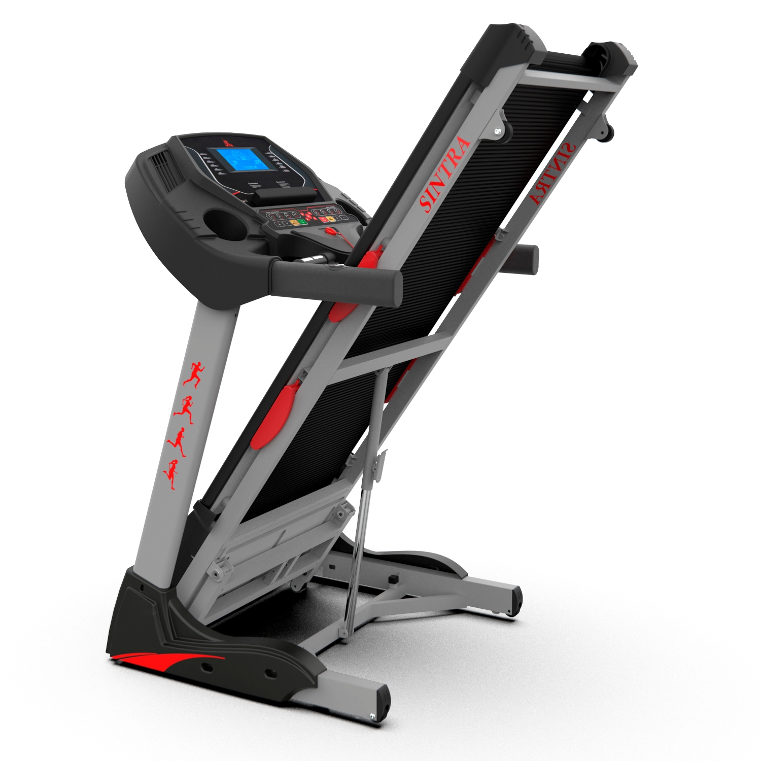 Дорожка имеет складную конструкцию для экономии жизненного пространства с помощью гидроцилиндра. И встроенные колеса для перемещения дорожки после тренировки.