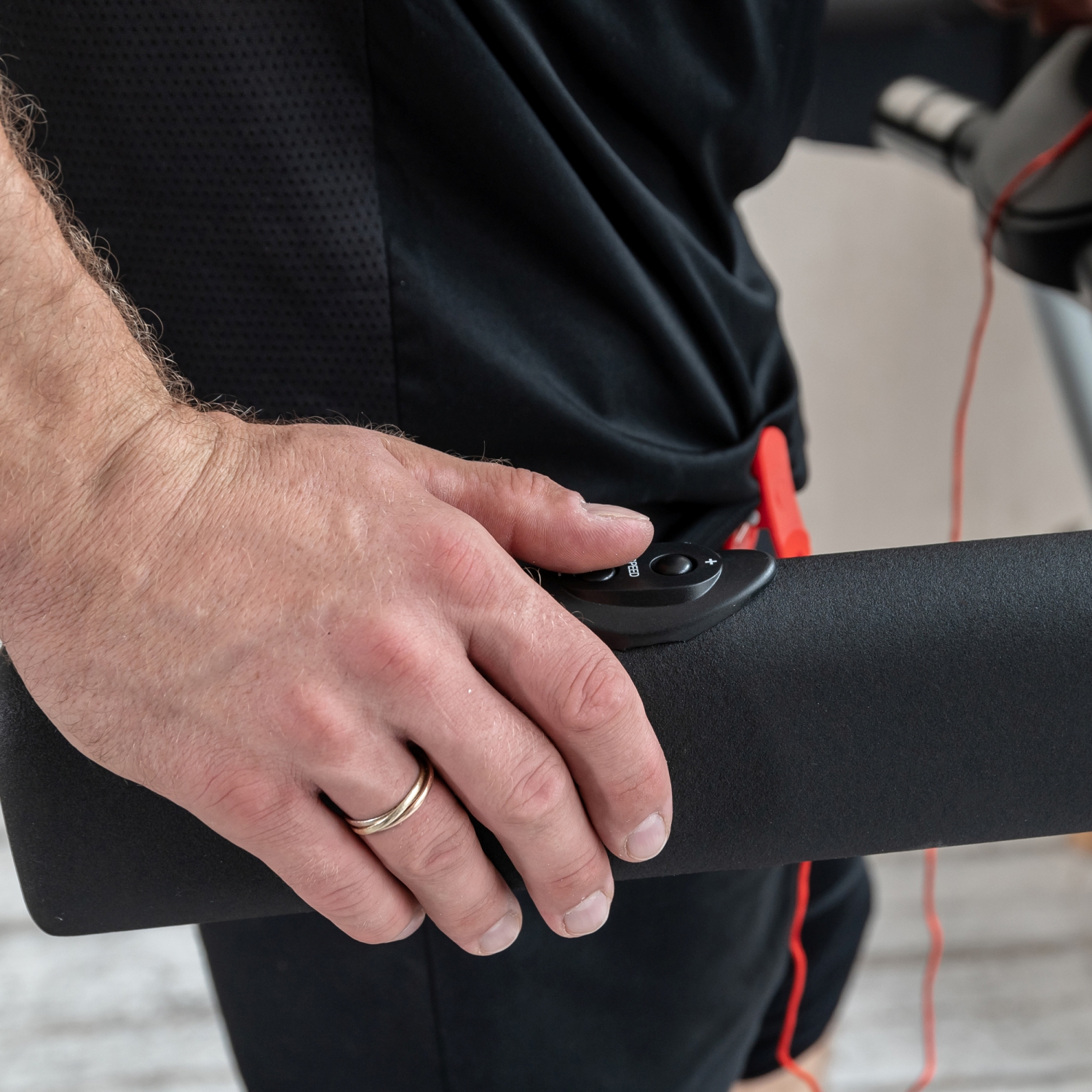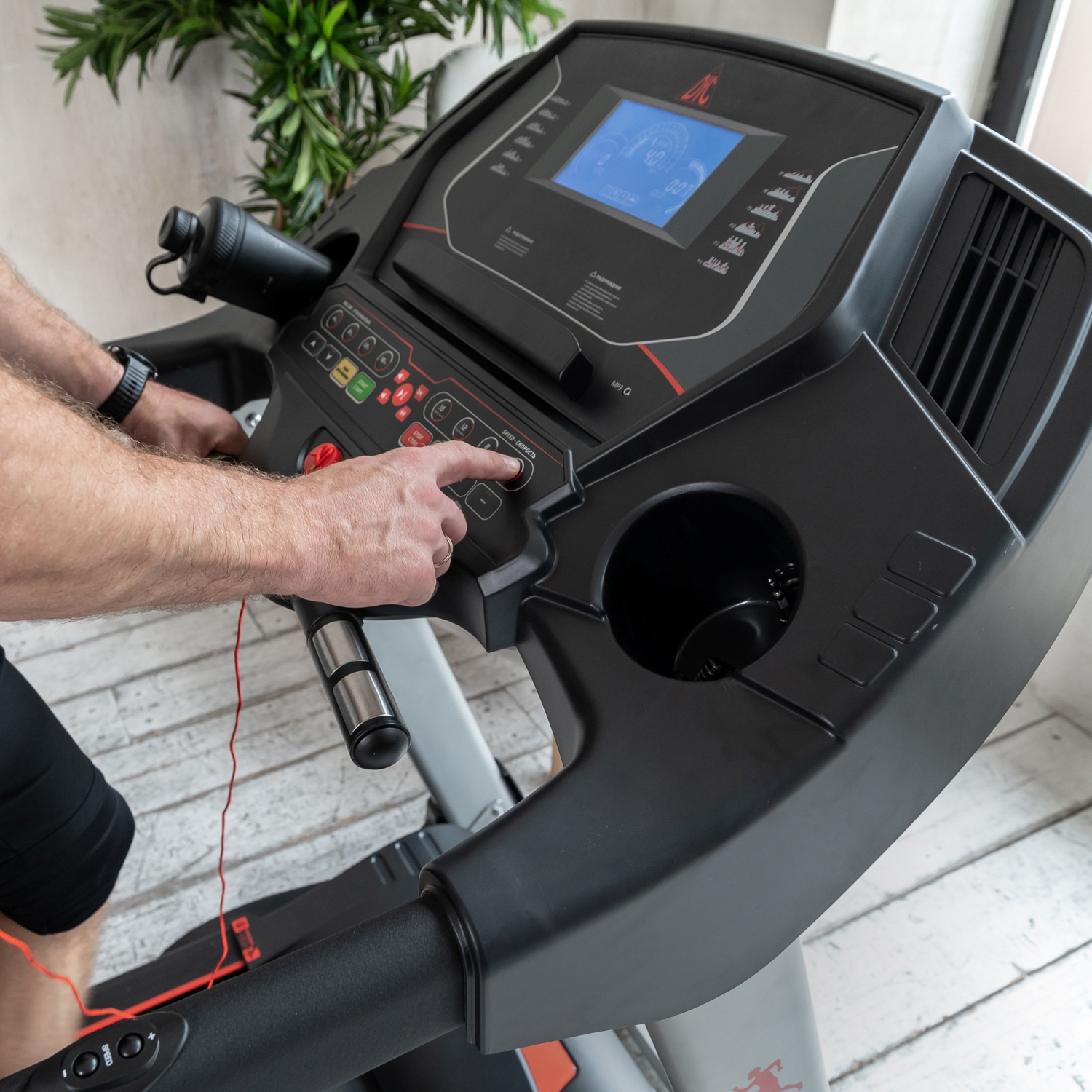 На поручнях так же расположены "быстрые кнопки" - это кнопки запуска и остановки бегового полотна, а так же кнопки изменения скорости. Это позволяет не отрывать руки с поручней во время занятий не тренажере.