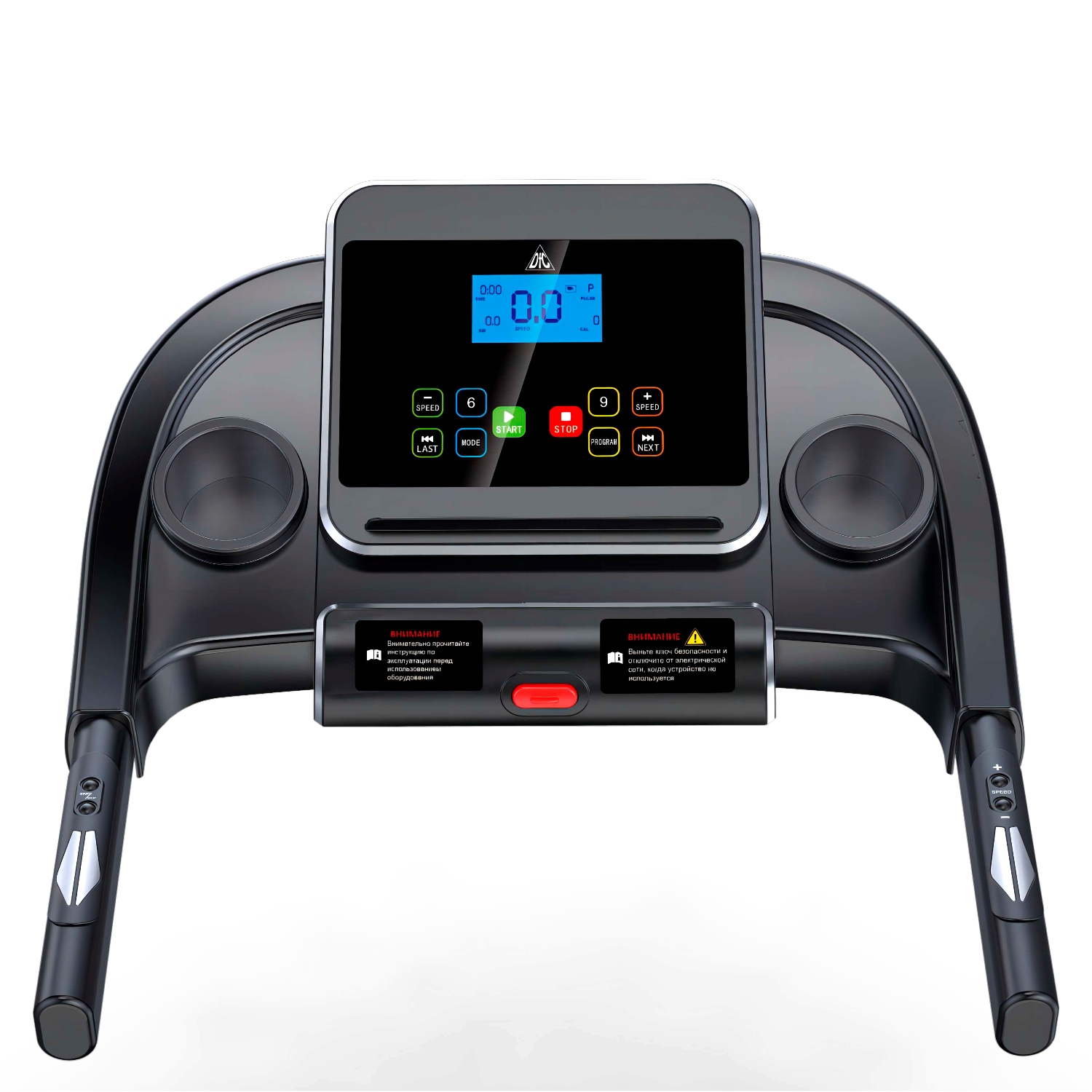 Консоль отображает скорость, время, расстояние, калории и пульс. Дорожка предусмотрена 12 программами тренировки, 3 ручными режимами и режимом тестирования. Скорость регулируется с помощью консоли и на поручнях, также на поручнях располагаются кнопки START/STOP. На панели консоли располагаются 2 кармана для бутылки и подставка под планшет.