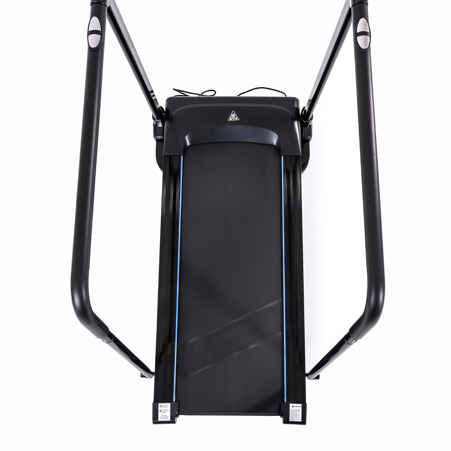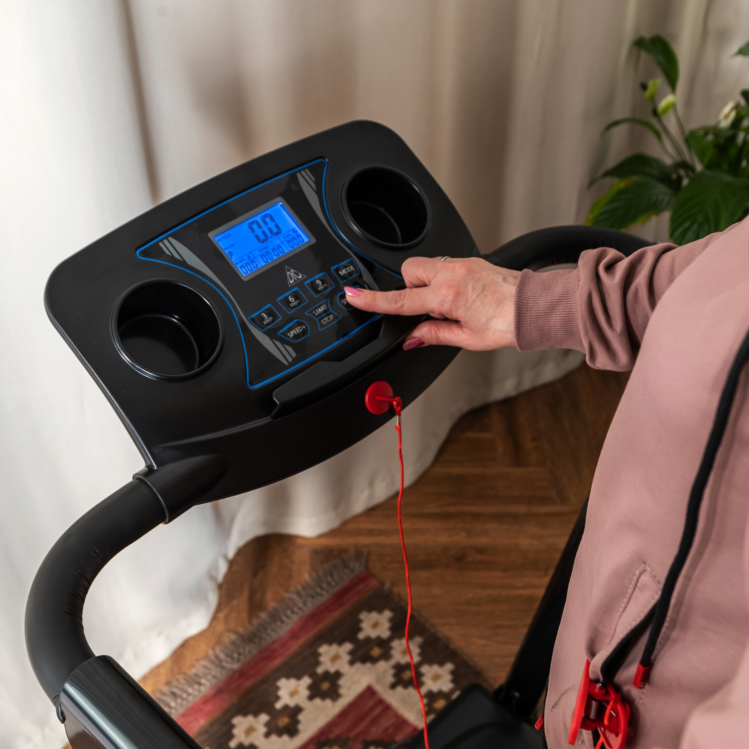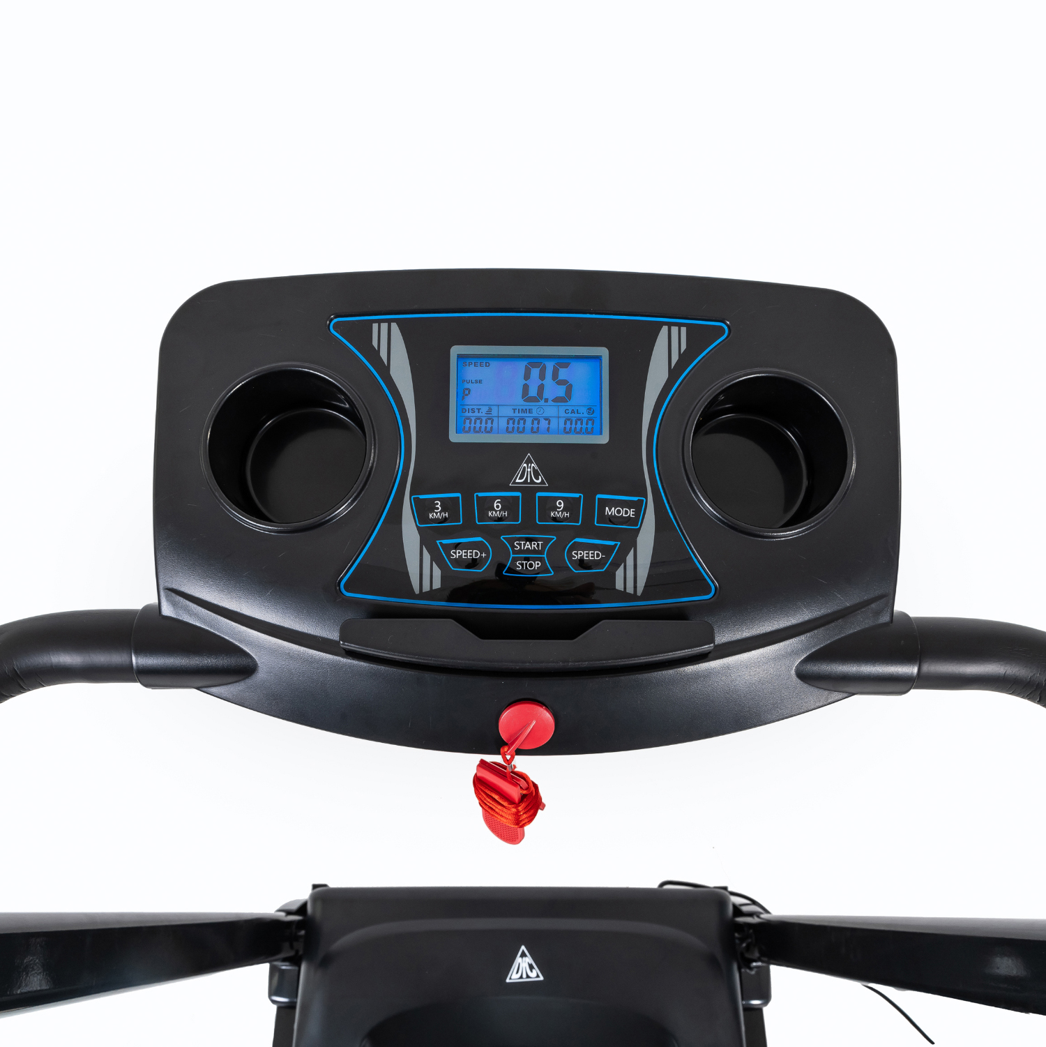 Дорожка с поручнями для реабилитации, на которых располагаются сенсорные датчики пульса. В комплекте ключ безопасности для аварийной остановки. На консоли расположены держатель для планшета и 2 подстаканника, а также ЖК-дисплей с голубой подсветкой. Дисплей отображает такие параметры как скорость, время, расстояние, пульс и калории.