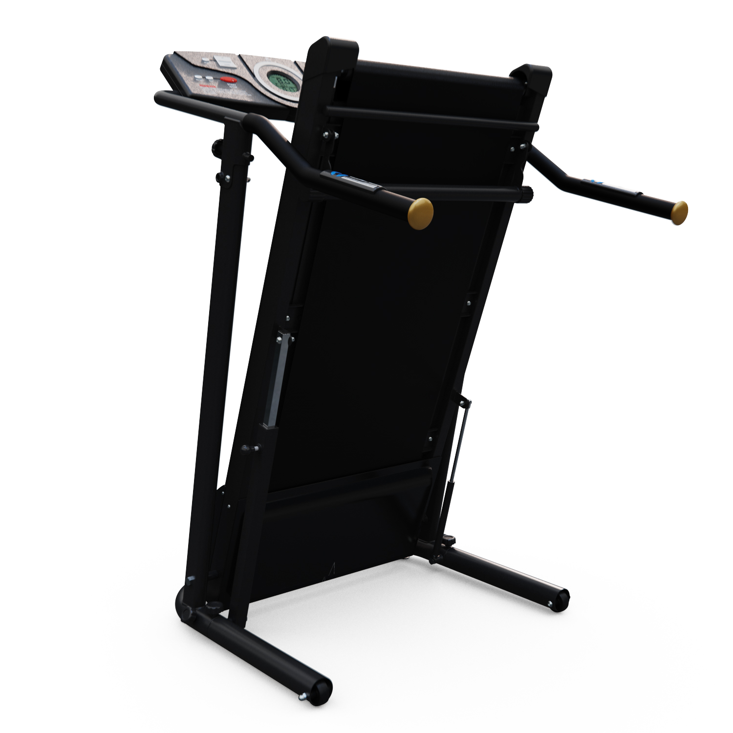 Дорожка легко складывается и перемещается с помощью транспортировочных роликов. Датчики пульса на поручнях помогут измерить частоту сердечных сокращений. Показания консоли: скорость, время, расстояние, калории, пульс.