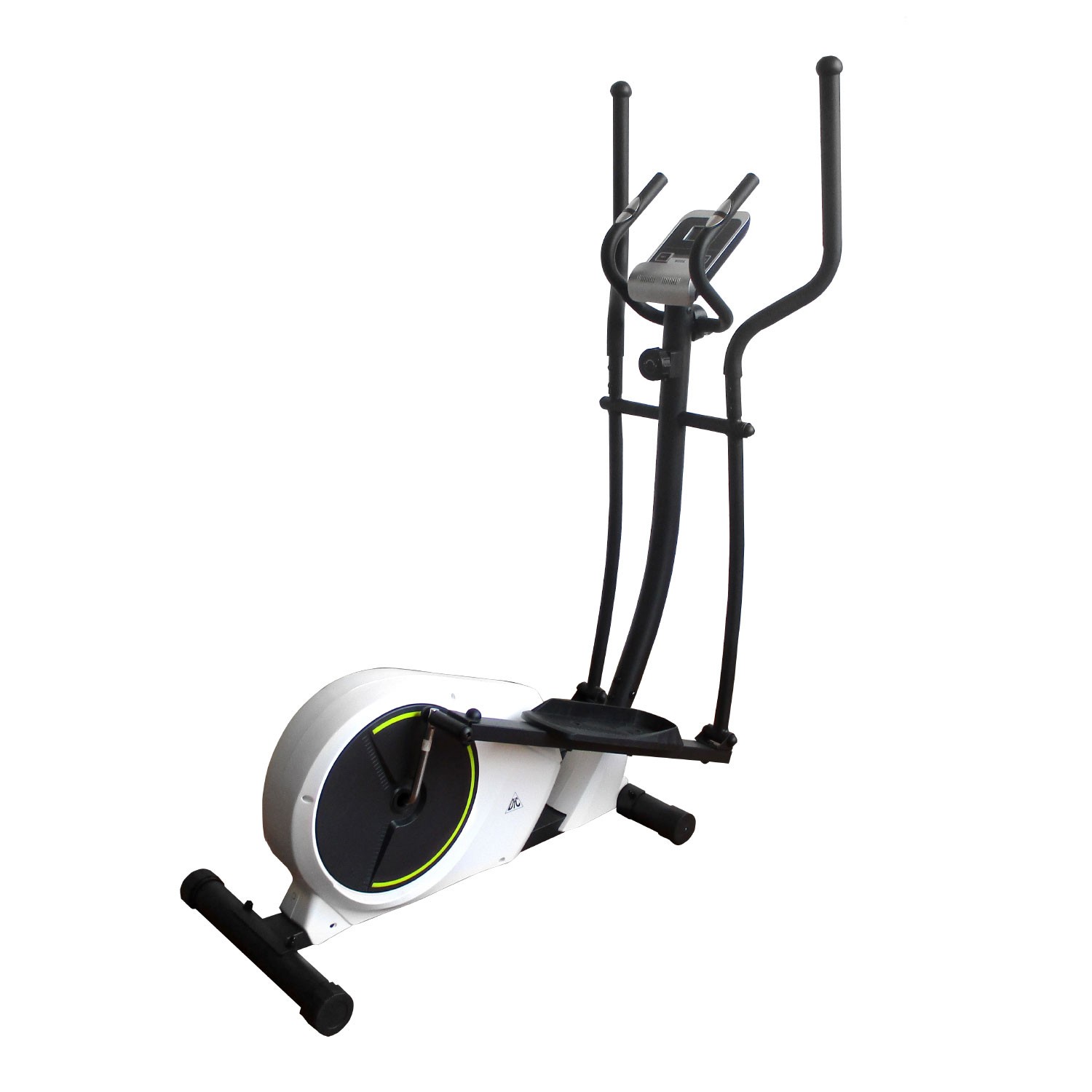 Эллиптический тренажёр DFC E621H для домашнего использования идеально подходит для тренировки всех групп мышц, поддержания тела в тонусе и кардио-тренировок. Выполнен в интересном дизайне: белый корпус маховика с салатовой вставкой, остальные элементы чёрного цвета.