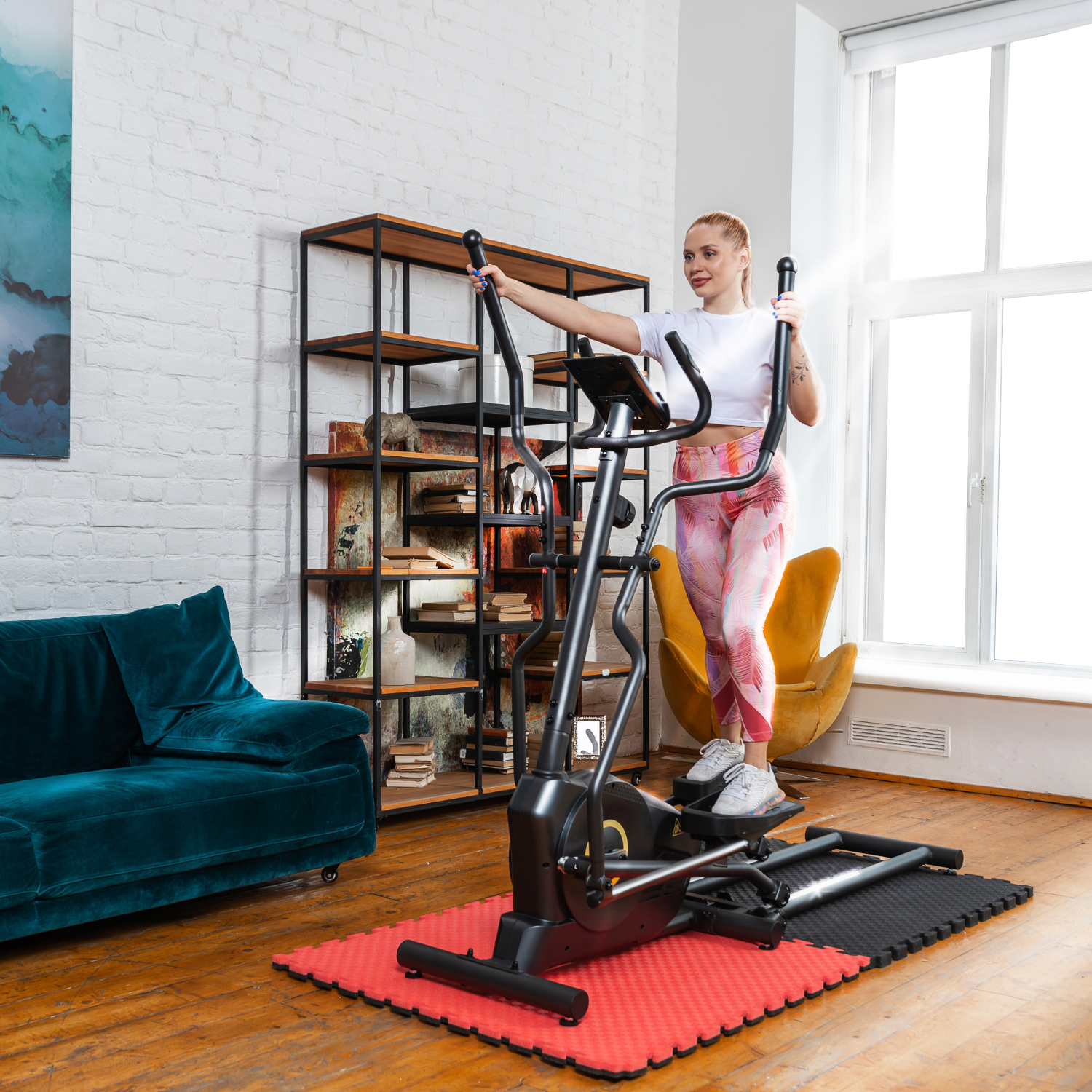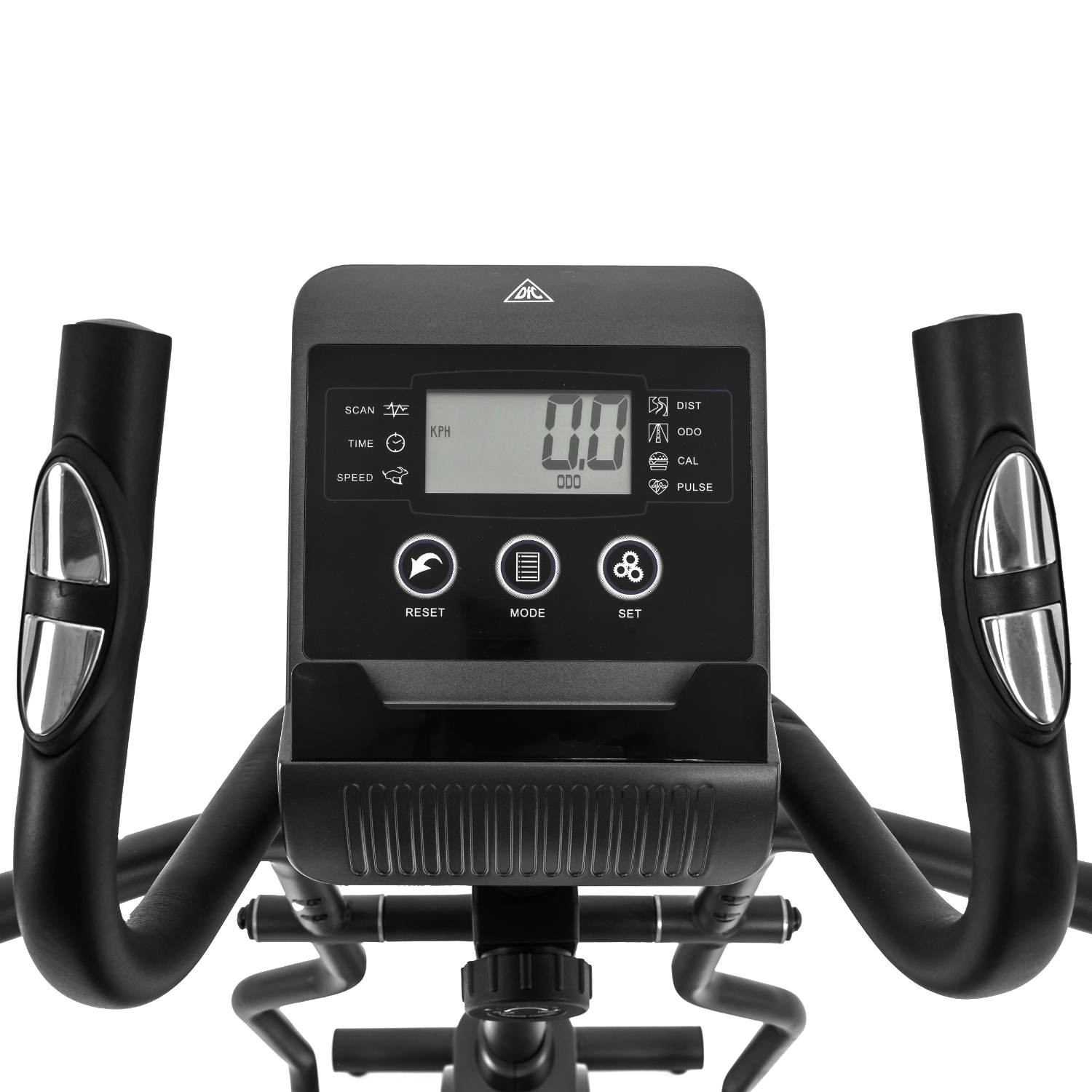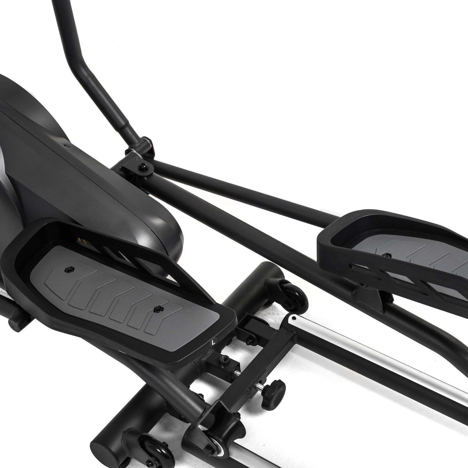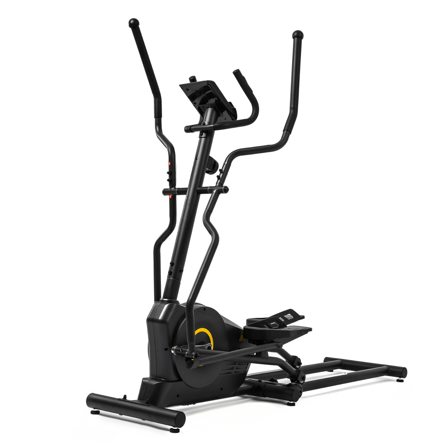 В этой модели эллиптического тренажёра есть всё для комфортных и результативных тренировок. На передней консоли можно удобно разместить планшет. Там же расположен дисплей, где отображаются основные параметры тренировки: скорость, дистанция, количество потраченных калорий, уровень пульса. Пульс считывается при помощи датчиков, расположенных на поручнях.