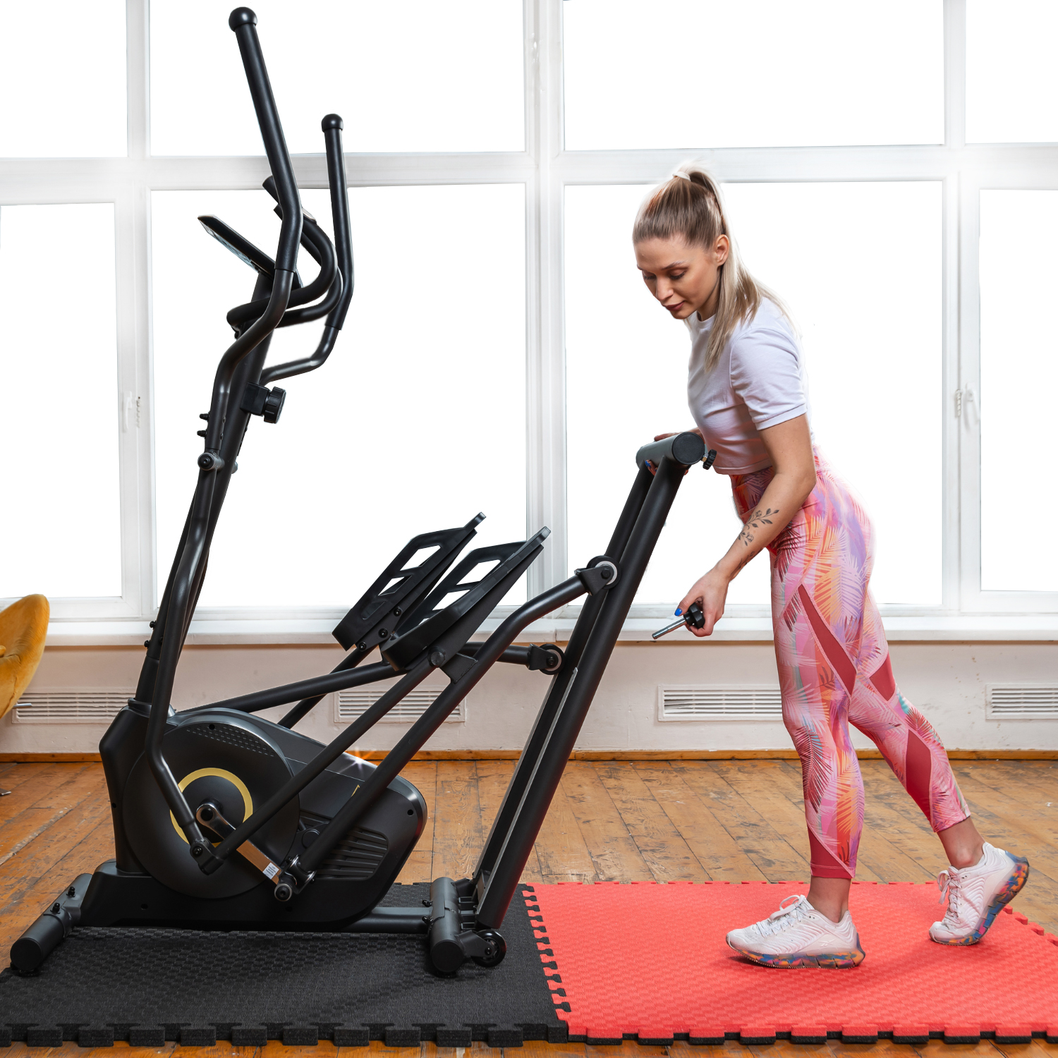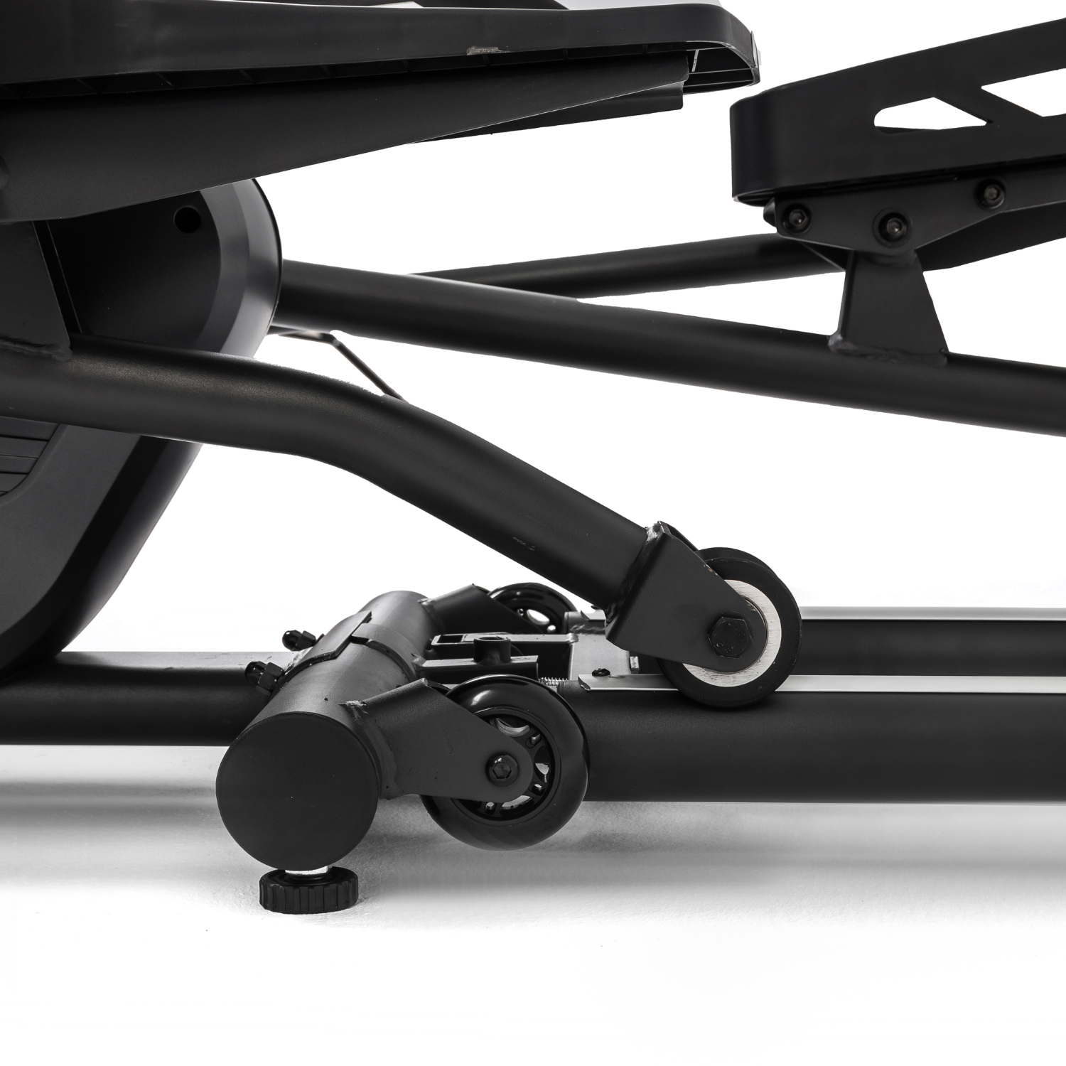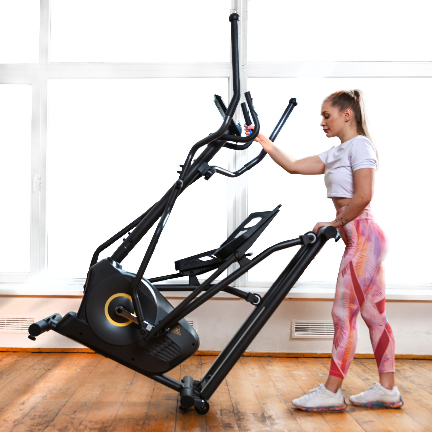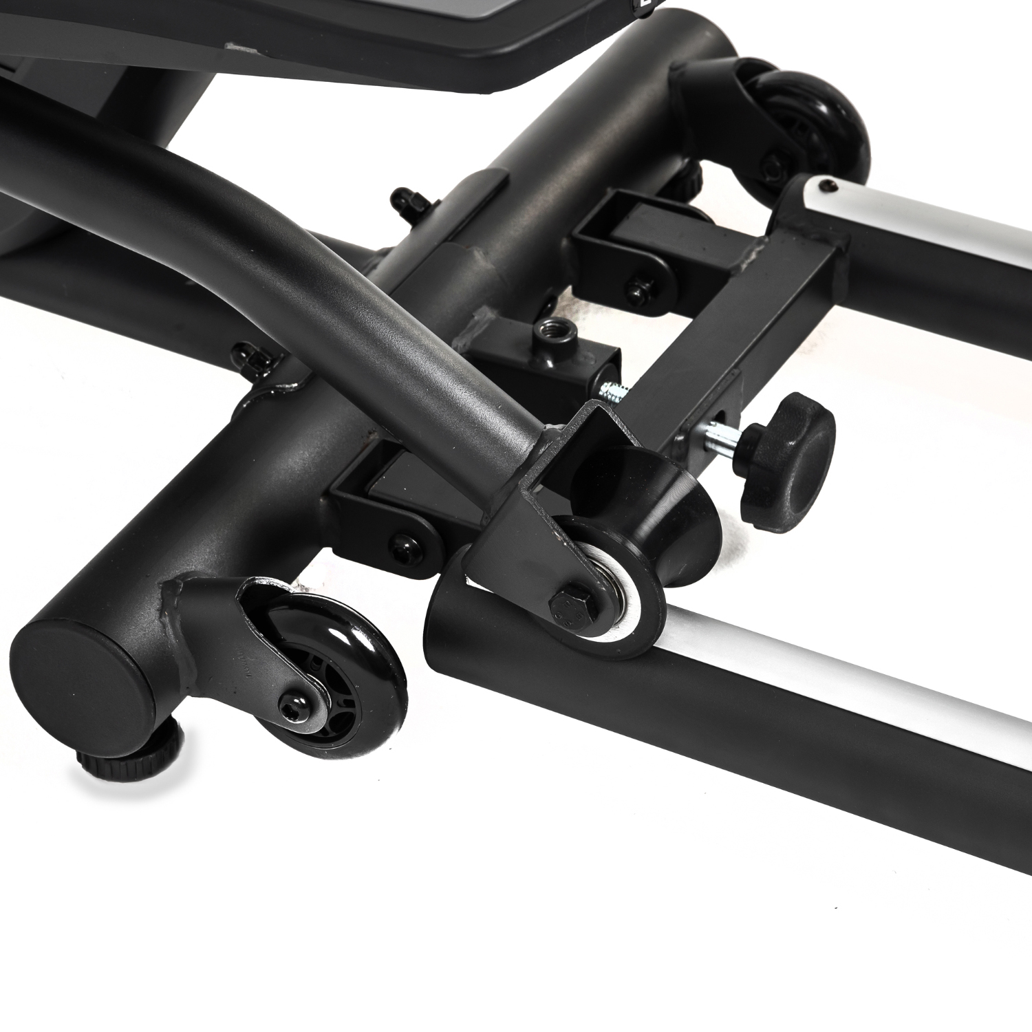 Тренажёр удобно хранить, благодаря складной системе. В сложенном виде он не занимает много пространства. Модель оснащена транспортировочными роликами, что позволяет легко перемещать его в доме или квартире. В комплектацию входят инструменты для сборки.