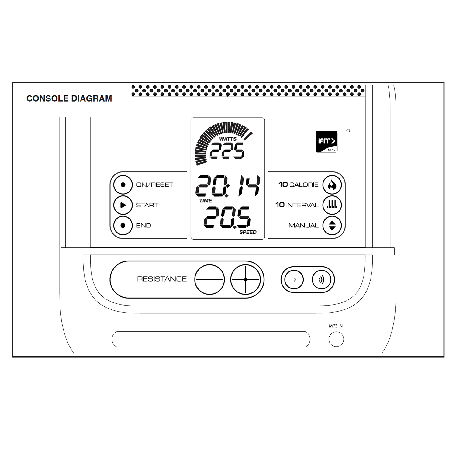 - Показания консоли: скорость, дистанция, время, уровень нагрузки, скорость вращения в оборотах в минуту, калории, сердечный ритм, выходная мощность в Ваттах