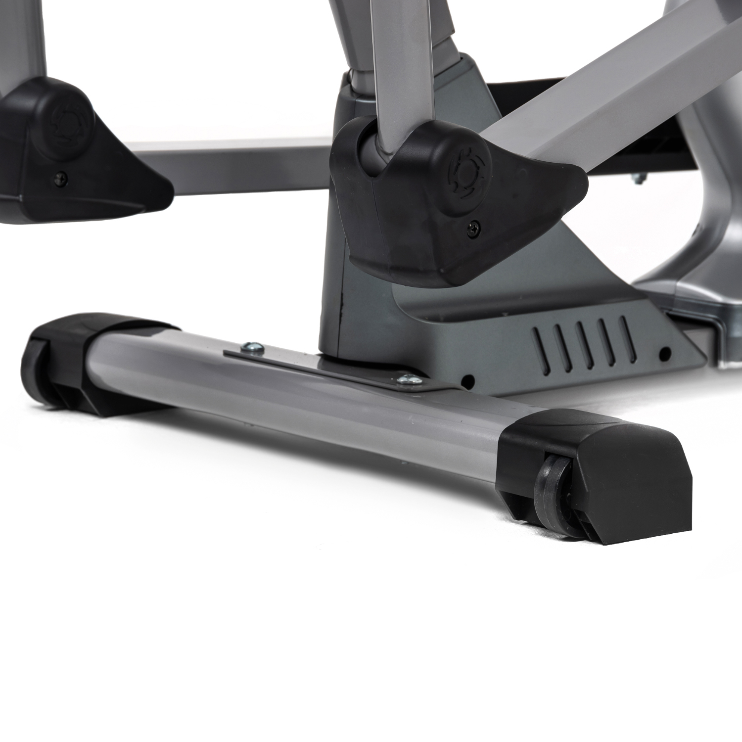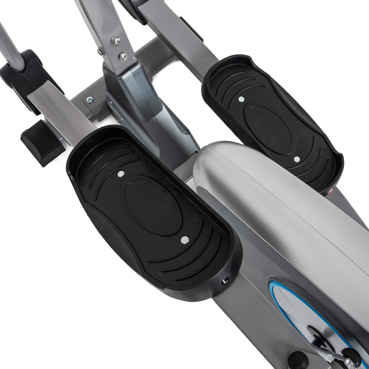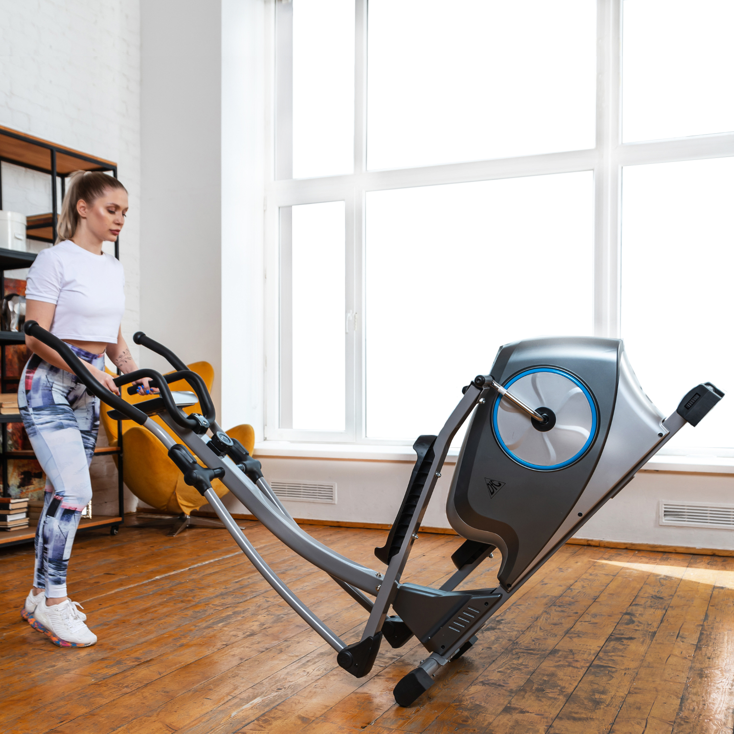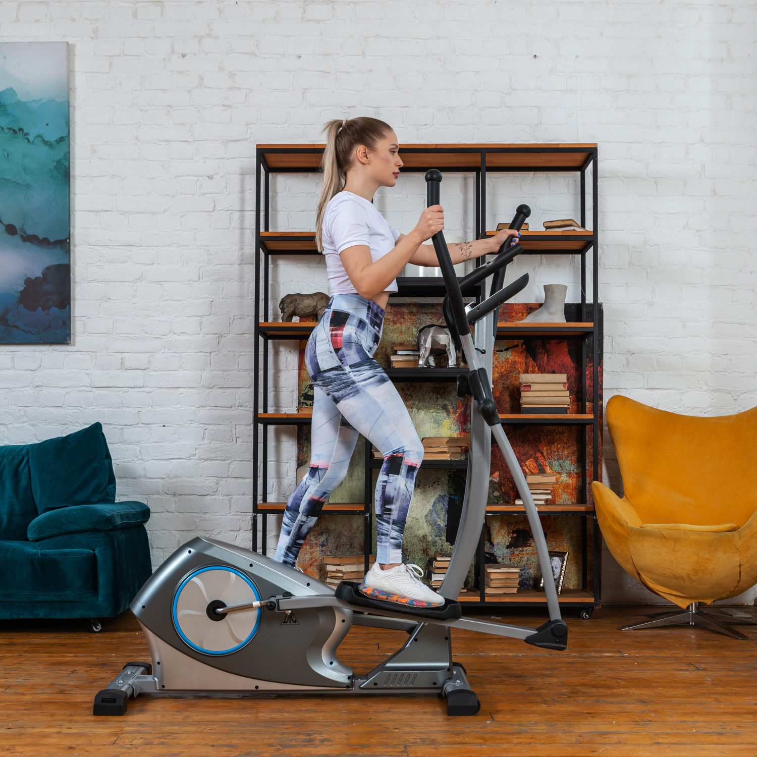 Среднегабаритный эллиптический тренажер для домашнего использования. Тренажер с высокоскоростным маховиком и магнитной системой нагружения. Механическая регулировка нагрузки, 8 фиксируемых положений нагрузки с помощью удобной ручки на стойке тренажера.