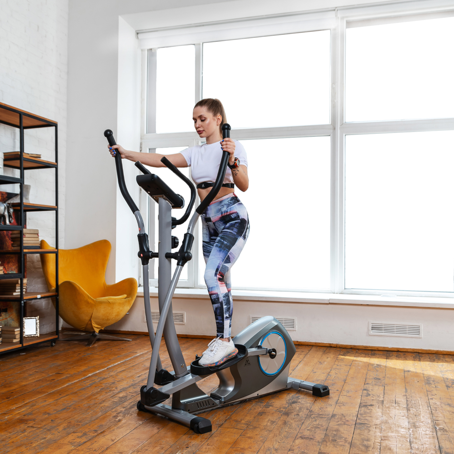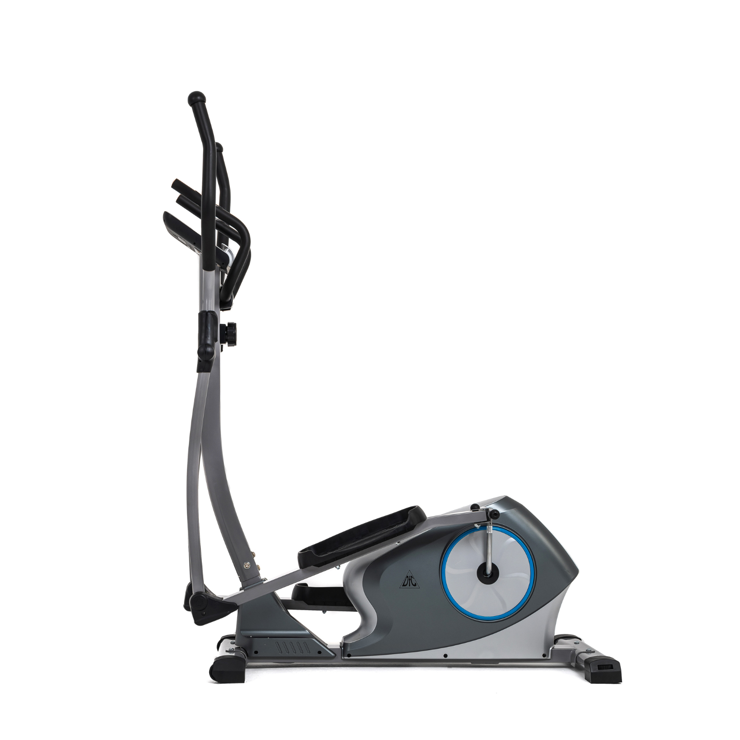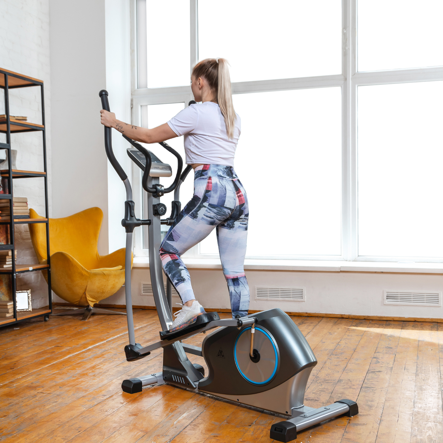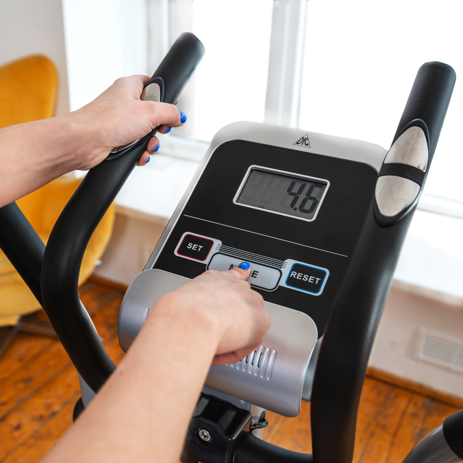 Среднегабаритный эллиптический тренажер для домашнего использования. Тренажер с высокоскоростным маховиком и магнитной системой нагружения. Механическая регулировка нагрузки, 8 фиксируемых положений нагрузки с помощью удобной ручки на стойке тренажера.
