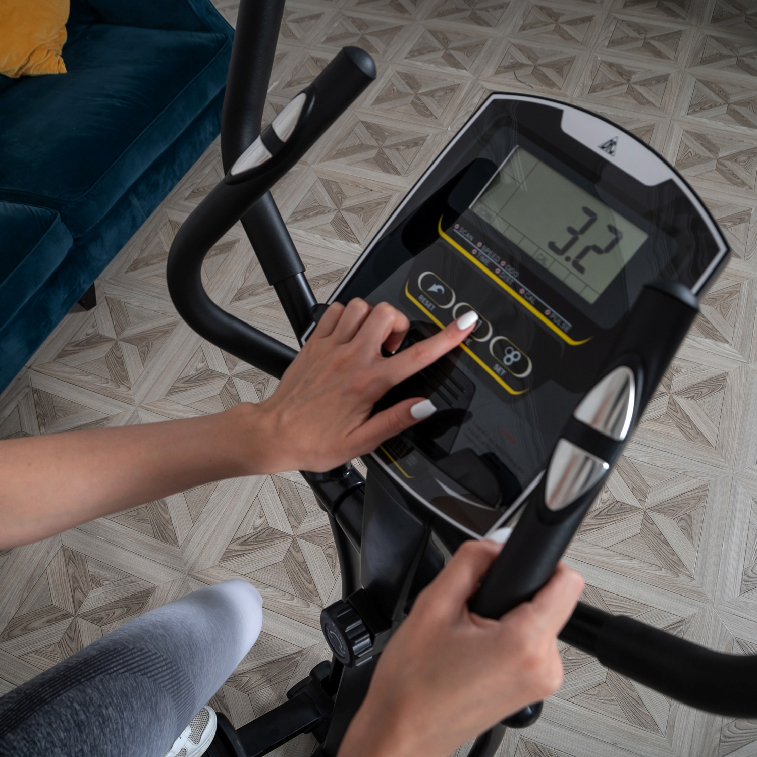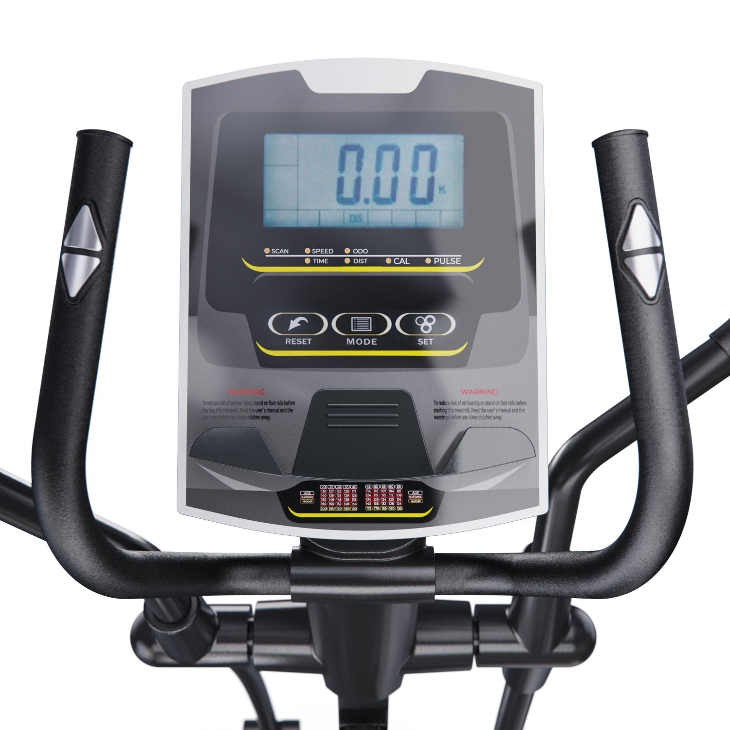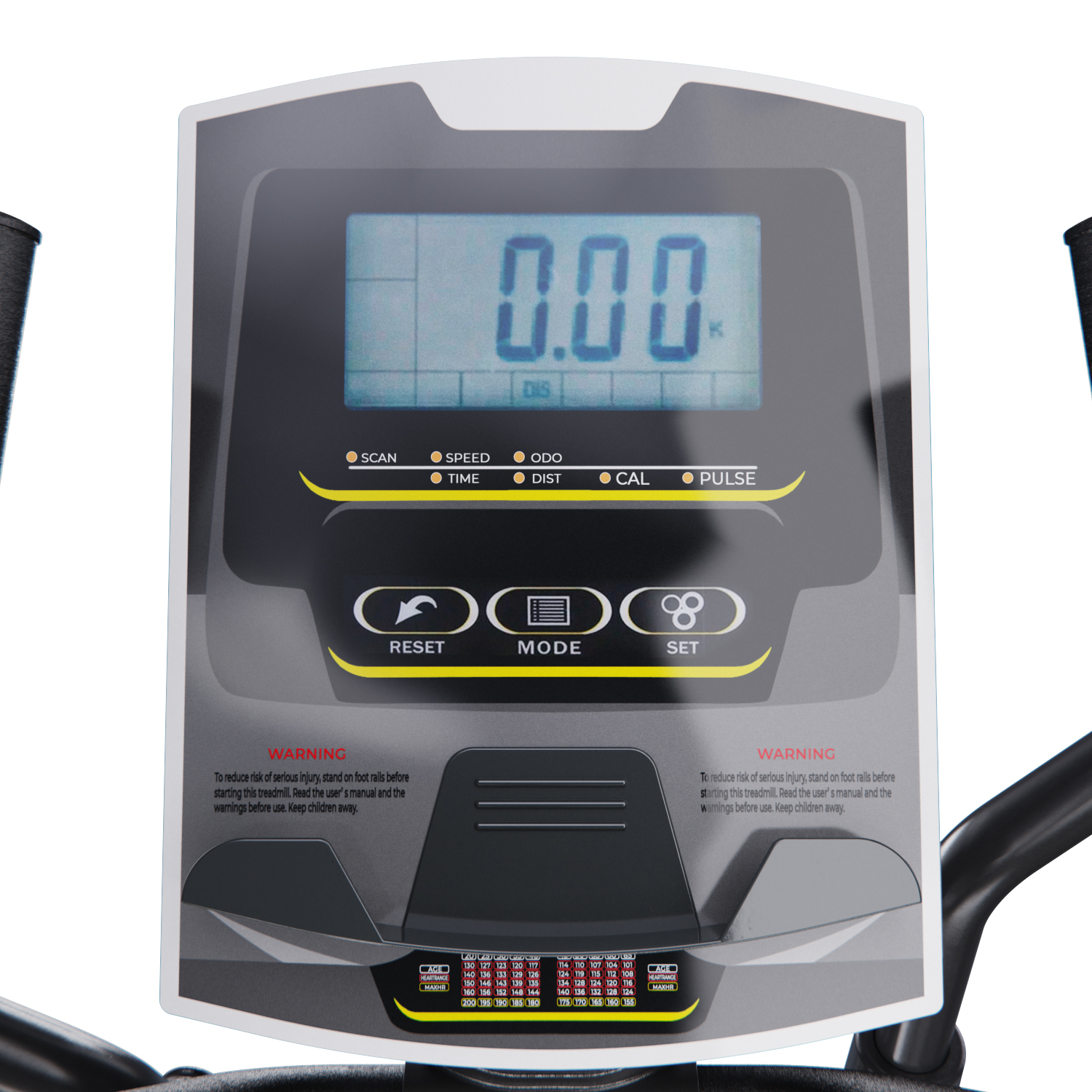 Показания консоли: время, скорость, расстояние, калории, пульс, ODO