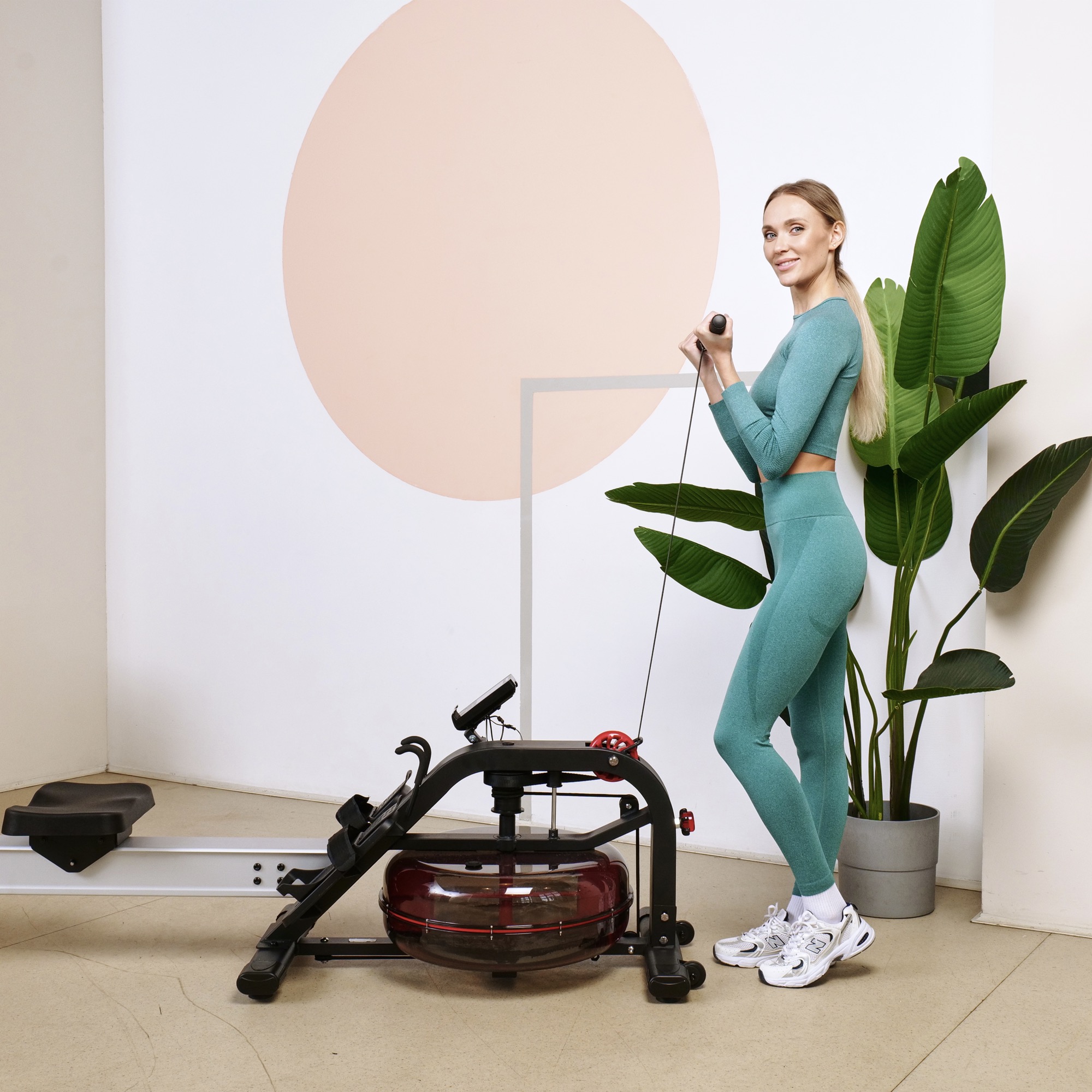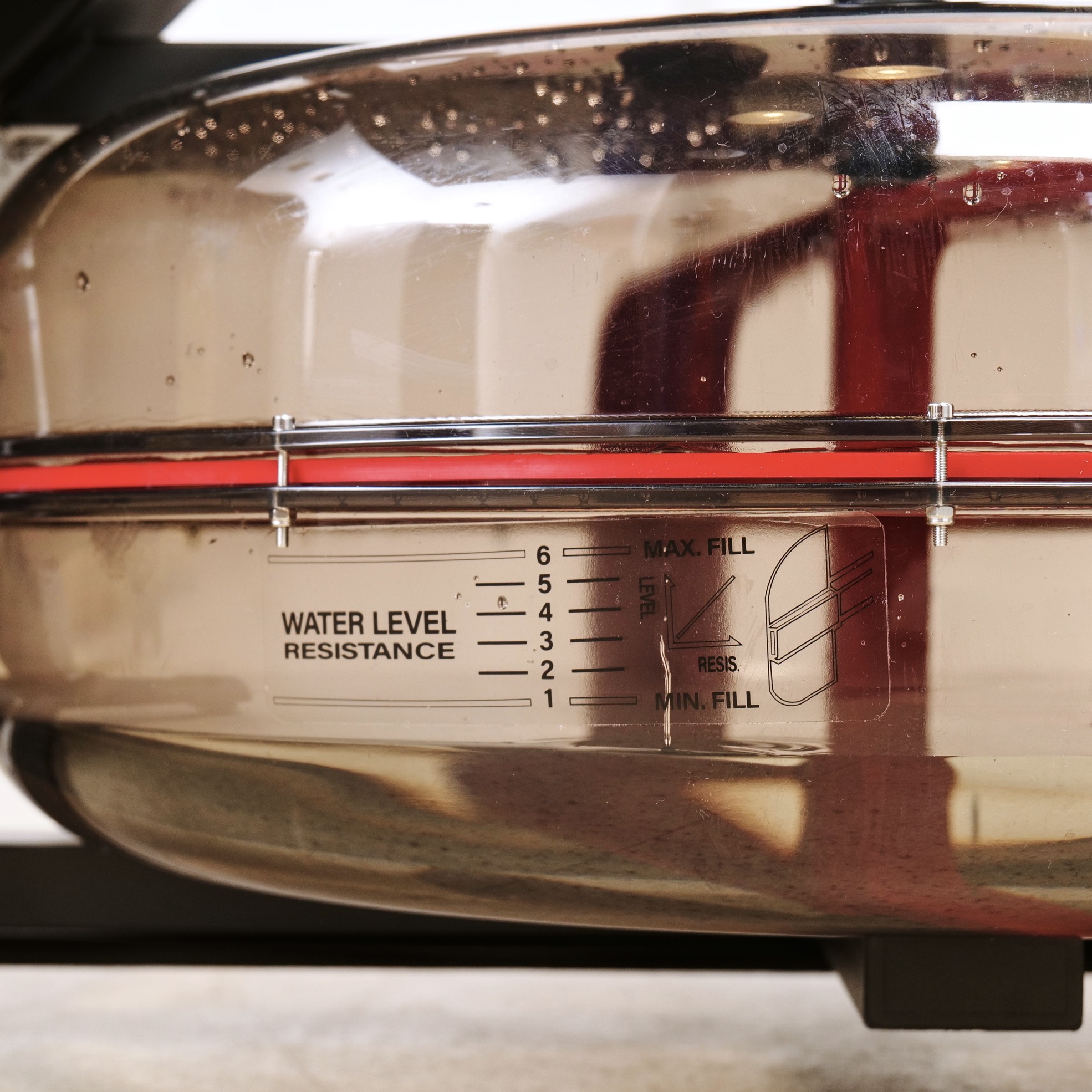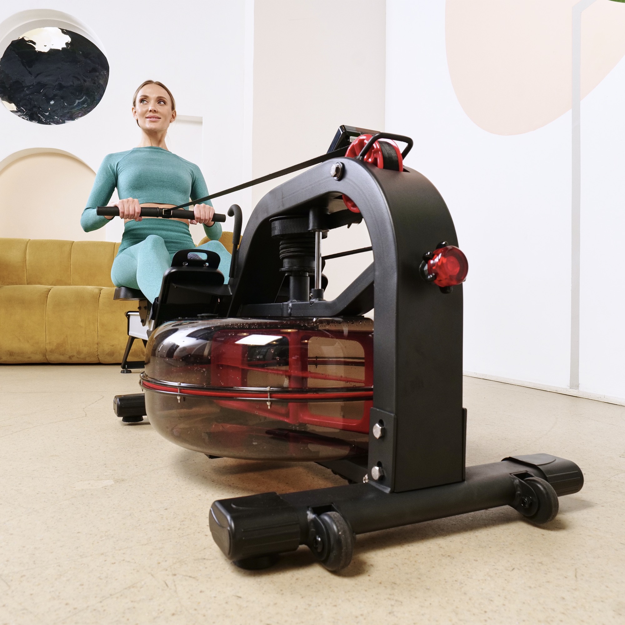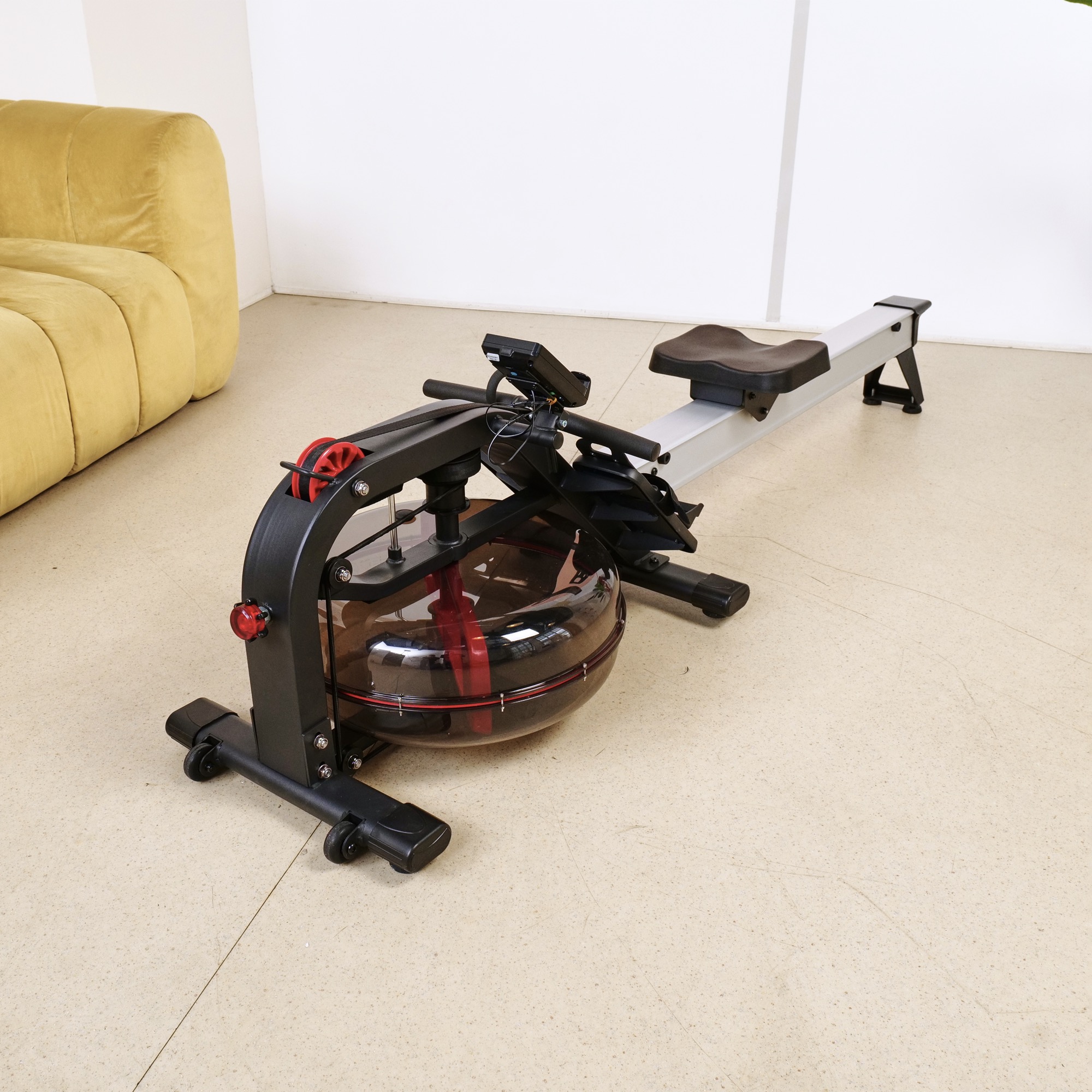 Кардиотренажёр использует водную систему нагрузки, что обеспечивает плавность хода и бесшумную работу. Транспортировочные ролики облегчают перемещение тренажёра при необходимости.