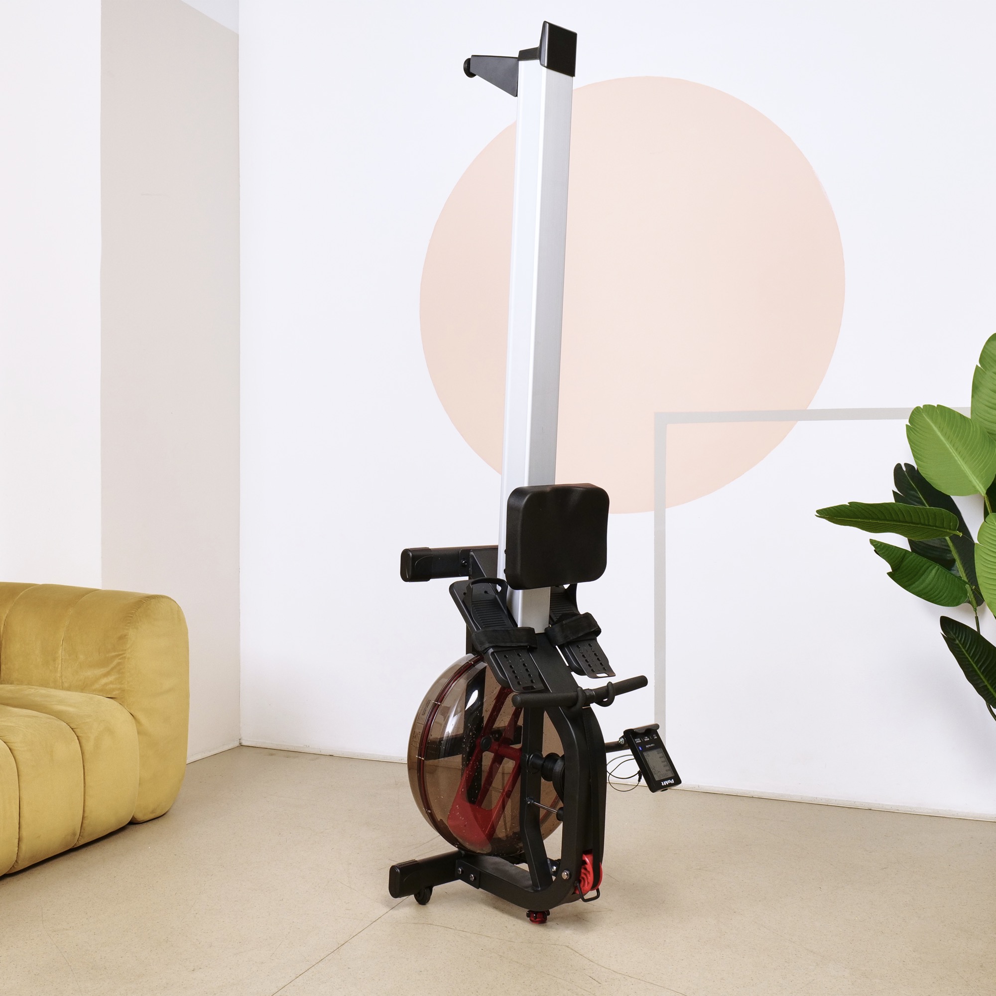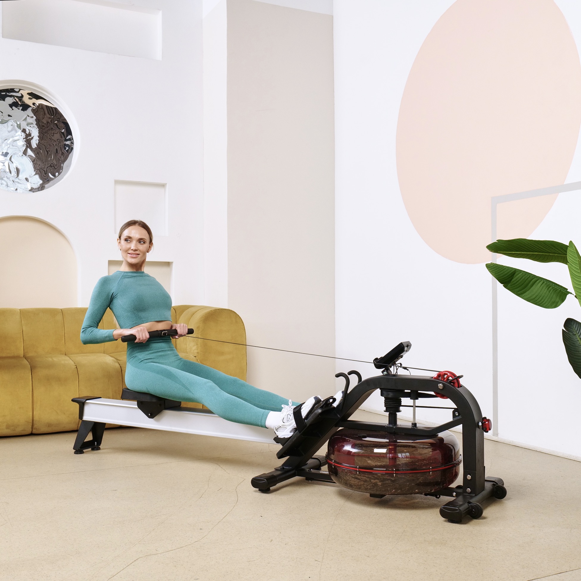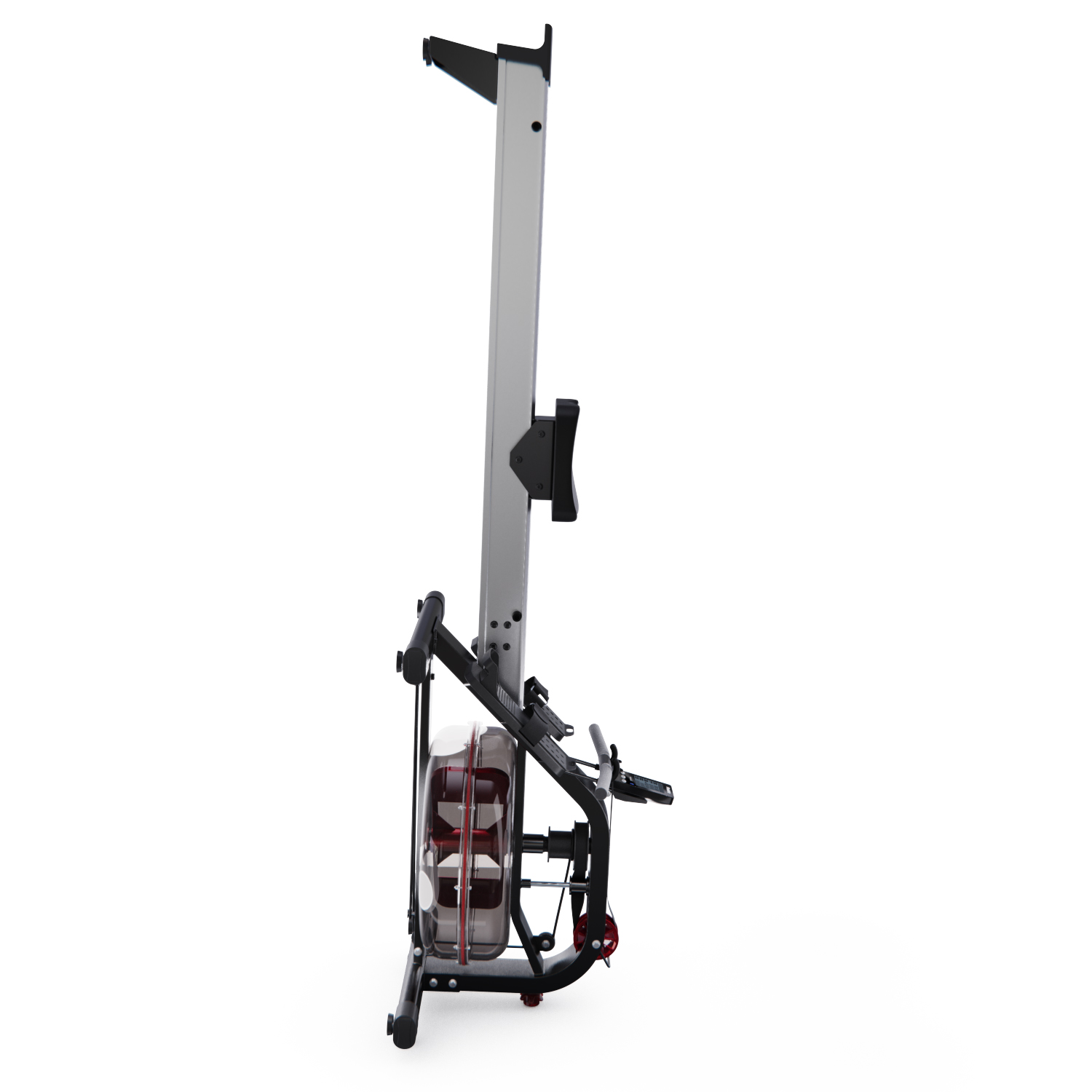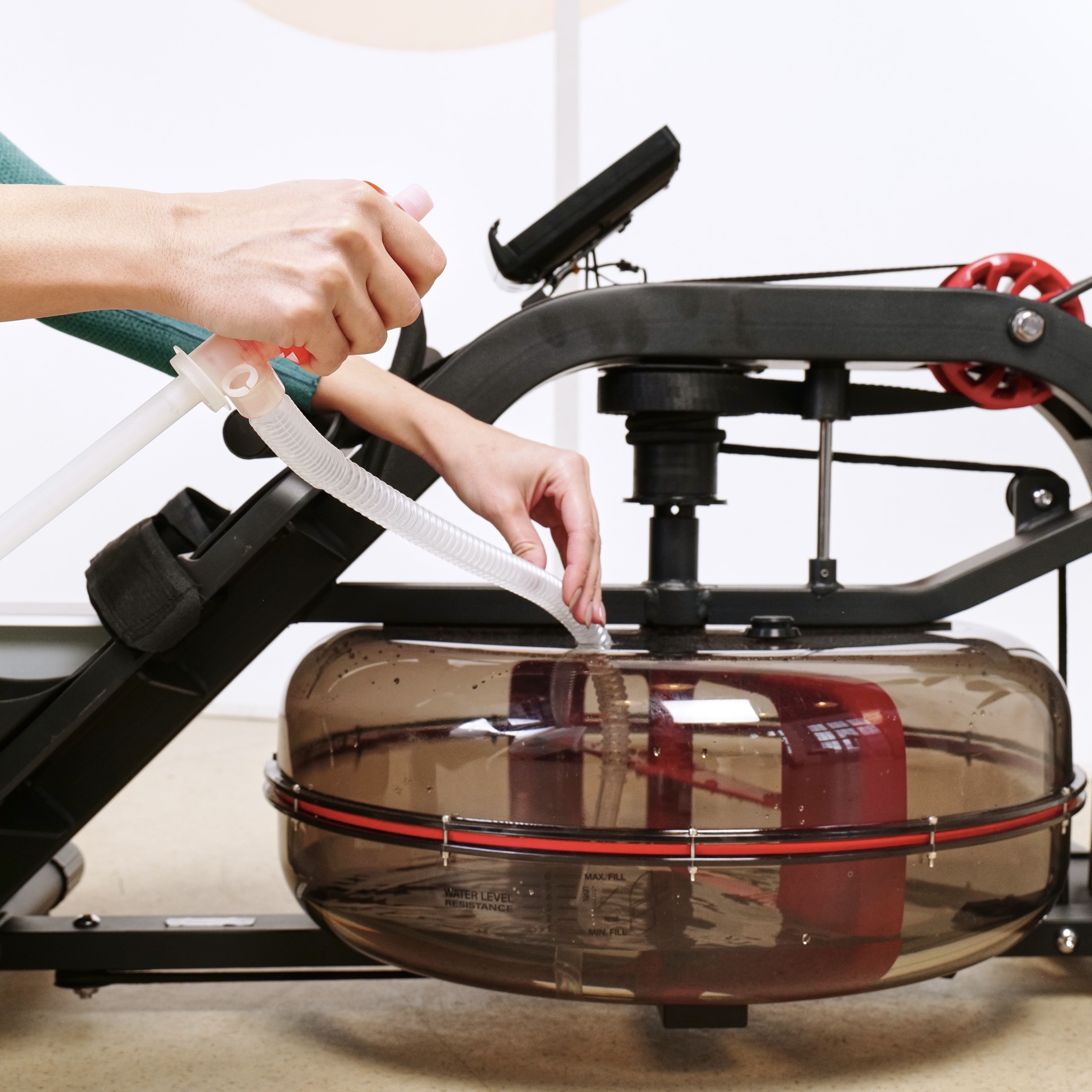Кардиотренажёр использует водную систему нагрузки, что обеспечивает плавность хода и бесшумную работу. Транспортировочные ролики облегчают перемещение тренажёра при необходимости.