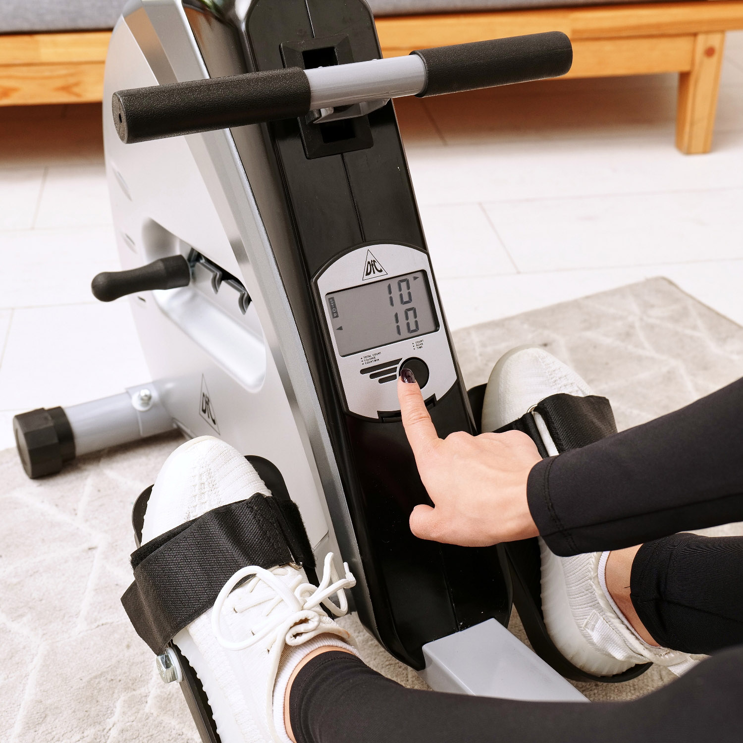 Ременная нагрузка тренажёра регулируется с помощью рукоятки на стойке. Доступно 4 уровня сопротивления, рекомендовано начинать занятия с минимального значения. Дисплей работает от двух батареек типа АА и показывает следующие параметры: скан, время, количество гребков в минуту, общее количество гребков и калории.