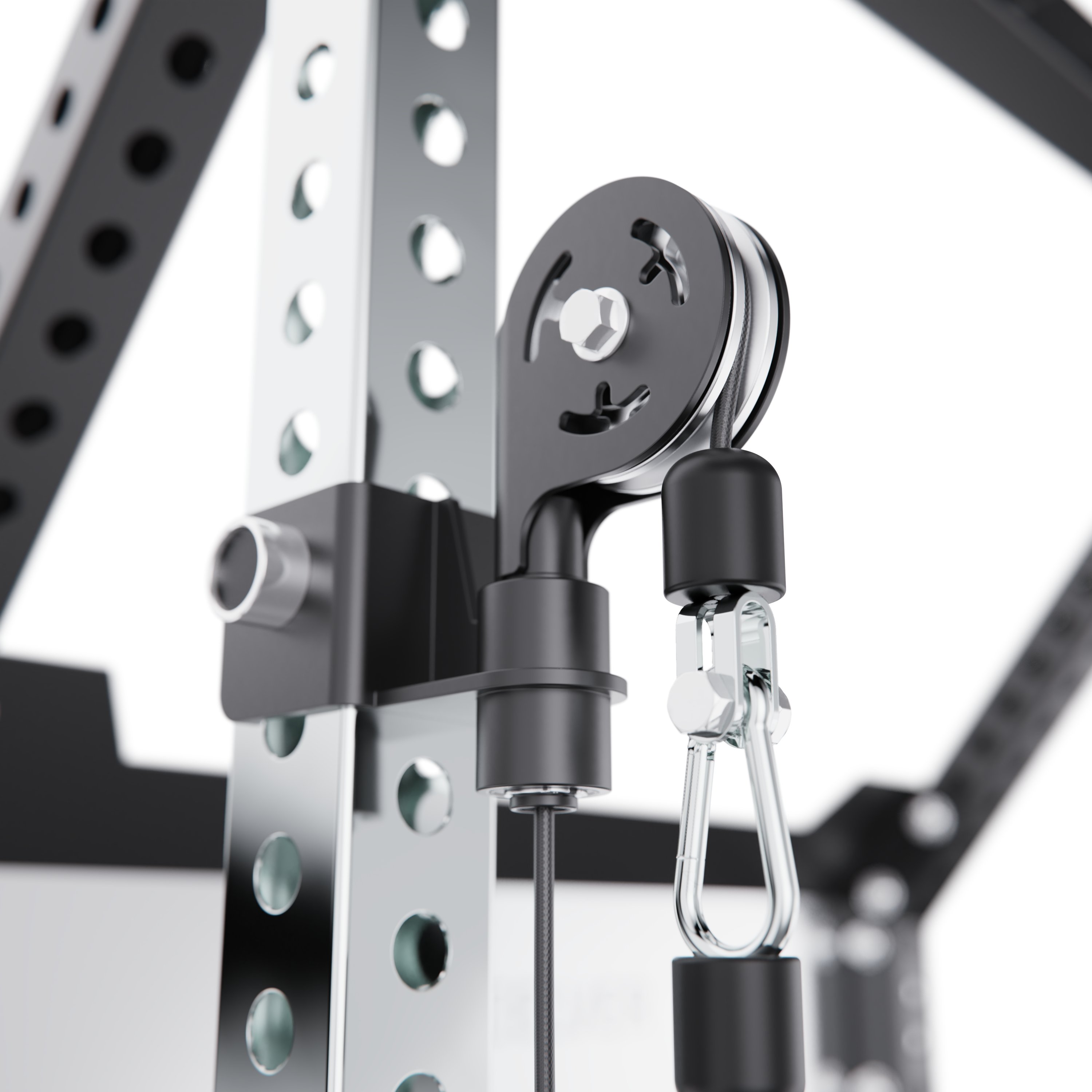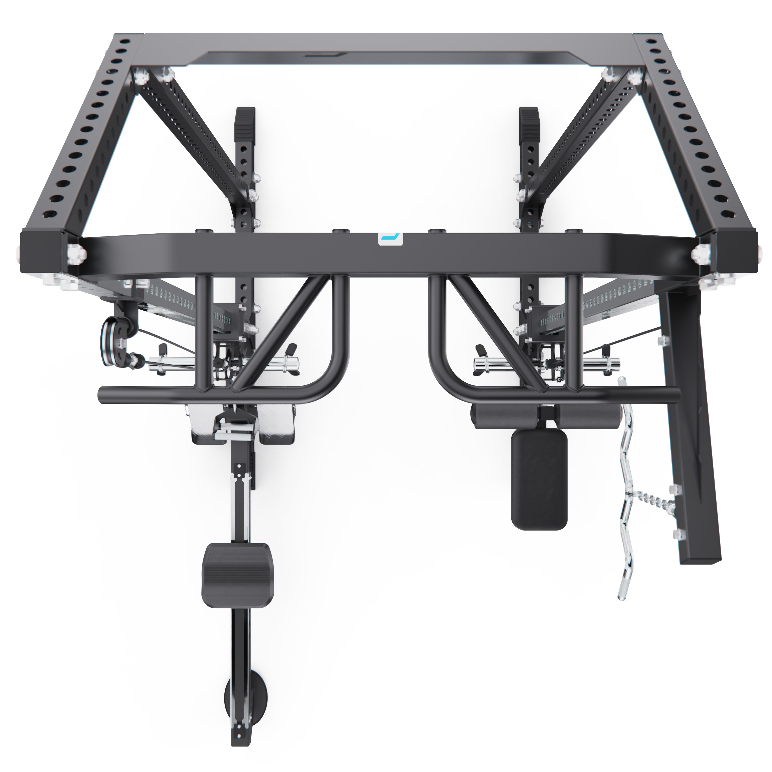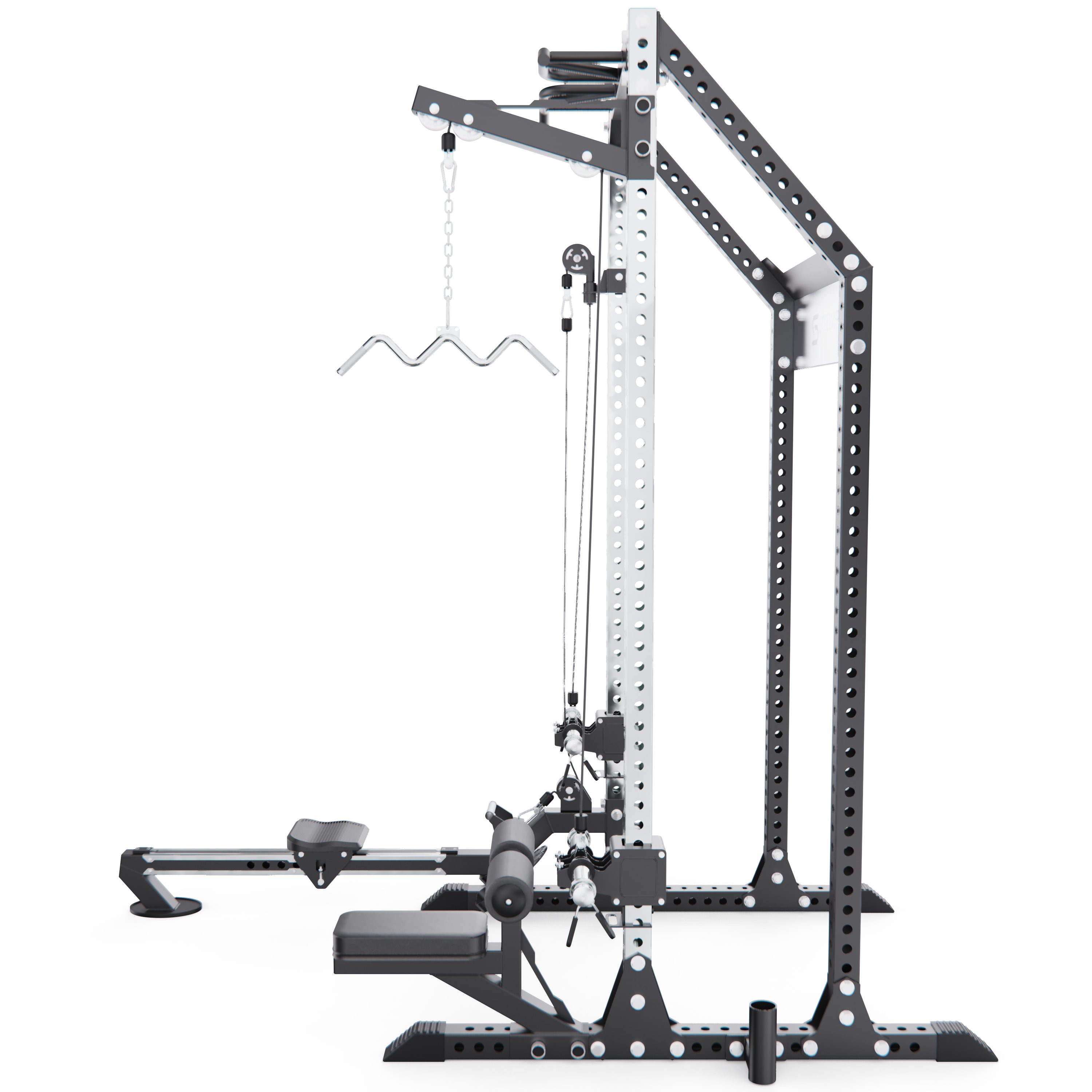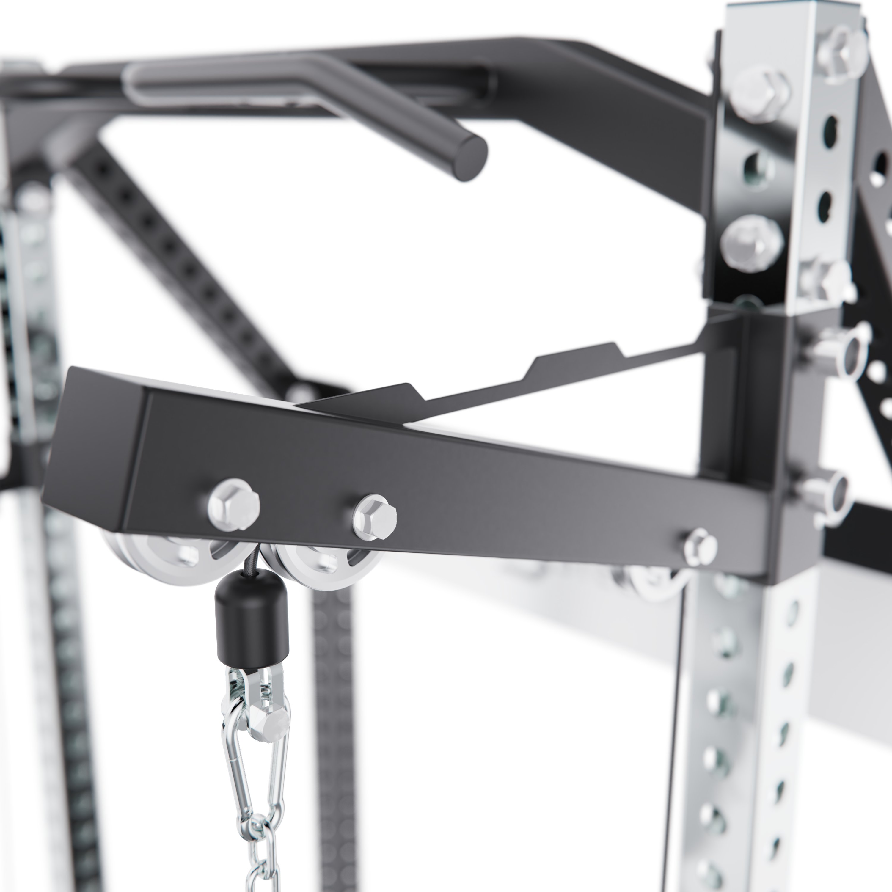 Верхняя тяга оснащена W-образной рукоятью, а многопозиционный турник позволяет выполнять различные варианты подтягиваний и упражнений на верх тела, делая тренировки более разнообразными.