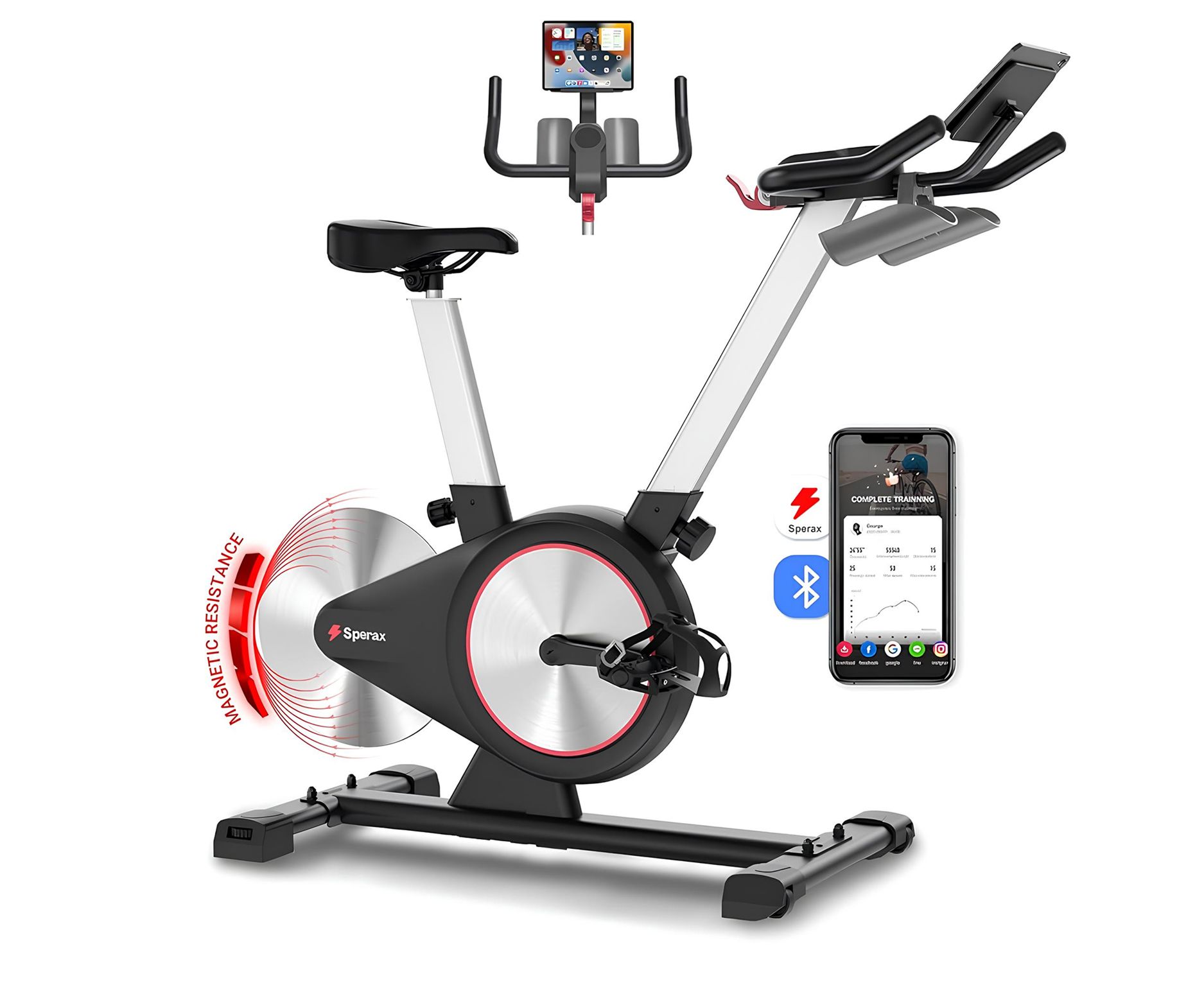 Встроенный Bluetooth-модуль позволяет синхронизировать велотренажёр с мобильным приложением Sperax, которое предлагает онлайн-курсы, персонализированные планы тренировок и статистику в реальном времени: время, частота оборотов, дистанция, калории. Установите ваше устройство на встроенную подставку для планшета, включите тренировку и наслаждайтесь процессом. Для удобства также предусмотрен держатель для бутылки.
