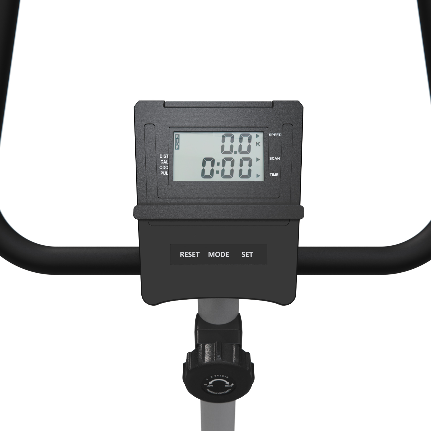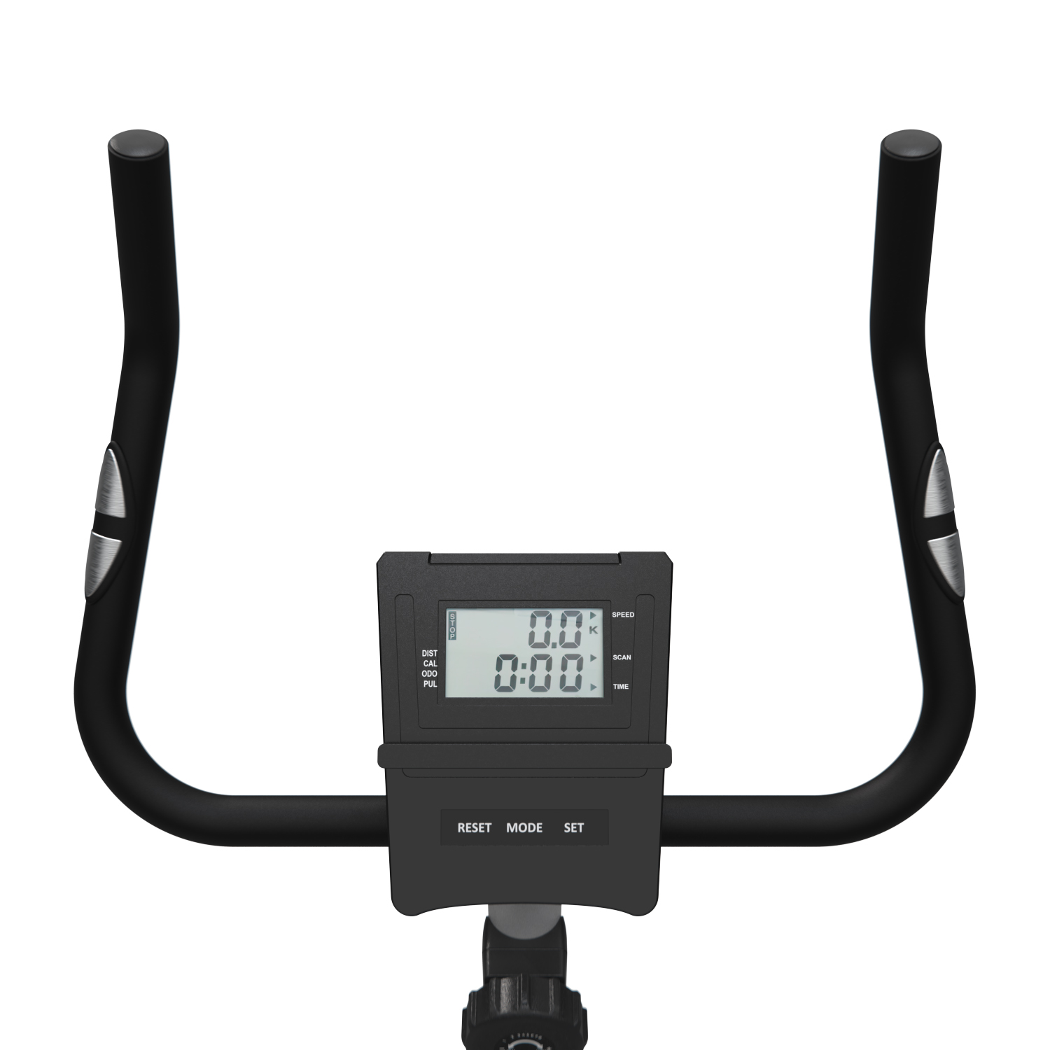 Монохромный LCD дисплей велотренажера отображает следующие показатели: скан, скорость, время, калории, пульс и расстояние. Для работы консоли требуются 2 батарейки типа ААА (не входят в комплект).