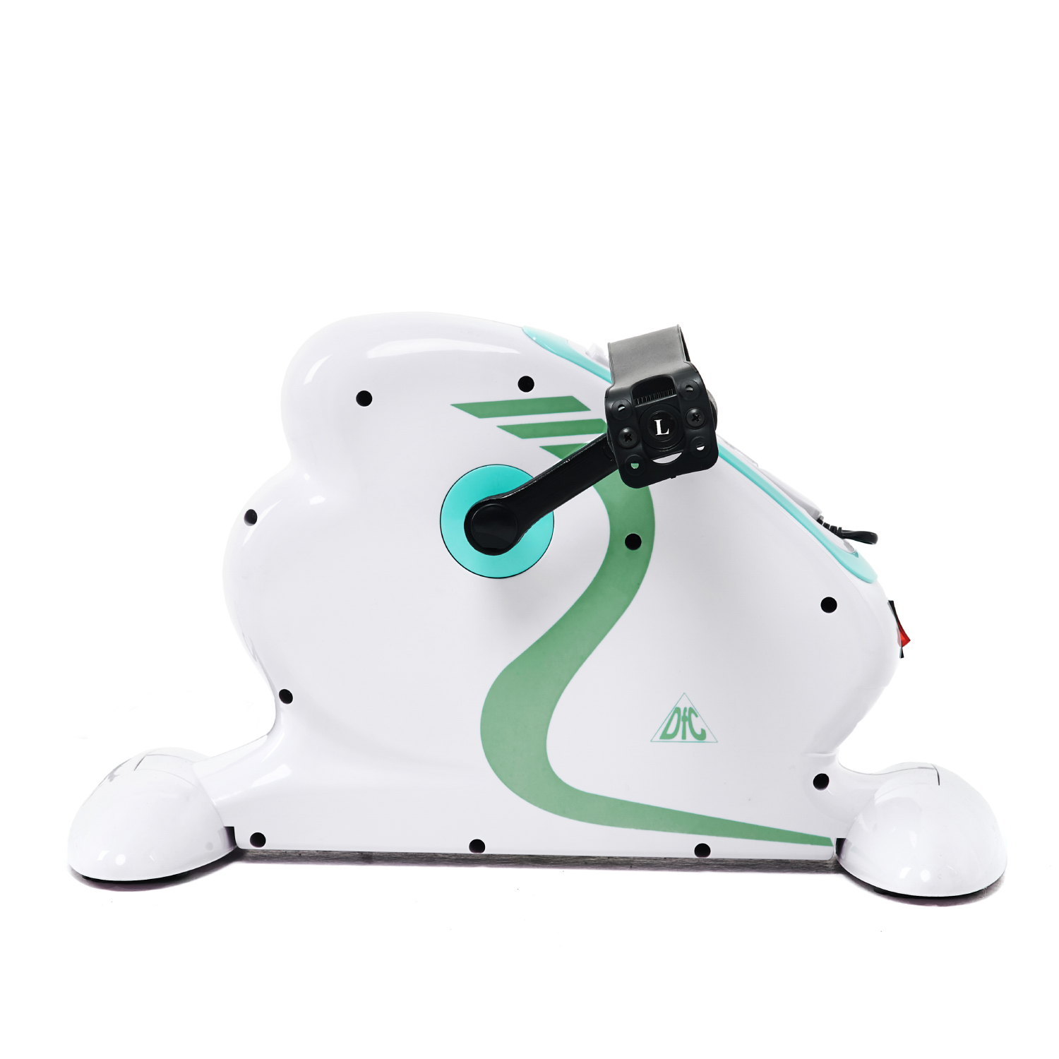 Минивелотренажёр выполнен в белом цвете с мятными вставками. Приятный, стильный дизайн не раздражает глаз и впишется в любой интерьер.