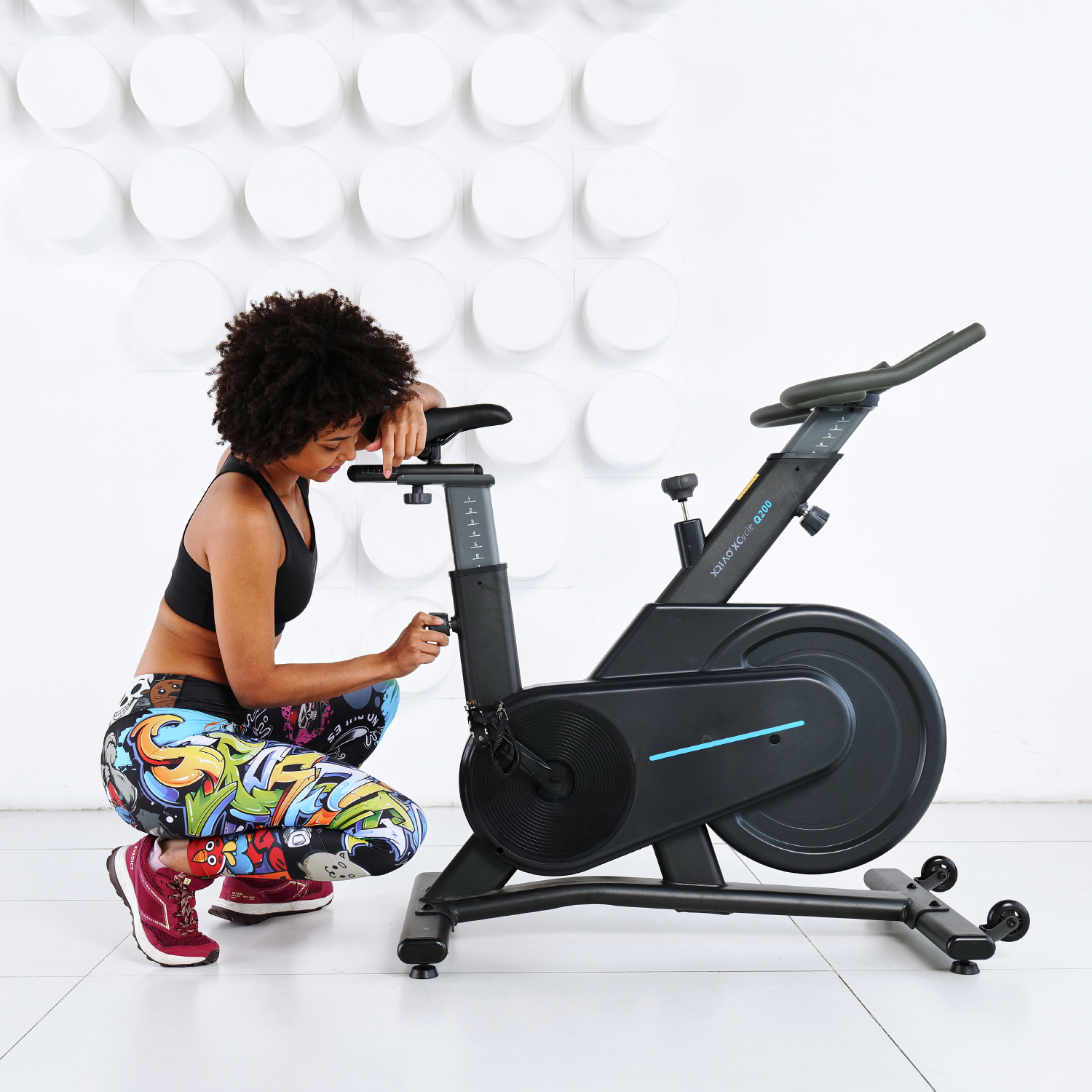 Спортивное сиденье регулируется не только по высоте и горизонтали, но и углу наклона, таким образом меняя интенсивность тренировки и положение пользователя в седле. Руль также регулируется по высоте, внося разнообразие и делая тренажёр более комфортным. Спин-байк рассчитан на пользователя весом до 130 кг.