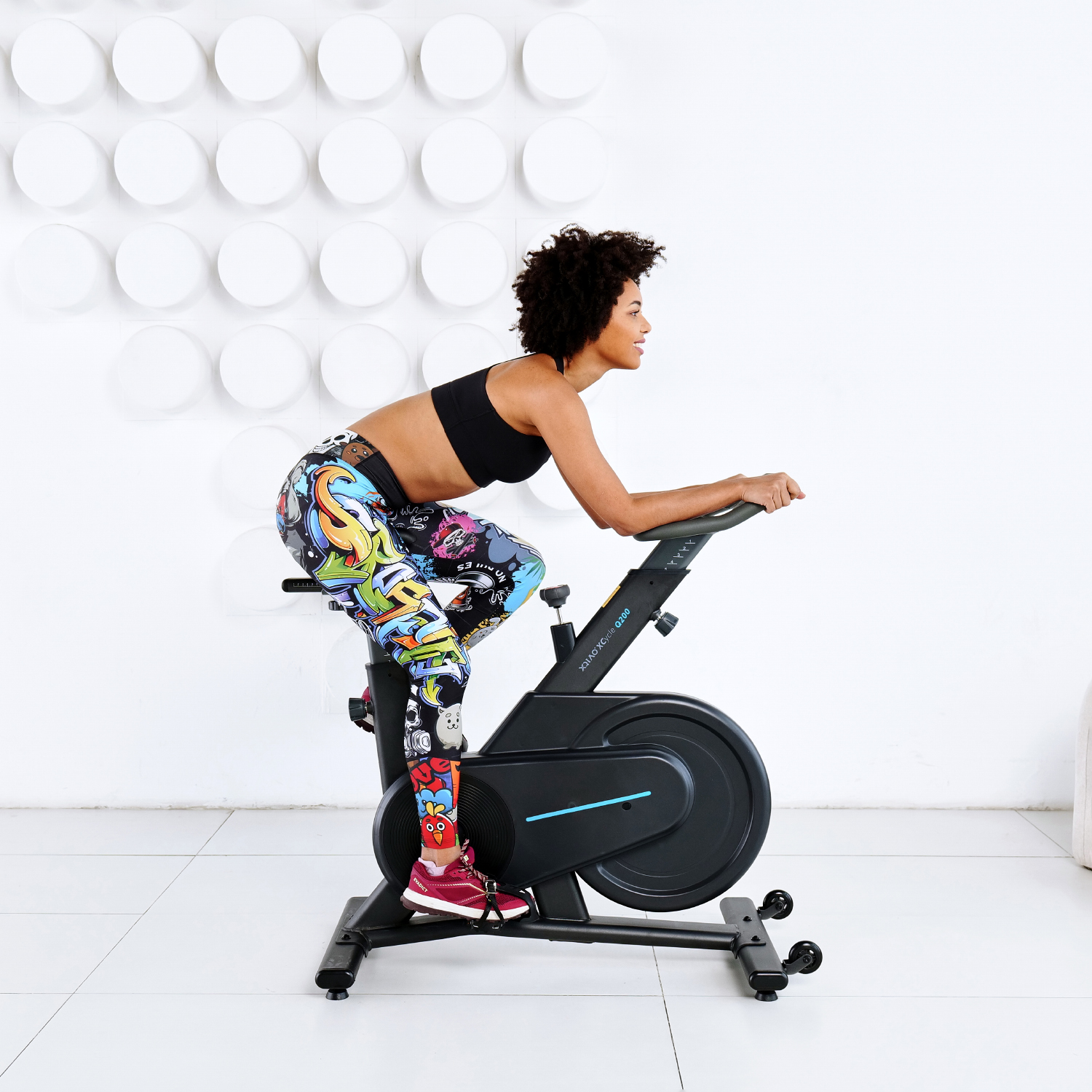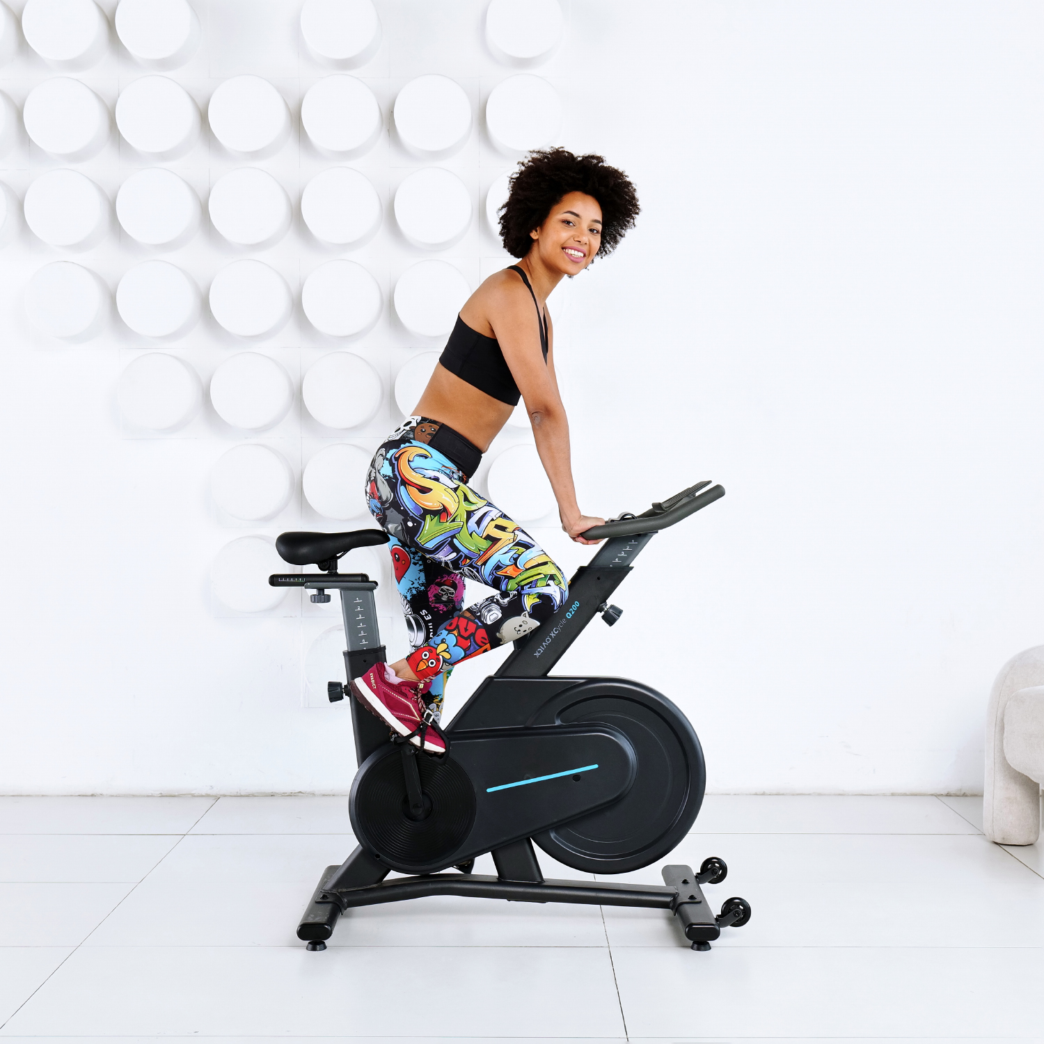 Маховик весом 15 кг обеспечит плавное вращение и регулировку нагрузки. Педали можно крутить как вперед, так и назад. Ремень вокруг маховика не превышает уровень шума до 52 дБ, что делает спин-байк OVICX Q200 идеальным выбором для домашнего использования.
