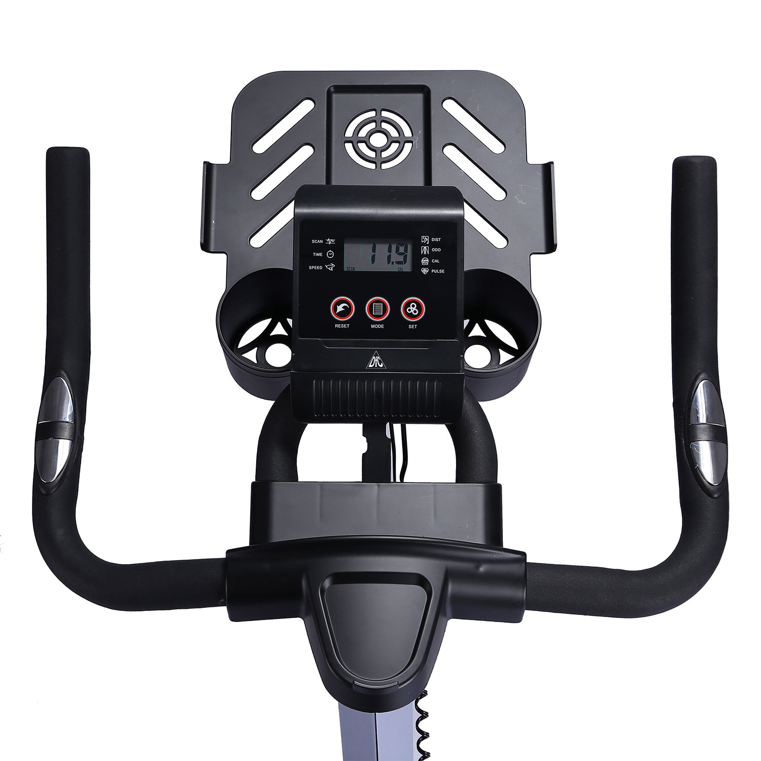 Для контроля пульса во время тренировки на руле есть встроенные датчики с отображением информации на дисплее компьютера. Питание компьютера от батареек (тип ААА, 2 шт). Показания консоли: время, скорость, расстояние, калории, пульс, ODO
