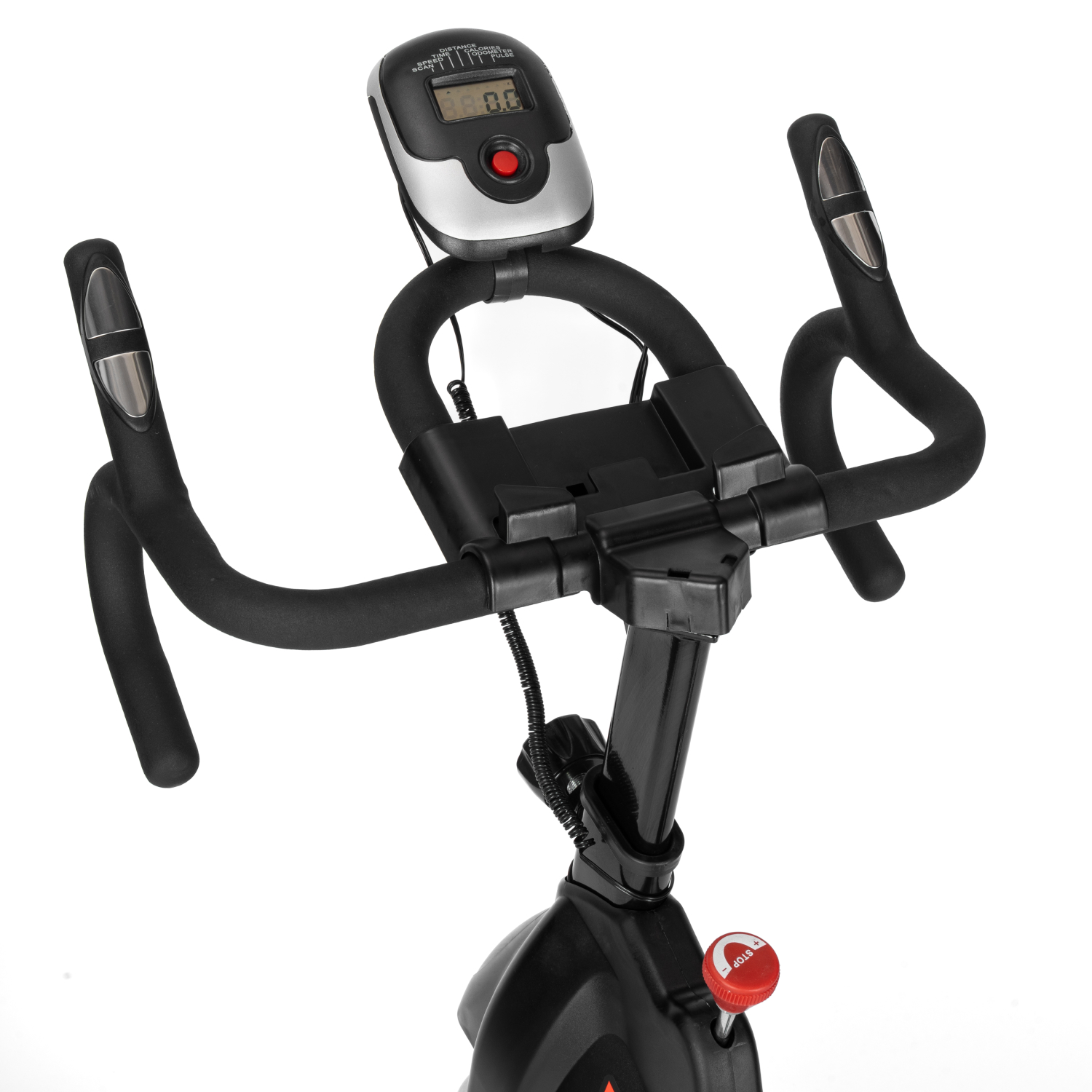 Велотренажер имеет монохромный LCD-дисплеей, который отображает ключевые параметры тренировки: время, калории, дистанцию, скорость, сканирование, общую дистанцию и пульс. Это позволит отслеживать прогресс и корректировать нагрузку в реальном времени. Для работы консоли используются две батарейки типа AAA (в комплект не входят).
