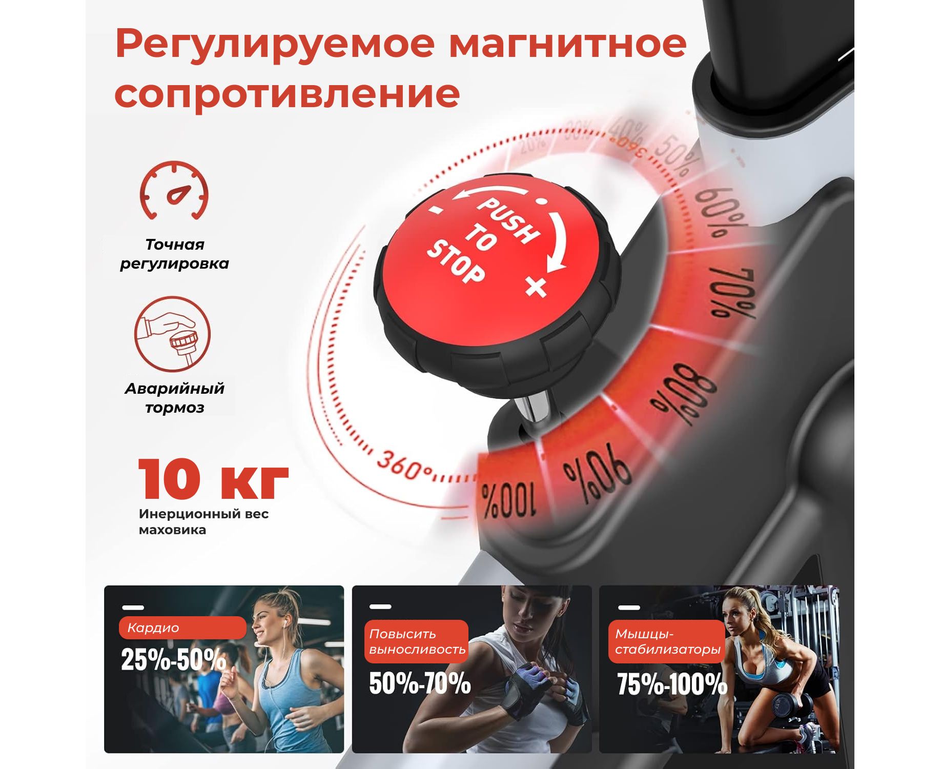 Модель рассчитана на пользователей весом до 135 кг. Тренажер оснащён магнитной системой нагрузки с инерционным весом маховика 10 кг и механической регулировкой. Благодаря бесступенчатой системе изменения сопротивления, вы можете плавно повышать или снижать уровень сложности, выбирая оптимальный режим для кардиотренировки, сжигания жира или развития выносливости.